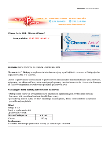 Utworzono: 2017-03-07 02:59:28 Chrom Activ 200 - 60tabs. (Chrom) Cena produktu: 15,00 PLN 10,99 PLN PRAWIDŁOWY POZIOM GLUKOZY - METABOLIZM Chrom Activ™ 200 µg to suplement diety dostarczający wysokiej ilości chromu - aż 200 µg jonów tego pierwiastka w 1 tabletce. Chrom to pierwiastek uczestniczący w prawidłowym metabolizmie makroskładników pokarmowych, wpływający na aktywność enzymów regulujących procesy metabolizmu cukrów i tłuszczów. Pomaga on także w utrzymaniu prawidłowego poziomu glukozy we krwi. Następujące fakty zostały potwierdzone naukowo: ● ● stały poziom cukru we krwi jest istotnym czynnikiem ograniczającym wydzielanie insuliny – hormonu, który nasila odkładanie tkanki tłuszczowej; prawidłowy poziom cukru we krwi zapobiega atakom głodu, dzięki czemu ułatwia utrzymanie prawidłowej wagi ciała. Skład: Porcja: 1 tab. Porcji w opakowaniu: 60 Opakowanie: 60 tab. Wartość odżywcza Chrom w 1 tab. 200 µg Dawkowanie: 1 tabletka dziennie po posiłku lub inaczej po konsultacji z lekarzem. Adres: http://www.muscle.trustnet.pl/ Telefon: 34 36 43 000, 782 010 880 Email: [email protected]