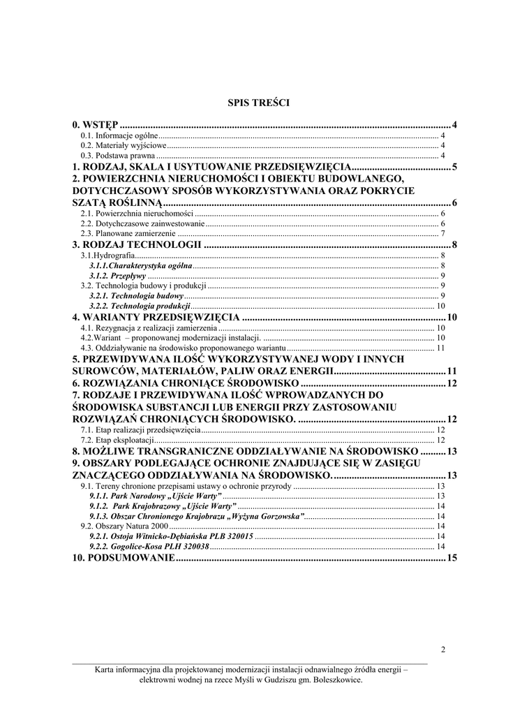SPIS TREŚCI 0. WSTĘP .................................................................................................................................. 4 0.1. Informacje ogólne ................................................................................................................................... 4 0.2. Materiały wyjściowe ............................................................................................................................... 4 0.3. Podstawa prawna .................................................................................................................................... 4 1. RODZAJ, SKALA I USYTUOWANIE PRZEDSIĘWZIĘCIA....................................... 5 2. POWIERZCHNIA NIERUCHOMOŚCI I OBIEKTU BUDOWLANEGO, DOTYCHCZASOWY SPOSÓB WYKORZYSTYWANIA ORAZ POKRYCIE SZATĄ ROŚLINNĄ ................................................................................................................. 6 2.1. Powierzchnia nieruchomości .................................................................................................................. 6 2.2. Dotychczasowe zainwestowanie ............................................................................................................. 6 2.3. Planowane zamierzenie .......................................................................................................................... 7 3. RODZAJ TECHNOLOGII ................................................................................................. 8 3.1.Hydrografia.............................................................................................................................................. 8 3.1.1.Charakterystyka ogólna ................................................................................................................... 8 3.1.2. Przepływy ........................................................................................................................................ 9 3.2. Technologia budowy i produkcji ............................................................................................................ 9 3.2.1. Technologia budowy ....................................................................................................................... 9 3.2.2. Technologia produkcji .................................................................................................................. 10 4. WARIANTY PRZEDSIĘWZIĘCIA ................................................................................ 10 4.1. Rezygnacja z realizacji zamierzenia ..................................................................................................... 10 4.2.Wariant – proponowanej modernizacji instalacji. ................................................................................ 10 4.3. Oddziaływanie na środowisko proponowanego wariantu ..................................................................... 11 5. PRZEWIDYWANA ILOŚĆ WYKORZYSTYWANEJ WODY I INNYCH SUROWCÓW, MATERIAŁÓW, PALIW ORAZ ENERGII............................................ 11 6. ROZWIĄZANIA CHRONIĄCE ŚRODOWISKO ......................................................... 12 7. RODZAJE I PRZEWIDYWANA ILOŚĆ WPROWADZANYCH DO ŚRODOWISKA SUBSTANCJI LUB ENERGII PRZY ZASTOSOWANIU ROZWIĄZAŃ CHRONIĄCYCH ŚRODOWISKO. .......................................................... 12 7.1. Etap realizacji przedsięwzięcia ............................................................................................................. 12 7.2. Etap eksploatacji................................................................................................................................... 12 8. MOŻLIWE TRANSGRANICZNE ODDZIAŁYWANIE NA ŚRODOWISKO .......... 13 9. OBSZARY PODLEGAJĄCE OCHRONIE ZNAJDUJĄCE SIĘ W ZASIĘGU ZNACZĄCEGO ODDZIAŁYWANIA NA ŚRODOWISKO. ............................................ 13 9.1. Tereny chronione przepisami ustawy o ochronie przyrody .................................................................. 13 9.1.1. Park Narodowy „Ujście Warty” ................................................................................................... 13 9.1.2. Park Krajobrazowy „Ujście Warty” ............................................................................................ 14 9.1.3. Obszar Chronionego Krajobrazu „Wyżyna Gorzowska”............................................................. 14 9.2. Obszary Natura 2000 ............................................................................................................................ 14 9.2.1. Ostoja Witnicko-Dębiańska PLB 320015 .................................................................................... 14 9.2.2. Gogolice-Kosa PLH 320038 ......................................................................................................... 14 10. PODSUMOWANIE .......................................................................................................... 15 2 ___________________________________________________________________________________ Karta informacyjna dla projektowanej modernizacji instalacji odnawialnego źródła energii – elektrowni wodnej na rzece Myśli w Gudziszu gm. Boleszkowice. ZAŁĄCZNIKI 1. Orientacja skala 1 : 12000 2. Plan sytuacyjny stopnia wodnego Gudzisz 3. Przekroje istniejących urządzeń 4. Koncepcja modernizacji – przekroj poprzeczny 5. J.w. – widok z góry 6. J.w. – model 7. Wyrys działek Lokalizacja nadbudowy 3 ___________________________________________________________________________________ Karta informacyjna dla projektowanej modernizacji instalacji odnawialnego źródła energii – elektrowni wodnej na rzece Myśli w Gudziszu gm. Boleszkowice. 0. WSTĘP 0.1. Informacje ogólne Karta informacyjna zamierzonego przedsięwzięcia polegającego na modernizacji instalacji wytwórczej odnawialnego źródła energii elektrycznej w elektrowni wodnej na rzece My