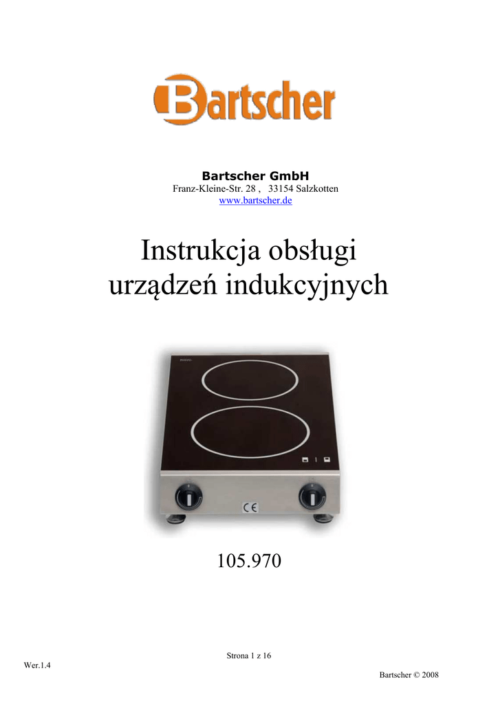 Bartscher GmbH Franz-Kleine-Str. 28 , 33154 Salzkotten www.bartscher.de Instrukcja obsługi urządzeń indukcyjnych 105.970 Strona 1 z 16 Wer.1.4 Bartscher © 2008 Spis treści Strona 1 1.1 Sprawy ogólne Zastosowanie 3 3 2 2.1 2.2 Opis produktu Produkty Dane techniczne 3 3 3 2.2.1. Obsługa i kontrola 2.2.2. Dane techniczne urządzeń 2.2.3. Warunki działania 3 4 4 Instalacja Dane elektryczne urządzeń 4 3.1.1. Urządzenia wg mocy (2,5 kW, 3 kW) 4 3.2 3.3 Wymagania instalacyjne Zalecenia instalacyjne 4 4-5 4 4.1 Uruchomienie Montaż 5 5-6 5 Test działania 7 6 6.1 Obsługa Proces gotowania 8 8 7 7.1 7.2 7.3 7.4 7.5 7.6 7.7 7.8 7.9 Przepisy dotyczące bezpieczeństwa Opis symboli ostrzegawczych Zagrożenia wynikające z nieprzestrzegania przepisów BHP Bezpieczne użytkowanie Przepisy dotyczące bezpieczeństwa personelu obsługi Niewłaściwa obsługa Zmiany / części zamienne Rozpoznawanie naczynia Nadzorowanie strefy grzewczej Emisja hałasu 9 9 9 10 10 11 11 11 11 11 8 Wyłączenie z eksploatacji 11 9 9.1 Lokalizacja / usuwanie usterek Przegląd komunikatów o błędach na wyświetlaczu 12-13 14 10 Czyszczenie 15 11 Utrzymanie 16 12 Utylizacja 16 3 3.1 Strona 2 z 16 Wer.1.4 Bartscher © 2008 1. Sprawy ogólne Niniejsza instrukcja obsługi zawiera podstawowe informacje, które należy uwzględniać podczas montażu, użytkowania i utrzymania. Przed rozpoczęciem instalacji i uruchomieniem zarówno monter, jak i personel obsługi powinni przeczytać całą instrukcję, która następnie powinna być przechowywana w pobliżu urządzenia, aby zawsze można było z niej skorzystać. 1.1 Zastosowanie Indukcyjne urządzenia do gotowania służą do przygotowywania posiłków. Mogą być stosowane do gotowania, podtrzymywania temperatury, flambirowania, grillowania itp. potraw. Uwaga, w przypadku korzystania z urządzeń indukcyjnych należy stosować specjalne naczynia. Nie należy stosować tak zwanych produktów NO-NAME. Dno naczynia musi być magnetyczne. W razie potrzeby można to sprawdzić za pomocą magnesu. 2. Opis produktu 2.1 Produkty 105.970 - Zwarta budowa modułowa - Łatwy montaż - Łatwość serwisowania - Prostota obsługi za pomocą obrotowej gałki - Zwarta elektronika mocy umożliwia łatwą i bezpieczną eksploatację - Maksymalne bezpieczeństwo eksploatacji dzięki funkcjom ochronnym i kontrolnym - Niewielkie wymiary zewnętrzne - Niewielki ciężar 2.2 Dane techniczne 2.2.1 Obsługa i kontrola Lampka „praca lub rozpoznawanie naczynia” Regulator mocy – potencjometr Wielkości 105.970 2V DC/ca. 10mA (czerwona LED) 0 Ohm – 10 kOhm S x G x W Powierzchnia Ceran 330 x 575 x 100 mm 320 x 510 x 4 mm Strona 3 z 16 Wer.1.4 Bartscher © 2008 2.2.2 Techniczne dane urządzeń Urządzenie Napięcie 105.970 1 x 230 V Moc Ciężar 3.5 kW 10,0 kg 2.2.3 Warunki działania - maks. odchyłka napięcia w sieci od znamionowego - częstotliwość - Klasa ochronności - min. średnica naczynia +5%/-10% 50/60 Hz IP 43 12 cm 3 Instalacja 3.1 Dane elektryczne urządzeń 3.1.1. Urządzenia wg mocy (3,5 kW) 1-fazowe pole indukcyjne (napięcie 230 V +5% / -10%) Przyłącze Kolor Częstotliwość Bezpiecznik Faza czarny, brązowy lub 1 50 Hz / 60 Hz 2 X 20A FF (super szybki) częstotliwość N niebieski lub 2 bezp. sterujący robocza 2 X 160mA T 22-35 kHz (zwłoczny) PE żółto/zielony Otoczenie - - maks. temperatura otoczenia przechowywanie użytkowanie maks. wilgotność względna przechowywanie użytkowanie >-20°C do +70°C >+5°C do +35°C >10% do 90% >30% do 90% 3.2 Wymagania instalacyjne Urządzenie indukcyjne należy ustawić na poziomej powierzchni. Nie wolno zakrywać otworów doprowadzania i odprowadzania powietrza. Podłoże musi mieć nośność co najmniej 40 kg. Wyłącznik sieciowy musi być łatwo dostępny. 3.3 Zalecenia instalacyjne Należy przestrzegać poniższych zaleceń: - Sprawdzić i upewnić się, że napięcie w instalacji elektrycznej ma wartość zgodną z podaną na tabliczce znamionowej. - Instalacja elektryczna musi odpowiadać lokalnym warunkom przewidzianym dla instalacji w budynkach. Należy przestrzegać przepisów SEP. - Urządzenie indukcyjne jest wyposażone w kabel sieciowy, który można podłączyć do gniazda za pomocą odpowiedniej wtyczki. Strona 4 z 16 Wer.1.4 Bartscher © 2008 - W przypadku instalacji wyłącznika przystosowany do prądu min. 30 mA. różnicowoprądowego, musi on być - Należy unikać zasłaniania stref doprowadzania i odprowadzania powietrza przez inne przedmioty (materiały, meble itd.). - Należy unikać zasysania przez urządzenia indukcyjne gorącego powietrza z otoczenia (urządzenia stoją blisko obok siebie, w pobliżu kotłów warzelnych, pieców). W innym przypadku należy zastosować kanał powietrzny. - Urządzenie indukcyjne nie może stać w pobliżu gorących powierzchni ani na nich. - Urządzenie jest wyposażone w filtr zasysający. Mimo to należy się upewnić, że znajdujące się w otoczeniu cząsteczki tłuszczu nie będą zasysane przez urządzenie indukcyjne (w pobliżu frytkownic, płyt do grillowania lub patelnie wychylnych). - Zasysane powietrze powinno mieć wartość mniejszą niż +35°C. - Personel obsługowy musi zadbać o to, aby wszelkie prace instalacyjne, konserwacyjne i inspekcyjne były przeprowadzane przez personel specjalistyczny. Przyłącze elektryczne musi odpowiadać przepisom obowiązującym w danym kraju! Uwaga! Uwaga! Niewłaściwe napięcie może spowodować uszkodzenie urządzenia indukcyjnego. Przyłącza elektryczne muszą być wykonane przez personel specjalistyczny 4 Uruchomienie 4.1 Montaż Urządzenia indukcyjne są wyposażone w kabel zasilający. Należy je podłączać do gniazda ściennego. Jeśli urządzenie nie posiada wtyczki, należy ją podłączyć zgodnie z punktem 3. Instalacje elektryczne muszą być wykonywane przez uprawnione przedsiębiorstwo z uwzględnieniem obowiązujących przepisów krajowych i lokalnych. Przedsiębiorstwa wykonujące instalacje 