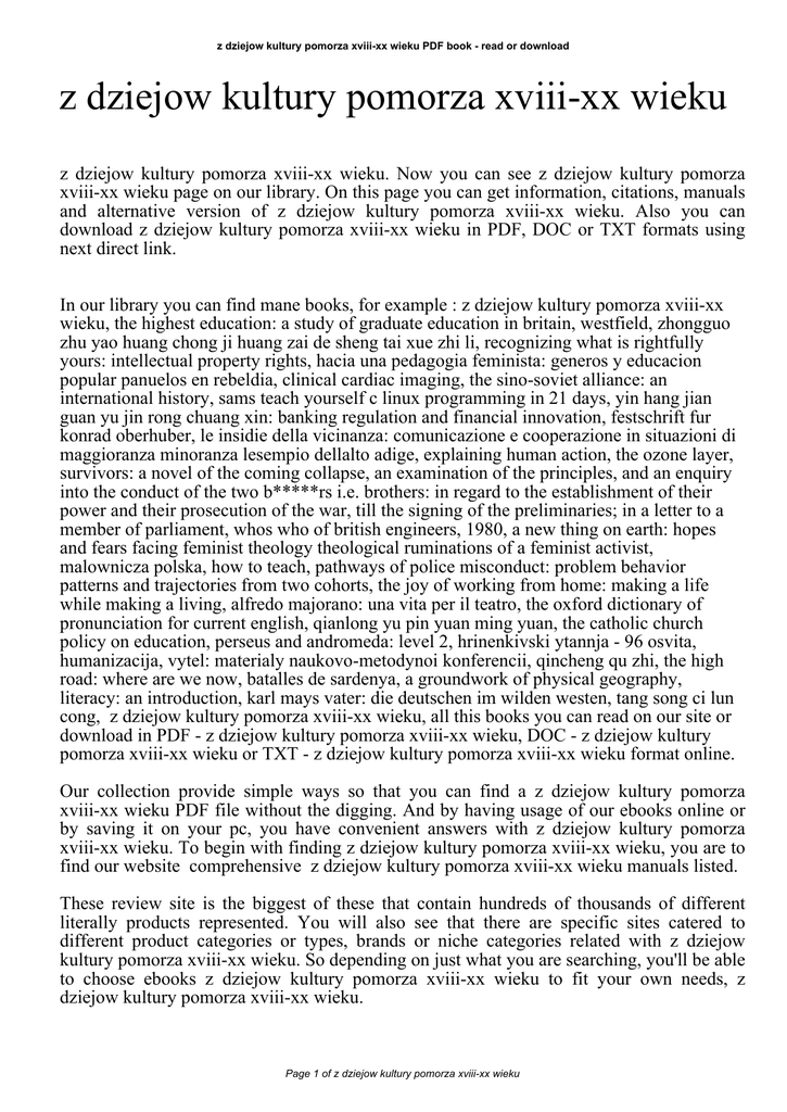 z dziejow kultury pomorza xviii-xx wieku PDF book - read or download z dziejow kultury pomorza xviii-xx wieku z dziejow kultury pomorza xviii-xx wieku. Now you can see z dziejow kultury pomorza xviii-xx wieku page on our library. On this page you can get information, citations, manuals and alternative version of z dziejow kultury pomorza xviii-xx wieku. Also you can download z dziejow kultury pomorza xviii-xx wieku in PDF, DOC or TXT formats using next direct link. In our library you can find mane books, for example : z dziejow kultury pomorza xviii-xx wieku, the highest education: a study of graduate education in britain, westfield, zhongguo zhu yao huang chong ji huang zai de sheng tai xue zhi li, recognizing what is rightfully yours: intellectual property rights, hacia una pedagogia feminista: generos y educacion popular panuelos en rebeldia, clinical cardiac imaging, the sino-soviet alliance: an international history, sams teach yourself c linux programming in 21 days, yin hang jian guan yu jin rong chuang xin: banking regulation and financial innovation, festschrift fur konrad oberhuber, le insidie della vicinanza: comunicazione e cooperazione in situazioni di maggioranza minoranza lesempio dellalto adige, explaining human action, the ozone layer, survivors: a novel of the coming collapse, an examination of the principles, and an enquiry into the conduct of the two b*****rs i.e. brothers: in regard to the establishment of their power and their prosecution of the war, till the signing of the preliminaries; in a letter to a member of parliament, whos who of british engineers, 1980, a new thing on earth: hopes and fears facing feminist theology theological ruminations of a feminist activist, malownicza polska, how to teach, pathways of police misconduct: problem behavior patterns and trajectories from two cohorts, the joy of working from home: making a life while making a living, alfredo majorano: una vita per il teatro, the oxford dictionary of pronunciation for current english, qianlong yu pin yuan ming yuan, the catholic church policy on education, perseus and andromeda: level 2, hrinenkivski ytannja - 96 osvita, humanizacija, vytel: materialy naukovo-metodynoi konferencii, qincheng qu zhi, the high road: where are we now, batalles de sardenya, a groundwork of physical geography, literacy: an introduction, karl mays vater: die deutschen im wilden westen, tang song ci lun cong, z dziejow kultury pomorza xviii-xx wieku, all this books you can read on our site or download in PDF - z dziejow kultury pomorza xviii-xx wieku, DOC - z dziejow kultury pomorza xviii-xx wieku or TXT - z dziejow kultury pomorza xviii-xx wieku format online. Our collection provide simple ways so that you can find a z dziejow kultury pomorza xviii-xx wieku PDF file without the digging. And by having usage of our ebooks online or by saving it on your pc, you have convenient answers with z dziejow kultury pomorza xviii-xx wieku. To begin with finding z dziejow kultury pomorza xviii-xx wieku, you are to find our website comprehensive z dziejow kultury pomorza xviii-xx wieku manuals listed. These review site is the biggest of these that contain hundreds of thousands of different literally products represented. You will also see that there are specific sites catered to different product categories or types, brands or niche categories related with z dziejow kultury pomorza xviii-xx wieku. So depending on just what you are searching, you'll be able to choose ebooks z dziejow kultury pomorza xviii-xx wieku to fit your own needs, z dziejow kultury pomorza xviii-xx wieku. Page 1 of z dziejow kultury pomorza xviii-xx wieku