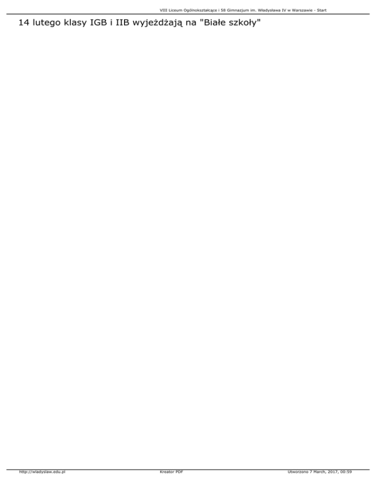 VIII Liceum Ogólnokształcące i 58 Gimnazjum im. Władysława IV w Warszawie - Start 14 lutego klasy IGB i IIB wyjeżdżają na "Białe szkoły" http://wladyslaw.edu.pl Kreator PDF Utworzono 7 March, 2017, 00:59