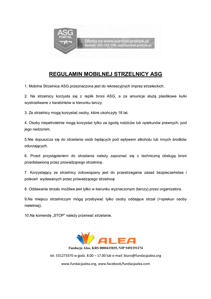 REGULAMIN MOBILNEJ STRZELNICY ASG 1. Mobilna Strzelnica ASG przeznaczona jest do rekreacyjnych imprez strzeleckich. 2. Na strzelnicy korzysta się z replik broni ASG, a za amunicje służą plastikowe kulki wystrzeliwane z karabinków w kierunku tarczy. 3. Ze strzelnicy mogą korzystać osoby, które ukończyły 18 lat. 4. Osoby niepełnoletnie mogą korzystać tylko za zgodą rodziców lub opiekunów prawnych, pod jego nadzorem. 5.Nie dopuszcza się do strzelania osób będących pod wpływem alkoholu lub innych środków odurzających. 6. Przed przystąpieniem do strzelania należy zapoznać się z techniczną obsługą broni przedstawioną przez prowadzącego strzelnicę. 7. Korzystający ze strzelnicy zobowiązany jest do przestrzegania zasad bezpieczeństwa i poleceń wydawanych przez prowadzącego strzelnicę 8. Oddawanie strzału możliwe jest tylko w kierunku wyznaczonym (tarczy) przez organizatora. 9.Na miejscu strzelniczym mogą przebywać tylko osoby oddające strzał (+opiekun osoby nieletniej). 10.Na komendę „STOP” należy przerwać strzelanie. Fundacja Alea, KRS 0000415835, NIP 9492191274 tel. 531273370 w godz. 8.00 – 17.00 lub e-mail: [email protected] www.fundacjaalea.org, www.facebook/fundacjaalea.com 11. Obowiązkowo należy przestrzegać porządku i zasad bezpieczeństwa na miejscu i w pobliżu strzelnicy ASG. 12. Organizator nie ponosi żadnej odpowiedzialność za ewentualne wypadki wynikające z nieprawidłowego posługiwania się karabinkiem, wobec strzelającego ani osób trzecich, które mogą ucierpieć w wyniku użytkowania karabinka przez strzelającego tym samym, strzelający ponosi pełną odpowiedzialność za dokonany strzał. 13. Wykupienie biletu jest jednoznaczne z zapoznaniem się z regulaminem i akceptacją go w całość. Jednolity tekst regulaminu wchodzi w życie z dniem 01.06.2015. Copyright © Fundacja Alea Fundacja Alea, KRS 0000415835, NIP 9492191274 tel. 531273370 w godz. 8.00 – 17.00 lub e-mail: [email protected] www.fundacjaalea.org, www.facebook/fundacjaalea.com
