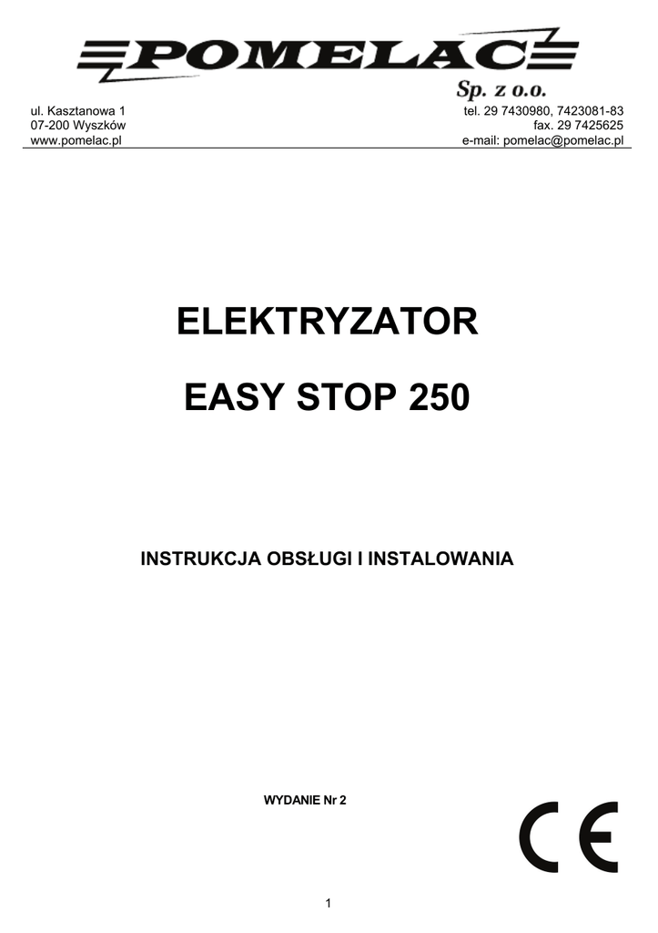 ul. Kasztanowa 1 07-200 Wyszków www.pomelac.pl tel. 29 7430980, 7423081-83 fax. 29 7425625 e-mail: [email protected] ELEKTRYCZNE OGRODZENIA PASTWISK ELEKTRYZATOR EASY STOP 250 INSTRUKCJA OBSŁUGI I INSTALOWANIA WYDANIE Nr 2 1 DEKLARACJA ZGODNOŚCI WE My "POMELAC" Sp. z o. o. 07 – 200 WYSZKÓW, UL. KASZTANOWA 1 Deklarujemy, że produkt: Elektryzator EASYSTOP 250 do którego odnosi się niniejsza deklaracja, spełnia wymagania: Dyrektywy 2001/95/WE Ogólne bezpieczeństwo produktów Dyrektywy 2006/95/WE Urządzenia elektryczne niskonapięciowe W celu uzupełnienia odpowiednich wymogów bezpieczeństwa, zdrowia i ochrony środowiska, zawartych w Dyrektywie 2006/95/WE uwzględnione są następujące normy zharmonizowane PN-EN 60335-1;2004 z późniejszymi zmianami oraz PN-EN 30335-2-76;2008 z późniejszymi zmianami Niniejsza deklaracja zgodności traci swą ważność, jeśli produkt zostanie zmieniony lub przebudowany bez naszej zgody. Wyszków, lipiec 2011 r. Dyrektor Paweł Trzciński Elektryzator EASY STOP 250 przebadano w: Laboratorium Badawczym Elektryki Rolniczej Instytutu Technologiczno-Przyrodniczego w Warszawie pod względem bezpieczeństwa użytkowania i odporności na zakłócenia elektromagnetyczne. SPIS TREŚCI 1. 2. 3. 4. 5. Wstęp Przeznaczenie ogrodzenia elektrycznego z elektryzatorem EASYSTOP 250 Warunki bezpiecznej eksploatacji elektryzatora EASY STOP 250 Warunki bezpiecznej eksploatacji ogrodzenia zasilanych elektryzatorem EASYSTOP 250 Ryzyko szczątkowe 5,1. Opis ryzyka resztkowego 5,2. Ocena ryzyka resztkowego 6. Znaki i napisy bezpieczeństwa 7. Zalety stosowania ogrodzeń zasilanych elektryzatorami 8. Charakterystyka techniczna 9. Instalowanie ogrodzenia zasilanego elektryzatorem 9,1. Wykonanie planu ogrodzenia z podziałem na kwatery, ustalenie obszaru pastwiska 9.2. Ustalenie liczby słupków i izolatorów w ogrodzeniu elektrycznym, dobór przewodów oraz wysokości zawieszenia przewodów 9.2,1. Izolatory 9.2.2. Słupki ogrodzeniowe 9.2.3. Przewody ogrodzeniowe 9,2.4. Uziemienie 9.3. Instalowanie elektryzatora 9.3.1. Zasilanie elektryzatora EASYSTOP 250 z baterii lub akumulatora 9.4. Przyłączenie elektryzatora do linii ogrodzenia 9.5. Ochrona przed wyładowaniami atmosferycznymi. 9.6. Sprawdzenie skuteczności działania ogrodzenia elektrycznego 10. Nieprawidłowości w działaniu ogrodzeń zasilanych elektryzatorami 11. Naprawa elektryzatora 12. Demontaż i kasacja 13. Warunki udzielania gwarancji Ewidencja napraw Karta gwarancyjna 2 3 3 3 4 5 5 5 5 6 6 7 7 8 8 8 9 9 9 9 11 12 13 13 13 14 14 15 16 1. WSTĘP Niniejsza instrukcja obsługi jest istotną częścią składową wyrobu. Przed przystąpieniem do eksploatacji elektryzatora nabywca zobowiązany jest zapoznać się z instrukcją obsługi, która w sposób przejrzysty ukazuje wszystkie zagadnienia związane z prawidłowym użytkowaniem i obsługą elektryzatora. Stosowanie się do zaleceń producenta zawartych w niniejszej instrukcji gwarantuje użytkownikowi pełną satysfakcję z eksploatacji elektryzatora. W przypadku trudności w zrozumieniu instrukcji zwrócić się należy o wyjaśnienia do producenta. I TŁUSTYM DRUKIEM WAŻNE INFORMACJE OZNACZONE SĄ ZNAKIEM 2. PRZEZNACZENIE OGRODZENIA ELEKTRYCZNEGO Z ELEKTRYZATOREM EASY STOP 250 Elektryzator EASYSTOP 250 stanowi źródło impulsów elektrycznych zasilających ogrodzenie elektryczne. Ogrodzenie przeznaczone jest do wypasu kwaterowego bydła, ochrony upraw polowych i leśnych przed zniszczeniem przez zwierzęta. Elektryzator może służyć do zasilania treserów elektrycznych instalowanych w oborach hodowlanych. W celu podniesienia wydajności pastwiska należy stosować dawkowany system wypasu, który polega na kolejnym wypasaniu poszczególnych części pastwiska, co zapewnia zwierzętom stale świeżą, nie wydeptaną i niezniszczoną trawę oraz umożliwia przeprowadzenie koniecznych zabiegów pielęgnacyjnych na nieużywanych aktualnie częściach pastwiska. Działanie ogrodzenia elektrycznego polega na wywołaniu u zwierząt krótkotrwałego uczucia bólu w wyniku przepływu przez ich ciało prądu elektrycznego w momencie zetknięcia się z przewodami ogrodzenia. Następuje wówczas odruchowe cofnięcie się zwierząt od ogrodzenia. Po kilku zetknięciach zwierzęta unikają kontaktów z przewodami ogrodzenia. Impulsy prądu, pomimo wysokiego napięcia, nie stanowią zagrożenia dla zdrowia i życia pod warunkiem przestrzegania zasad bezpiecznej eksploatacji. 3. WARUNKI BEZPIECZNEJ EKSPLOATACJI ELEKTRYZATORA EASY STOP 250. - Źródłem impulsów elektrycznych w linii ogrodzenia elektrycznego może być wyłącznie elektryzator wykonany fabrycznie. Zabrania się przyłączania linii ogrodzenia do innych źródeł prądu. - Elektryzator powinien być zainstalowany i tak działać, aby nie stanowił zagrożenia dla osób, zwierząt lub ich otoczenia. - Elektryzator zasilający ogrodzenie elektryczne nie może być instalowany wewnątrz budynków mieszkalnych, inwentarskich, stodół, itp. - W czasie burzy należy wyłączyć elektryzator, a linia ogrodzenia elektrycznego powinna być uziemiona. - W okresie, w którym pastwisko z ogrodzeniem nie jest eksploatowane, np. w nocy, elektryzator powinien być wyłączony, a linia ogrodzenia uziemiona. - Między uziomem elektryzatora i dowolnym innym systemem uziemiającym, takim jak system ochrony linii zasilającej lub system uziemiający telekomunikacyjny, powinna być zachowana odległość co najmniej 10m. - Elektryzator EASY STOP 250 powinien być zasilany za pośrednictwem baterii 6AS6 o napięciu 9V=. Elektryzator ECOSTOP można również zasilać z akumulatora o napięciu 12V= pamiętając o tym, że akumulator należy okresowo doładowywać. - Zabrania się używania zasilacza elektryzatora do innych celów niż zasilanie elektryzatora. Jest zaprojektowany specjalnie do zasilania elektryzatora. Jego wykorzystanie do innych celów i powstałe z tego powodu uszkodzenie może w konsekwencji wy