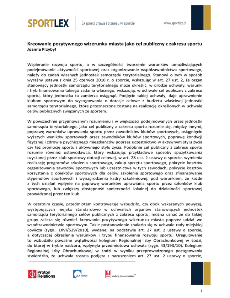Kreowanie pozytywnego wizerunku miasta jako cel publiczny z zakresu sportu Joanna Przybył Wspieranie rozwoju sportu, a w szczególności tworzenie warunków umożliwiających podejmowanie aktywności sportowej oraz organizowanie współzawodnictwa sportowego, należy do zadań własnych jednostek samorządu terytorialnego. Stanowi o tym w sposób wyraźny ustawa z dnia 25 czerwca 2010 r. o sporcie, wskazując w art. 27 ust. 2, że organ stanowiący jednostki samorządu terytorialnego może określić, w drodze uchwały, warunki i tryb finansowania takiego zadania własnego, wskazując w uchwale cel publiczny z zakresu sportu, który jednostka ta zamierza osiągnąć. Podjęcie takiej uchwały, daje uprawnienie klubom sportowym do występowania o dotacje celowe z budżetu właściwej jednostki samorządu terytorialnego, które przeznaczone zostaną na realizację określonych w uchwale celów publicznych związanych ze sportem. W powszechnie przyjmowanym rozumieniu i w większości podejmowanych przez jednostki samorządu terytorialnego, jako cel publiczny z zakresu sportu rozumie się, między innymi, poprawę warunków uprawiania sportu przez zawodników klubów sportowych, osiągnięcie wyższych wyników sportowych przez zawodników klubów sportowych, poprawę kondycji fizycznej i zdrowia psychicznego mieszkańców poprzez uczestnictwo w aktywnym stylu życia czy też promocję sportu i aktywnego stylu życia. Podobnie cel publiczny z zakresu sportu rozumie również ustawodawca, który wskazując przykładowe sposoby spożytkowania uzyskanej przez klub sportowy dotacji celowej, w art. 28 ust. 2 ustawy o sporcie, wymienia realizację programów szkolenia sportowego, zakup sprzętu sportowego, pokrycie kosztów organizowania zawodów sportowych lub uczestnictwa w tych zawodach, pokrycie kosztów korzystania z obiektów sportowych dla celów szkolenia sportowego oraz sfinansowanie stypendiów sportowych i wynagrodzenia kadry szkoleniowej, pod warunkiem, że każde z tych działań wpłynie na poprawę warunków uprawiania sportu przez członków klub sportowego, lub zwiększy dostępność społeczności lokalnej do działalności sportowej prowadzonej przez ten klub. W ostatnim czasie, przedmiotem kontrowersje wzbudziło, czy obok wskazanych powyżej, występujących niejako standardowo w uchwałach organów stanowiących jednostek samorządu terytorialnego celów publicznych z zakresu sportu, można uznać że do takiej grupy zalicza się również kreowanie pozytywnego wizerunku miasta poprzez udział we współzawodnictwie sportowym. Takie postanowienie znalazło się w uchwale rady miejskiej Łowicza (sygn.. LXVI/529/2010), wydanej na podstawie art. 27 ust. 2 ustawy o sporcie, a dotyczącej określenia warunków i trybu finansowania rozwoju sportu. Uregulowanie to wzbudziło poważne wątpliwości kolegium Regionalnej Izby Obrachunkowej w Łodzi, do której w trybie nadzoru, wpłynęła przedmiotowa uchwała (sygn. 43/193/10). Kolegium Regionalnej Izby Obrachunkowej w Łodzi w wyniku przeprowadzonego postępowania stwierdziło, że uchwała została podjęta z naruszeniem art. 27 ust. 2 ustawy o sporcie, 1 bowiem nie można uznać by kreowanie pozytywnego wizerunku miasta mogło służyć realizacji celu publicznego z zakresu sportu. W uzasadnieniu wskazano, że sport zdefiniowany został w ustawie o sporcie jako "wszelkie formy aktywności fizycznej, które poprzez uczestnictwo doraźne lub zorganizowane wpływają na wypracowanie lub poprawienie kondycji fizycznej, rozwój stosunków społecznych lub osiągnięcie wyników sportowych na wszelkich poziomach". Nie wydaje się, aby kreowanie pozytywnego wizerunku miasta miałoby w jakikolwiek sposób przyczyniać się do rozwoju sportu, w tym szczególności poprawiania warunków podejmowania aktywności sportowej przez mieszkańców danego miasta. Kolegium Regionalnej Izby Obrachunkowej w Łodzi wskazało jeszcze na praktyczny aspekt potencjalnego wykorzystania przez klub sportowy dotacji na kreowanie pozytywnego wizerunku miasta. Osiągnięcie takiego celu wymagałoby od klubu sportowego zaangażowania we współpracę z gminnymi jednostkami organizacyjnymi i urzędem miasta oraz promowania miasta oraz niejako podporządkowania się prowadzonej przez odpowiednio wyspecjalizowane komórki odpowiadające za kreowanie pozytywnego wizerunku miasta na wszelkich polach. Tym samym, klub sportowy mógłby zostać zmuszony do podejmowania działalności zgodnej z ustaloną dla danej gminy strategią marketingową w zakresie kreowania wizerunku. Wydaje się zatem, że kreowanie pozytywnego wizerunku miasta czy gminy może być (i nierzadko jest) konsekwencją podejmowanej przez kluby sportowe, a finansowanej za pomocą dotacji celowych z budżetu gminy, działalności wspierającej rozwój sporu. Nie można natomiast uznać, by relacja ta zachodziła również w kierunku przeciwnym zdecydowanie trudniej zgodzić się jest z poglądem wyrażonym w omawianej uchwale rady miejskiej, by to pozytywny wizerunek miasta przyczyniał się do rozwoju sportu. Joanna Przybył Data publikacji artykułu na wortalu SportLex.pl: 2