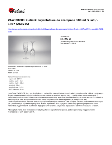 e-mail: [email protected] tel. : (17) 854 91 85 ZAWIERCIE: Kieliszki kryształowe do szampana 180 ml /2 szt./ 1907 (ZA0715) http://stary.helios-szklo.pl/zawiercie-kieliszki-krysztalowe-do-szampana-180-ml-2-szt.--1907-za0715--produkt-7425. html Cena brutto: 38.25 zł Cena katalogowa brutto: 42.50 zł Oszczędzasz: 4,25 zł PRODUCENT: Huta Szkła Gospodarczego ZAWIERCIE Sp. z o.o. SZLIF: 1907 FORMA: ZA-1192 INDEX: ZA0715 Kieliszki kryształowe do szampana: - pojemność – 180 ml - średnica czarki – 4 cm - średnica stopki – 6,5 cm - wysokość – 21 cm - wysokość nogi – 8,5 cm - ilość - 1 komplet (2 szt.) Huta Szkła ZAWIERCIE Sp. z o.o. jest jednym z najbardziej znanych i docenianych polskich producentów szkła kryształowego. Bogata, wielowiekowa tradycja i unikalna ręczna produkcja wyróżnia wyroby huty i czyni je łatwo rozpoznawalnymi. O najwyższą jakość produktu dba wyspecjalizowany personel Huty, wysoko wykwalifikowani hutnicy oraz wzorniczy i zdobnicy kierujący się w swej pracy uwielbieniem dla klasycznej formy oraz innowacyjnością w podejściu do niej. Dzięki niepowtarzalnym walorom estetycznym produkty Huty są cenione w całej Europie, zarówno przez miłośników tradycji, jak i przez osoby o wyrafinowanym guście. Kunszt wykonania oraz najwyższa jakość daje gwarancje spełnienia nawet najbardziej wygórowanych oczekiwań, dając przy tym ogromną satysfakcję z posiadania odrobiny luksusu na co dzień. *Ze względu na to, że w większości wyroby kryształowe są wykonane ręcznie, podane parametry mogą się różnić nieznacznie od tych rzeczywistych.