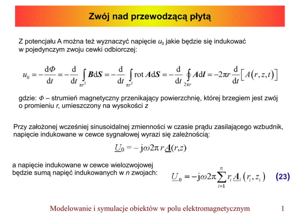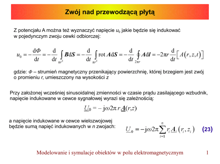 Zwój nad przewodzącą płytą Z potencjału A można też wyznaczyć napięcie u0 jakie będzie się indukować w pojedynczym zwoju cewki odbiorczej: gdzie: Φ – strumień magnetyczny przenikający powierzchnię, której brzegiem jest zwój o promieniu r, umieszczony na wysokości z Przy założonej wcześniej sinusoidalnej zmienności w czasie prądu zasilającego wzbudnik, napięcie indukowane w cewce sygnałowej wyrazi się zależnością: a napięcie indukowane w cewce wielozwojowej będzie sumą napięć indukowanych w n zwojach: Modelowanie i symulacje obiektów w polu elektromagnetycznym (23) 1 Zwój nad przewodzącą płytą (2) (3) (10) (11) Modelowanie i symulacje obiektów w polu elektromagnetycznym 2 Zwój nad przewodzącą płytą (18) (19) (20) (21) Modelowanie i symulacje obiektów w polu elektromagnetycznym 3 Cewka o przekroju prostokątnym nad przewodzącą płytą (2) (3) (10) (11) Modelowanie i symulacje obiektów w polu elektromagnetycznym 4 Cewka o przekroju prostokątnym nad przewodzącą płytą Korzystając z równań wyprowadzonych dla nieskończenie cienkiego zwoju, można obliczyć wektorowy potencjał magnetyczny A w układzie w którym występuje kilka współosiowych zwojów. Stosując metodę superpozycji, rozwiązanie znajduje się jako sumę rozwiązań pochodzących od poszczególnych zwojów: gdzie: n – liczba zwojów; Ai – rozwiązanie dla i-tego zwoju, r0i – promień i-tego zwoju, z0i – wysokość umieszczenia i-tego zwoju na osi Z. Modelowanie i symulacje obiektów w polu elektromagnetycznym 5 Cewka o przekroju prostokątnym nad przewodzącą płytą Podobnie, dla cewki o skończonym polu przekroju poprzecznego, rozwiązanie znajduje się jako całkę po powierzchni przekroju z rozwiązania dla nieskończenie cienkiego zwoju: gdzie: Scewki – pole przekroju poprzecznego cewki; Ai – rozwiązanie dla nieskończenie cienkiej cewki. Modelowanie i symulacje obiektów w polu elektromagnetycznym 6 Cewka o przekroju prostokątnym nad przewodzącą płytą Przykładowo, dla cewki o przekroju prostokątnym (jak na rysunku), o parametrach: z0 – położenie środka cewki na osi 0Z, 2z1 – wysokość cewki, r01 – wewnętrzny promień cewki, r02 – zewnętrzny promień cewki. (24) Modelowanie i symulacje obiektów w polu elektromagnetycznym 7 (25) (26) (27) (28) Modelowanie i symulacje obiektów w polu elektromagnetycznym 8 Cewka o przekroju prostokątnym nad przewodzącą płytą Równanie (25) odnosi się do obszaru powyżej cewki, równanie (26) do obszaru pomiędzy cewką a płytą, równanie (27) do przestrzeni zajmowanej przez płytę, a równanie (28) do obszaru poniżej płyty. W wyniku rozszerzenia cewki pojawiła się jeszcze dodatkowa przestrzeń, wzdłuż osi Z na całej wysokości cewki, nie opisana żadnym z dotychczas przedstawionych równań, oznaczona jako „obszar I-II”. Rozwiązanie w tym obszarze otrzymuje się biorąc równanie (25) dla części cewki w granicach od jej dolnej powierzchni do wysokości z i dodając równanie (26) dla części cewki od wysokości z do jej górnej powierzchni. (29) Modelowanie i symulacje obiektów w polu elektromagnetycznym 9 Cewka o przekroju prostokątnym nad przewodzącą płytą Wykonując w równaniach (25) – (29) całkowanie po z0, a całkę po r0 przekształcając według zależności: (30) otrzymuje się równania określające wektorowy potencjał magnetyczny A we wszystkich obszarach rozpatrywanej przestrzeni. Modelowanie i symulacje obiektów w polu elektromagnetycznym 10 Cewka o przekroju prostokątnym nad przewodzącą płytą Przy założeniu, że cewka składa się z n równomiernie rozłożonych zwojów i w każdym z nich płynie prąd o jednakowej wartości i fazie, równania – przyjmują postać: (31) (32) Modelowanie i symulacje obiektów w polu elektromagnetycznym 11 Cewka o przekroju prostokątnym nad przewodzącą płytą Przy założeniu, że cewka składa się z n równomiernie rozłożonych zwojów i w każdym z nich płynie prąd o jednakowej wartości i fazie, równania – przyjmują postać: (33) (34) (35) Modelowanie i symulacje obiektów w polu elektromagnetycznym 12 Cewka o przekroju prostokątnym nad przewodzącą płytą Wyniki otrzymane na podstawie równań (31-35) dla układu o parametrach: przenikalność magnetyczna materiału płyty: μr = 1, przewodność elektryczna materiału płyty: σ = 35 MS/m, amplituda prądu w cewce wymuszającej pole: Im = 60 mA, częstotliwość prądu w cewce: f = 10 kHz, liczba zwojów w cewce: wewnętrzny promień cewki: n = 200, r01 = 9 mm, zewnętrzny promień cewki: r02 = 11 mm, wysokość uzwojenia: 2z1 = 2 mm, położenie wzbudnika: z0 = 8 mm, grubość płyty: d = 3 mm Modelowanie i symulacje obiektów w polu elektromagnetycznym 13 Cewka o przekroju prostokątnym nad przewodzącą płytą Modelowanie i symulacje obiektów w polu elektromagnetycznym 14 Cewka o przekroju prostokątnym nad przewodzącą płytą Modelowanie i symulacje obiektów w polu elektromagnetycznym 15 Cewka o przekroju prostokątnym nad przewodzącą płytą Na podstawie wektorowego potencjału magnetycznego można obliczyć wszystkie inne wielkości, np. gęstość prądu indukowanego w przewodzącej płycie. Wzór (22) można zastosować bez zmian, podstawiając tylko odpowiednie wyrażenie na potencjał: (22) Modelowanie i symulacje obiektów w polu elektromagnetycznym 16 Cewka o przekroju prostokątnym nad przewodzącą płytą Nie wszystkie układy wzbudzenia przetworników wiroprądowych można rozwiązać metodami analitycznymi. Można jednak wykorzystać metody numeryczne. Pokazano zastosowanie programu COMSOL Multiphysics, wykorzystującego metodę elementów skończonych, do obliczenia rozkładu pola elektromagnetycznego w jednym z przetworników opracowanych w Katedrze Elektrotechniki Teoretycznej i Informatyki. Modelowanie i symulacje obiektów w polu elektromagnetycznym 17 Cewka o przekroju prostokątnym nad przewodzącą pł