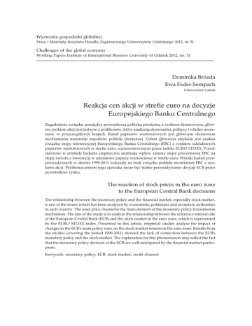 Wyzwania gospodarki globalnej Prace i Materia³y Instytutu Handlu Zagranicznego Uniwersytetu Gdañskiego 2012, nr 31 Challenges of the global economy Working Papers Institute of International Business University of Gdañsk 2012, no. 31 Dominika Brózda Ewa Feder-Sempach Uniwersytet £ódzki Reakcja cen akcji w strefie euro na decyzje Europejskiego Banku Centralnego Zagadnienie zwi¹zku pomiêdzy prowadzon¹ polityk¹ pieniê¿n¹ a rynkiem finansowym, g³ównie rynkiem akcji jest jednym z problemów, które analizuj¹ ekonomiœci, politycy i w³adze monetarne w poszczególnych krajach. Kana³ papierów wartoœciowych jest g³ównym elementem mechanizmu transmisji impulsów polityki pieniê¿nej. Celem g³ównym artyku³u jest analiza zwi¹zku stopy referencyjnej Europejskiego Banku Centralnego (EBC) z rynkiem udzia³owych papierów wartoœciowych w strefie euro, reprezentowanym przez indeks EURO STOXX. Przedstawione w artykule badania empiryczne analizuj¹ wp³yw zmiany stopy procentowej EBC na stopê zwrotu z inwestycji w udzia³owe papiery wartoœciowe w strefie euro. Wyniki badañ przeprowadzonych w okresie 1999-2011 wskaza³y na brak zwi¹zku polityki monetarnej EBC z rynkiem akcji. Wyt³umaczeniem tego zjawiska mo¿e byæ trafne przewidywanie decyzji ECB przez uczestników rynku. The reaction of stock prices in the euro zone to the European Central Bank decisions The relationship between the monetary policy and the financial market, especially stock market, is one of the issues which has been analysed by economists, politicians and monetary authorities in each country. The asset price channel is the main element of the monetary policy transmission mechanism. The aim of the study is to analyze the relationship between the reference interest rate of the European Central Bank (ECB) and the stock market in the euro zone, which is represented by the EURO STOXX index. Presented in this article, empirical studies analyse the impact of changes in the ECB's main policy rates on the stock market returns in the euro zone. Results from the studies (covering the period 1999-2011) showed the lack of connection between the ECB's monetary policy and the stock market. The explanation for this phenomenon may reflect the fact that the monetary policy decision of the ECB are well anticipated by the financial market participants. Kewyords: monetary policy, ECB, stock market, credit channel 376 Dominika Brózda, Ewa Feder-Sempach Wprowadzenie Zwi¹zek pomiêdzy prowadzon¹ polityk¹ pieniê¿n¹ a rynkiem akcji jest zagadnieniem, które analizuj¹ ekonomiœci na ca³ym œwiecie. Kana³ papierów wartoœciowych1 jest obok kana³u stopy procentowej, kana³u kursu walutowego oraz kana³ów kredytowych (tj. kana³u kredytów bankowych i kana³u bilansowego) g³ównym elementem mechanizmu transmisji impulsów polityki pieniê¿nej (transmission mechanism of monetary policy) [Pszczó³ka, 2007]. Poprzez kana³ cen aktywów finansowych bank centralny wp³ywa na oczekiwane stopy zwrotu z akcji, a te za poœrednictwem zmian cen akcji na aktywnoœæ inwestycyjn¹ przedsiêbiorstw i popyt globalny. Dlatego w³aœnie inwestorzy z wielk¹ uwag¹ oczekuj¹ decyzji banków centralnych, gdy¿ rodzaj realizowanej polityki pieniê¿nej odbija siê na wynikach sfery realnej w gospodarce. Rynek gie³dowy najszybciej reaguje na informacje dotycz¹ce bie¿¹cej sytuacji ekonomicznej w kraju, a indeks gie³dowy jest traktowany jako barometr gospodarki. Analiza si³y i kierunku wp³ywu polityki pieniê¿nej na rynek udzia³owych papierów wartoœciowych mo¿e dawaæ jasne wskazówki, co do podejmowania decyzji inwestycyjnych. Jedna ze znanych hipotez wœród inwestorów amerykañskich mówi, ¿e po trzykrotnej redukcji stopy redyskontowej przez FED (Zarz¹d Rezerwy Federalnej) powinna wyst¹piæ hossa, a odwrotne dzia³anie FED zwiastuje bessê. Istnieje szereg dowodów na to, i¿ ta prosta regu³a – mówi¹ca „kupuj” aktywa finansowe, gdy bank centralny prowadzi ekspansywn¹ politykê pieniê¿n¹ i „sprzedawaj”, gdy restrykcyjn¹ – prowadzi do osi¹gania dodatnich stóp zwrotu [Gurgul, 2006]. Celem niniejszego artyku³u jest analiza zwi¹zku stopy referencyjnej Europejskiego Banku Centralnego (EBC) z rynkiem udzia³owych papierów wartoœciowych w strefie euro, czyli rynkiem akcji. G³ównym celem przedstawionych w artykule badañ empirycznych jest pytanie o wp³yw zmiany stopy procentowej EBC na stopê zwrotu z inwestycji w udzia³owe papiery wartoœciowe w strefie euro. Analiza by³a prowadzona w okresie 1999-2011 na podstawie danych pozyskanych z serwisu Thomson Reuters. 1. Wp³yw zmian cen akcji na realn¹ sferê gospodarki Jak zosta³o wczeœniej wspomniane, ceny akcji odgrywaj¹ istotn¹ rolê w mechanizmie transmisji impulsów polityki pieniê¿nej. Wahania na rynku udzia³owych papierów wartoœciowych, pod wp³ywem zmian w polityce monetarnej, od1 Kana³ papierów wartoœciowych jest doœæ czêsto traktowany jako element kana³u bilansowego. Reakcja cen akcji w strefie euro na decyzje Europejskiego Banku Centralnego 377 dzia³uj¹ na sferê realn¹ gospodarki. Zmiany cen akcji wp³ywaj¹ m.in. na wysokoœæ kosztu kapita³u oraz na zdolnoœæ przedsiêbiorstw do podejmowania przedsiêwziêæ inwestycyjnych [Basistha i Kurov, 2006]. Frederic Mishkin [2001] wyró¿ni³ cztery g³ówne mechanizmy (drogi transmisji impulsów polityki pieniê¿nej) wykorzystuj¹ce ceny akcji, tj.: 1) wp³yw cen akcji na inwestycje podmiotów gospodarczych (stock market effects on investment), 2) efekt bilansowy przedsiêbiorstw (firm balance-sheet effects), 3) efekt p³ynnoœciowy gospodarstw domowych (house hold liquidity effects), 4) efekt maj¹tkowy gospodarstw domowych (house hold health effects). Wp³yw cen akcji na wydatki inwestycyjne przedsiêbiorstw wyjaœnia teoria „q” Tobina. Ekspansywna polityka monetarna banku centralnego (m.in. poprzez obni¿anie poziomu stóp procentowych) sprawia, ¿e inwestycje w obligacj