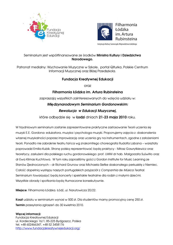 Seminarium jest współfinansowane ze środków Ministra Kultury i Dziedzictwa Narodowego. Patronat medialny: Wychowanie Muzyczne w Szkole, portal Qlturka, Polskie Centrum Informacji Muzycznej oraz Bliżej Przedszkola. Fundacja Kreatywnej Edukacji oraz Filharmonia Łódzka im. Artura Rubinsteina zapraszają wszystkich zainteresowanych do wzięcia udziału w: Międzynarodowym Seminarium Gordonowskim: Rewolucja w Edukacji Muzycznej, które odbędzie się w Łodzi dniach 21-23 maja 2010 roku. W trzydniowym seminarium zostanie zaprezentowane praktyczne zastosowanie Teorii uczenia się muzyki E.E. Gordona: edukatora, muzyka i psychologa muzyki. Proponujemy zajęcia z: doskonalenia własnej muzykalności poprzez improwizację oraz uczenia gry na instrumentach, zgodne z założeniami teorii. Ponadto nie zabraknie teatru tańca wg znakomitego choreografa Rudolfa Labana – warsztaty poprowadzi Emilia Kubik. Stronę polską reprezentować będą praktycy - Miłosz Gawryłkiewicz oraz teoretycy, zasłużeni dla polskiego ruchu gordonowskiego: prof. UWM dr hab. Małgorzata Suświłło oraz dr Ewa Klimas Kuchtowa. W tym roku zaprosiliśmy gości z Gordon Institute for Music Learning ze Stanów Zjednoczonych – dr Richard Grunow oraz Michaela Siefke doskonałego perkusistę z Niemiec. Całość dopełnią występy naszych portugalskich przyjaciół z Companhia de Música Teatral. Seminarium towarzyszyć będą koncerty i spektakle teatralne dla rodzin z małymi dziećmi. Wszystkie obrady i spotkania będą tłumaczone konsekutywnie. Miejsce: Filharmonia Łódzka. Łódź, ul. Narutowicza 20/22. Koszt udziału w seminarium wynosi w 500 zł. Dla studentów mamy promocyjną cenę 250 zł. Termin przesyłania zgłoszeń do 30 kwietnia 2010. Więcej informacji: Fundacja Kreatywnej Edukacji ul. Kordeckiego 16/1; 85-225 Bydgoszcz, Polska tel. +48 602466347, +48 52 3458176 http://www.fundacjakreatywnejedukacji.org/ Program: Wszystkie wydarzenia odbędą się w Filharmonii Łódzkiej, ul.Narutowicza 20/22, Łódź. 21.05.2010 9.00 – 9.30 Powitanie: Jolanta Gawryłkiewicz (FKE) i Dominika Jakubowska (Filharmonia Łódzka). 9.30 – 11.00 Uczenie gry na instrumentach wg Teorii E.E. Gordona. I część. dr GIML R. Grunow 11.30 -12.30 Rozwijanie inteligencji muzycznej dziecka w kontekście koncepcji inteligencji wielorakich. prof. UWM dr hab. M. Suświłło. Przerwa obiadowa 14.30 – 16.00 Uczenie gry na instrumentach wg Teorii E.E. Gordona. II część. dr Grunow GIML R. 16.30 – 18.00 Companhia Musica Teatral – Teoria E.E. Gordona w teatrze. dr H. Rodrigues. 22.05.2009 9.00 – 10.00 Companhia Musica Teatral warsztaty dla dzieci do 5go roku życia. 9.00 – 10.45 Warsztaty z improwizacji tańca wg R. Labana. I grupa. E. Kubik 11.00 – 12.00 Companhia Musica Teatral warsztaty dla dzieci do 5go roku życia. 11.00 – 12.45 Warsztaty z improwizacji tańca wg R. Labana. II grupa. E. Kubik 14.00 – 15.30 Rozwijam swoją muzykalność – poprzez improwizację. I część. Miłosz Gawryłkiewicz (FKE). 15.45 – 17.00 Rozwijam swoją muzykalność – próba do koncertu Happy Jazz dla niemowląt i małych dzieci. II część. M. Gawryłkiewicz. 17.30 – 18.30 Koncert Happy Jazz dla rodzin z małymi dziećmi do lat 6. Prowadzenie M. Gawryłkiewicz. 18.30 Bankiet i koncert jazzowy. 23.05.2009 10.00 – 11.00 Companhia Musica Teatral Andakibebe – spektakl. 9.00 – 10.30 Drumcircle I grupa. M. Siefke. 12.00 – 13.00 Companhia Musica Teatral Andakibebe - spektakl. 11.00 – 12.30 Drumcircle II grupa. M. Siefke. 13.00 – 14.00 Efekt Mozarta a audiacja. Dr E. Klimas-Kuchtowa 14.00 – 15.30 Uczenie gry na instrumentach wg Teorii E.E. Gordona. III część. dr R. Grunow GIML 15.30 – 16.00 Podsumowanie. Jolanta Gawryłkiewicz (FKE) i Dominika Jakubowska (Filharmonia Łódzka). Organizatorzy zastrzegają sobie prawo do zmian w programie. Prowadzący warsztaty oraz wykłady: - - - - - - Companhia de Música Teatral: 7 aktorów, pośród nich: Helena Rodrigues, Ana Paula Almeida, Carlos Gomes, Isabel Gonçalves, Jorge Leal, Paulo Maria Rodrigues. Helena Rodrigues (dr) nauczyciel akademicki w Faculdade de Ciências Sociais e Humanas w Lizbonie, Portugalia. Współreżyser oraz aktorka w Companhia de Música Teatral (www.musicateatral.com); Ana Paula Almeida badacz rozwoju muzycznego w okresie niemowlęctwa oraz wczesnego dzieciństwa w Faculdade de Ciências Sociais e Humanas w Lizbonie, Portugalia. Współpracuje z Companhia de Música Teatral i Casa da Música do Porto. Emilia Kubik – tancerka, animatorka kulturalna oraz założycielka Teatru Tańca „Rozruch”, prezes Fundacja Kultury „Rozruch”. Prowadzi warsztaty z techniki Rudolfa Labana. Miłosz Gawryłkiewicz – muzyk jazzowy, psycholog muzyki, nauczyciel akademicki Uniwersytetu Kazimierza Wielkiego, producent i autor nagrań propagujących Teorię uczenia się muzyki E.E. Gordona. Członek Polskiego Towarzystwa E.E. Gordona. Richard Grunow (dr) profesor na Wydziale Edukacji Muzycznej w Eastman School of Music in Rochester, New York. Wiodący innowator w uczeniu początkowym gry na instrumentach. Dr Grunow jest aktywnym wykładowcą oraz badaczem, który prowadzi wykłady w całych Stanach Zjednoczonych, ale też w Kanadzie, Austrii, Niemczech, Litwie, Portugalii, Japonii i Zachodnich Indiach. Jego badania i zakres tematyczny wystąpień skupia się na zastosowaniu Teorii uczenia się muzyki w uczeniu gry na instrumentach oraz prowadzeniu chóru, pomiarze i ewaluacji, jak i uczeniu czytania notacji muzycznej. Michael Siefke: Muzyk i edukator, specjalista TaKeTiNa oraz Drumcirle. Uczy w Cawl Music School w Niemczech i prowadzi rokrocznie wiele szkoleń na całym globie. Ewa Klimas-Kuchtowa (dr): pracownik naukowo-dydaktyczny Instytutu Psychologii Stosowanej UJ, tłumacz publikacji E.E. Gordona. - Małgorzata Suświłło (prof UWM dr hab.): Kierownik Wydziału Wczesnej Edukacji na Uniwersytecie Warmińsko-Mazurskim. Promotorka prac doktorskich z zak