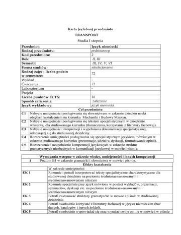 Karta (sylabus) przedmiotu TRANSPORT Studia I stopnia Przedmiot: Rodzaj przedmiotu: Kod przedmiotu: Rok: Semestr: Forma studiów: Rodzaj zajęć i liczba godzin w semestrze: Wykład Ćwiczenia Laboratorium Projekt Liczba punktów ECTS: Sposób zaliczenia: Język wykładowy: C1 C2 C3 C4 C5 Język niemiecki podstawowy 2 II, III III, IV, V, VI niestacjonarne 72 72 16 zaliczenie język niemiecki Cel przedmiotu Nabycie umiejętności posługiwania się słownictwem w zakresie dziedzin nauki objętych kształceniem na kierunku Mechaniki i Budowy Maszyn. Nabycie umiejętności posługiwania się tekstem specjalistycznym w dziedzinie właściwej dla studiowanego kierunku (tłumaczenia, korzystanie z literatury fachowej). Nabycie umiejętności interpretacji i wypełniania dokumentacji specjalistycznej, odnoszącej się do studiowanej dziedziny. Rozszerzenie umiejętności posługiwania się specjalistycznym językiem mówionym w zakresie studiowanego kierunku (prezentacje, udział w dyskusji, formułowanie opinii). Rozszerzenie i uzupełnienie kompetencji językowych w zakresie struktur gramatycznych niezbędnych w komunikacji językowej w mowie i piśmie. 1 EK 1 EK 2 EK 3 EK 4 EK 5 Wymagania wstępne w zakresie wiedzy, umiejętności i innych kompetencji Poziom B1 w zakresie gramatyki i słownictwa w mowie i piśmie. Efekty kształcenia W zakresie umiejętności: Rozumie i potrafi interpretować teksty specjalistyczne charakterystyczne dla studiowanej dziedziny na poziomie średniozaawansowanym i średniozaawansowanym niższym Rozumie specjalistyczny język mówiony w postaci wykładów, prezentacji, seminariów, dyskusji etc. na poziomie średniozaawansowanym i średniozaawansowanym niższym Potrafi zastosować struktury gramatyczne w mowie i piśmie w studiowanej dziedzinie. Potrafi swobodnie korzystać z literatury fachowej w języku niemieckim (baz danych, katalogów i innych źródeł). Potrafi swobodnie wypowiadać się oraz wyrażać swoje opinie w mowie i w piśmie EK 6 EK 7 na tematy objęte zakresem studiów. W zakresie kompetencji społecznych: Posiada umiejętności pracy samodzielnej i w zespole ( praca w parach, grupach). Potrafi samodzielnie posługiwać się językiem niemieckim w obszarze studiowanej dziedziny. Treści programowe przedmiotu Forma zajęć – ćwiczenia I, semestr III Ćw. 1 Podstawowe zawody z branży mechanicznej i górniczo hutniczej. Ćw. 2 Miejsca pracy i opisywanie prostych czynności z nimi związanych. Ćw. 3 Typowe narzędzia i urządzenia techniczne oraz czynności nimi wykonywane. Ćw.4 Obszary produkcyjne w branży mechanicznej i górniczo-hutniczej. Ćw. 5 Wypełnianie formularza osobowego i CV. Ćw. 6 Przedstawianie swojego życiorysu zawodowego oraz uzyskiwanie informacji o innych osobach. Ćw. 7 Opisywanie przebiegu dnia w zakładzie pracy. Ćw. 8 Rozmowa o planach zawodowych. Forma zajęć – ćwiczenia II, semestr IV Ćw.10 Nazwy sprzętu gospodarstwa domowego i opisywanie jego funkcji. Ćw.11 Opisywanie usterek technicznych sprzętu gospodarstwa domowego. Ćw.12 Rozmowa o profilach zawodu inżyniera mechaniki. Ćw.13 Zawody i czynności związane z przemysłem samochodowym. Ćw.14 Podstawowe typy pojazdów samochodowych. Ćw.15 Opisywanie czynności technicznych w warsztacie naprawczym. Ćw.16 Podstawowe etapy produkcji samochodu i rozmowa o etapach jego produkcji. Ćw.17 Formy zatrudnienia. Forma zajęć – ćwiczenia III, semestr V Ćw. 19 Zawody oraz czynności związane z hutnictwem i metalurgią. Ćw. 20 Opisywanie etapów produkcji stali. Ćw. 21 Rozmowa o bezpieczeństwie pracy w hutnictwie. Ćw. 22 Czynności techniczne typowe dla górnictwa. Ćw. 23 Prowadzenie rozmowy na temat obsługi maszyn górniczych. Ćw. 24 Analiza kulturoznawczych informacji dotyczących Zagłębia Ruhry. Ćw. 25 Nazywanie typowych usterek maszyn CNC. Ćw. 26 Wypełnianie formularza zgłoszeniowego i zamówieniowego stosowanego w serwisie maszyn CNC. Forma zajęć – ćwiczenia IV, semestr VI Ćw. 27 Wyszukiwanie różnych źródeł internetowych informacji dotyczących tematyki zawodowej. Ćw. 28 Posługiwanie się słownikami na zajęciach języka niemieckiego zawodowego i technicznego. Ćw. 29 Korzystanie z dokumentacji Europass. Ćw. 30 Narzędzia internetowe do tłumaczeń. Ćw. 31 Wykorzystywanie portali internetowych do tłumaczeń technicznych i zawodowych. Ćw. 32 PONS.eu jako przykład słownika internetowego. Ćw. 33 www.ling.pl oraz www.megaslownik.pl jako przykłady polskich portali tłumaczeniowych. Ćw. 34 Rozmowa na temat motywowania do nauki j. niemieckiego oraz podnoszenia swoich kwalifikacji zawodowych. Metody dydaktyczne 1 2 3 Konwersatoria. Translatoria. Prezentacje. Obciążenie pracą studenta Forma aktywności Godziny kontaktowe z wykładowcą, w tym: udział w wykładach, udział w ćwiczeniach, Praca własna studenta, w tym: przygotowanie do ćwiczeń w oparciu o literaturę przedmiotu konsultacje i przygotowanie do zaliczenia Łączny czas pracy studenta Sumaryczna liczba punktów ECTS dla przedmiotu: Liczba punktów ECTS w ramach zajęć o charakterze praktycznym (ćwiczenia, laboratoria, projekty) 1 2 3 4 5 Literatura podstawowa Mit Beruf auf Deutsch , profil mechaniczny I górniczo – hutniczy, nowa era 2012 Studio d A2 lub B1, Funk, Kuhn, Demme, Cornelsen 2005 Literatura uzupełniająca Orientierung im Beruf A2 Langenscheidt KG 2008 Wirtschaftskommunikation Deutsch – Materialien, Langenscheidt KG 2008 Deutsch für Techniker, Berlin A2/B1 6 Wybrane strony internetowe Macierz efektów kształcenia Efekt kształcenia EK 1 EK 2 EK 3 EK 4 EK 5 EK 6 EK 7 Odniesienie danego efektu kształcenia do efektów zdefiniowanych dla całego programu (PEK) MT1A_U01 MT1A_U02 MT1A_U04 MT1A_U05 MT1A_U02 MT1A_U03 MT1A_U04 MT1A_U05 MT1A_U01 MT1A_U02 MT1A_U05 MT1A_U03 MT1A_U01 MT1A_U02 MT1A_U03 MT1A_U04 MT1A_U05 MT1A_U01 MT1A_U02 MT1A_U05 MT1A_U06 MT1A_K01 MT1A_K02 MT1A_K05 MT1A_K06 MT1A_K01 MT1A_K02 MT1A_K05 MT1A_K06 Cele przedmiotu Treści prog
