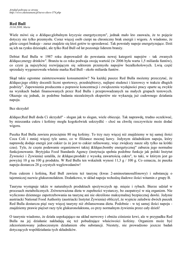 Artykuł pobrany ze strony http://www.ekonsument.pl/news-show-374.php Red Bull 10.04.2008, Maria Wiele mówi się o “globalnym kryzysie energetycznym", jednak mało kto zauważa, że to pojęcie dotyczy nie tylko przemysłu. Coraz więcej osób cierpi na chroniczny brak energii i wigoru. A wiadomo, że gdzie czegoś brakuje - zaraz znajdzie się ktoś gotów to sprzedawać. Tak powstały napoje energetyzujące. Dziś są ich na rynku dziesiątki, ale tylko Red Bull od lat pozostaje liderem branży. Debiut Red Bulla w 1987 roku doprowadził do powstania nowej kategorii napojów - tak zwanych “energy drinków". Branża ta co roku podwaja swoją wartość (w 2006 była warta 1,5 miliarda funtów), co czyni ją najszybciej rozwijającym się sektorem przemysłu napojów bezalkoholowych. Lwią część sprzedaży wygenerowała właśnie marka Red Bull - około miliarda funtów. Skąd takie ogromne zainteresowanie konsumentów? Na każdej puszce Red Bulla możemy przeczytać, że “jego efekty docenili liczni sportowcy, przedsiębiorcy, najlepsi studenci i kierowcy w trakcie długich podróży". Zapewnienia producenta o poprawie koncentracji i zwiększeniu wydajności pracy oparte są zwykle na wynikach badań finansowanych przez Red Bulla i przeprowadzanych na małych grupach testowych. Okazuje się jednak, że podobne badania niezależnych ekspertów nie wykazują już cudownego działania napoju. Bez skrzydeł “Red Bull doda Ci skrzydeł" - slogan jak to slogan, wiele obiecuje. Tak naprawdę, trudno oczekiwać, by mieszanka cukru i kofeiny mogła kogokolwiek uskrzydlić - choć na chwilę rzeczywiście może dodać wigoru. Puszka Red Bulla zawiera przeciętnie 80 mg kofeiny. To trzy razy więcej niż znajdziemy w tej samej ilości Coca Coli i mniej więcej tyle samo, co w filiżance mocnej kawy. Jedynym składnikiem napoju, który naprawdę dodaje energii jest cukier (a że jest to cukier rafinowany, więc zwiększy nasze siły tylko na krótki czas). Tyle, że częste podawanie organizmowi takiej “bomby energetycznej" zaburza jego normalne funkcjonowanie. Brytyjska Food Standards Agency (instytucja spełnia podobne funkcje jak polski Instytut Żywności i Żywienia) ustaliła, że “produkt z wysoką zawartością cukru", to taki, w którym jest go powyżej 10 g na 100 g produktu. W Red Bullu ten wskaźnik wynosi 11,3 g / 100 g. Co oznacza, że puszka napoju dostarcza 28 g czystych węglowodanów! Poza cukrem i kofeiną, Red Bull zawiera też taurynę (kwas 2-aminoetanosulfonowy) i substancję o tajemniczej nazwie glukuronolakton. Dodatkowo, w skład napoju wchodzą śladowe ilości witamin z grupy B. Tauryna występuje także w naturalnych produktach spożywczych np. mięsie i rybach. Bierze udział w procesach metabolicznych. Zrównoważona dieta w zupełności wystarczy, bo zaopatrzyć w nią organizm. Nie wyliczono dziennego zapotrzebowania na taurynę ani nie określono maksymalnej bezpiecznej dawki. Jedynie austriacki National Food Authority (austriacki Instytut Żywienia) obliczył, że wypicie zaledwie dwóch puszek Red Bulla dostarcza pięć razy więcej tauryny niż zbilansowana dieta. Podobnie - w tej samej ilości napoju znajdziemy prawie pięćset razy tyle glukuronolaktonu, co przy normalnym żywieniu przez cały dzień! O taurynie wiadomo, że działa uspokajająco na układ nerwowy i obniża ciśnienie krwi, ale w przypadku Red Bulla na jej działanie nakładają się też pobudzające właściwości kofeiny. Organizm może być zdezorientowany jednoczesnym działaniem obu substancji. Niestety, nie prowadzono jeszcze badań dotyczących współdziałania tych składników. Uwaga na zdrowie Niezbadane skutki picia napojów energetycznych martwią organizacje zajmujące się zdrowiem publicznym na całym świecie. Niedawno we Francji wstrzymano sprzedaż Red Bulla. W Turcji w ostatniej chwili odwołano podobny zakaz, gdy producent zgodził się wprowadzić zmiany w składzie napoju - między innymi zmniejszając o połowę zawartość kofeiny. W Szwecji, Danii i Norwegii Red Bull traktowany jest jak lek sprzedawany bez recepty, natomiast w Japonii jeszcze niedawno można go było kupić tylko w aptekach! Kanada, która dopiero teraz zezwoliła na sprzedaż napoju, do każdej puszki dołącza ostrzeżenie, że produkt jest niewskazany dla dzieci, kobiet w ciąży i karmiących piersią, osób wrażliwych na kofeinę, że nie należy łączyć napoju z alkoholem ani przekraczać maksymalnej dziennej dawki 500 ml. Wielka Brytania nie wymaga od producenta podawania na opakowaniu dodatkowych ostrzeżeń - poza jednym, wspólnym dla całej Unii Europejskiej, zawiadamiającym konsumenta, że napój zawiera “dużą ilość kofeiny" (określa się tak napoje - z wykluczeniem kawy i herbaty - zawierające ponad 150 mg tej substancji w każdym litrze). Smutne jest, że Red Bull - reklamowany jako napój zdrowotny w rzeczywistości ani trochę nie odżywia i nie regeneruje organizmu np. po dużym wysiłku fizycznym. Wręcz przeciwnie, zawarta w nim kofeina może przyczynić się do odwodnienia. Łączenie Red Bulla i intensywnego wysiłku może okazać się zabójcze. Niewielka liczba osób zmarła w wyniku zawału serca na skutek picia Red Bulla w trakcie ćwiczeń. Choć nie udowodniono bezpośredniego związku przyczynowo-skutkowego, wiadomo, że odwadniające właściwości kofeiny zażytej podczas wysiłku znacząco obciążają serce. Równie niebezpieczne może być łączenie Red Bulla z alkoholem. Badania przeprowadzone w Brazylii na grupie studentów wykazały, że wypicie mieszanki napojów alkoholowych i energetyzujących powoduje utratę świadomości bycia pod wpływem alkoholu, “ukrywając" nieprzyjemne objawy nietrzeźwości, np. bóle głowy, słabość, suchość w ustach, brak koordynacji. Przebudzenie dla przemęczonej generacji Od początku swojej działalności Red Bull utrzymuje, że ich produkt jest zupełnie bezpieczny. Firma wskazuje, iż miliony o