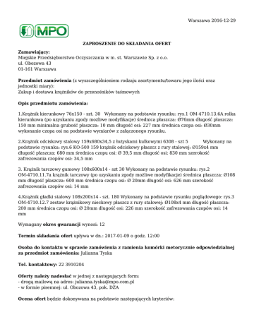 Warszawa 2016-12-29 ZAPROSZENIE DO SKŁADANIA OFERT Zamawiający: Miejskie Przedsiębiorstwo Oczyszczania w m. st. Warszawie Sp. z o.o. ul. Obozowa 43 01-161 Warszawa Przedmiot zamówienia (z wyszczególnieniem rodzaju asortymentu/towaru jego ilości oraz jednostki miary): Zakup i dostawa krążników do przenośników taśmowych Opis przedmiotu zamówienia: 1.Krążnik kierunkowy 76x150 - szt. 30 Wykonany na podstawie rysunku: rys.1 OM-4710.13.6A rolka kierunkowa (po uzyskaniu zgody możliwe modyfikacje) średnica płaszcza: Ø76mm długość płaszcza: 150 mm minimalna grubość płaszcza: 10 mm długość osi: 227 mm średnica czopa osi: Ø30mm wykonanie czopa osi na podstawie wymiarów z załączonego rysunku. 2.Krążnik odciskowy stalowy 159x680x34,5 z łożyskami kulkowymi 6308 - szt 5 Wykonany na podstawie rysunku: rys.6 KO-500 159 krążnik odciskowy płaszcz z rury stalowej: Ø159x4 mm długość płaszcza: 680 mm średnica czopu osi: Ø 39,5 mm długość osi: 830 mm szerokość zafrezowania czopów osi: 34,5 mm 3. Krążnik tarczowy gumowy 108x600x14 - szt 30 Wykonany na podstawie rysunku: rys.2 OM-4710.11.7a krążnik tarczowy (po uzyskaniu zgody możliwe modyfikacje) średnica płaszcza: Ø108 mm długość płaszcza: 600 mm średnica czopu osi: Ø 20mm długość osi: 626 mm szerokość zafrezowania czopów osi: 14 mm 4.Krążnik gładki stalowy 108x200x14 - szt. 180 Wykonany na podstawie rysunku poglądowego: rys.3 OM-4710.12.7 zestaw krążnikowy nieckowy płaszcz z rury stalowej: Ø108x4 mm długość płaszcza: 200 mm średnica czopu osi: Ø 20mm długość osi: 226 mm szerokość zafrezowania czopów osi: 14 mm Wymagany okres gwarancji wynosi: 12 Termin składania ofert upływa w dn.: 2017-01-09 o godz. 12:00 Osoba do kontaktu w sprawie zamówienia z ramienia komórki metorycznie odpowiedzialnej za przedmiot zamówienia: Julianna Tyska Tel. kontaktowy: 22 3910204 Oferty należy nadesłać w jednej z następujących form: - drogą mailową na adres: [email protected] - w formie pisemnej: ul. Obozowa 43, pok. DZA Ocena ofert będzie dokonywana na podstawie następujących kryteriów: cena 100% Zapraszamy do składania ofert.