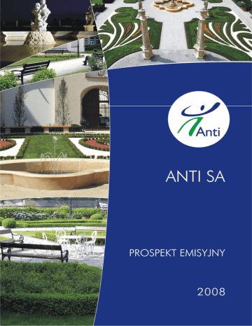 PROSPEKT EMISYJNY Akcji Serii C spółki ANTI SPÓŁKA AKCYJNA z siedzibą w Wysokiej Sporządzony w związku z: ofertą publiczną 1.700.000 Akcji Serii C oraz ubieganiem się o dopuszczenie do obrotu na rynku regulowanym od 90.000 do 1.700.000 Akcji Serii C, od 90.000 do 1.700.000 Praw do Akcji Serii C, 500.000 Akcji Serii B Zatwierdzony decyzją Komisji Nadzoru Finansowego w dniu 4 grudnia 2008 roku. ....................................................................................................... Oferta Publiczna Akcji Spółki ANTI S.A. jest przeprowadzana jedynie na terytorium Rzeczpospolitej Polskiej. Poza granicami Polski niniejszy prospekt nie może być traktowany jako propozycja lub oferta nabycia. Prospekt ani papiery wartościowe nim objęte nie były przedmiotem rejestracji, zatwierdzenia lub notyfikacji w jakimkolwiek Państwie poza Rzeczpospolitą Polską. Papiery wartościowe objęte niniejszym prospektem nie mogą być oferowane lub sprzedawane poza granicami Rzeczpospolitej Polskiej (w tym na terenie innych państw Unii Europejskiej oraz Stanów Zjednoczonych Ameryki Północnej), chyba że w danym Państwie taka oferta lub sprzedaż mogłaby zostać dokonana zgodnie z prawem, bez konieczności spełnienia jakichkolwiek dodatkowych wymogów prawnych. Każdy Inwestor zamieszkały bądź mający siedzibę poza granicami Rzeczpospolitej Polskiej powinien zapoznać się z przepisami prawa polskiego oraz przepisami innych państw, które mogą się do niego odnosić. 2 2 SPIS TREŚCI SPIS TREŚCI 3 DOKUMENT PODSUMOWUJĄCY 9 1. ZASTRZEŻENIE 2. NAJWAŻNIEJSZE INFORMACJE DOTYCZĄCE EMITENTA 3. DORADCY I BIEGLI REWIDENCI 4. CZYNNIKI RYZYKA 5. NAJWAŻNIEJSZE INFORMACJE DOTYCZĄCE PAPIERÓW WARTOŚCIOWYCH 6. NAJWAŻNIEJSZE INFORMACJE DOTYCZĄCE OFERTY 7. NAJWAŻNIEJSZE INFORMACJE DOTYCZĄCE DOPUSZCZENIA PAPIERÓW WARTOŚCIOWYCH DO OBROTU NA RYNKU REGULOWANYM 10 10 13 13 14 15 CZYNNIKI RYZYKA 17 1. 2. 3. 18 19 22 CZYNNIKI RYZYKA ZWIĄZANE Z OTOCZENIEM CZYNNIKI RYZYKA SPECYFICZNE DLA EMITENTA I JEGO BRANŻY CZYNNIKI RYZYKA ZWIĄZANE Z AKCJAMI I RYNKIEM KAPITAŁOWYM 16 DOKUMENT REJESTRACYJNY 29 1. 2. 2.1 30 32 OSOBY ODPOWIEDZIALNE I ICH OŚWIADCZENIA BIEGLI REWIDENCI IMIONA I NAZWISKA (NAZWY) ORAZ ADRESY BIEGŁYCH REWIDENTÓW EMITENTA W OKRESIE OBJĘTYM 32 JEŻELI W OKRESIE OBJĘTYM HISTORYCZNYMI INFORMACJAMI FINANSOWYMI BIEGŁY REWIDENT ZREZYGNOWAŁ, ZOSTAŁ ZWOLNIONY LUB NIE WYBRANO GO NA KOLEJNY ROK, NALEŻY OPISAĆ SZCZEGÓŁY TYCH ZDARZEŃ 32 3. WYBRANE INFORMACJE FINANSOWE 33 3.1 WYBRANE HISTORYCZNE INFORMACJE FINANSOWE EMITENTA, ZA KAŻDY ROK OBROTOWY OKRESU OBJĘTEGO 33 HISTORYCZNYMI INFORMACJAMI FINANSOWYMI. 33 4. CZYNNIKI RYZYKA 5. INFORMACJE O EMITENCIE 34 34 5.1 HISTORIA I ROZWÓJ EMITENTA 5.1.1 Prawna (statutowa) i handlowa nazwa Emitenta 34 5.1.2 Miejsce rejestracji Emitenta oraz jego numer rejestracyjny 34 5.1.3 Data utworzenia Emitenta oraz czas na jaki został utworzony 34 5.1.4 Siedziba i forma prawna Emitenta, przepisy prawa, na podstawie których i zgodnie z którymi działa Emitent, kraj siedziby oraz adres i numer telefonu jego siedziby 34 5.1.5 Istotne zdarzenia w rozwoju działalności gospodarczej Emitenta 35 5.2 INWESTYCJE 37 5.2.1 Opis (łącznie z kwotą) głównych inwestycji Emitenta za każdy rok obrotowy w okresie objętym historycznymi informacjami finansowymi aż do daty dokumentu rejestracyjnego. 37 5.2.2 Opis obecnie prowadzonych głównych inwestycji emitenta 42 5.2.3 Informacje dotyczące głównych inwestycji emitenta w przyszłości, co do których jego organy zarządzające podjęły już wiążące zobowiązania. 44 6. ZARYS OGÓLNY DZIAŁALNOŚCI 44 6.1 DZIAŁALNOŚĆ PODSTAWOWA 44 6.1.1 Opis i główne czynniki charakteryzujące podstawowe obszary działalności oraz rodzaj prowadzonej przez emitenta działalności operacyjnej 44 6.1.2 Wskazanie wszystkich istotnych nowych produktów lub usług, które zostały wprowadzone 48 6.1.3 Sezonowość sprzedaży 48 6.1.4 Strategia rozwoju Emitenta 49 6.2 GŁÓWNE RYNKI 56 6.2.1 Charakterystyka rynku. 56 6.2.2 Zakres geograficzny prowadzonej działalności 60 6.2.3 Rynek w ujęciu instytucjonalnym / Przychody od poszczególnych grup odbiorców 61 6.3 W PRZYPADKU GDY NA INFORMACJE PODANE ZGODNIE Z WYMOGAMI PKT 6.1 I 6.2 MIAŁY WPŁYW CZYNNIKI NADZWYCZAJNE, NALEŻY WSKAZAĆ TE CZYNNIKI 61 6.4 PODSUMOWANIE PODSTAWOWYCH INFORMACJI DOTYCZĄCYCH UZALEŻNIENIA EMITENTA OD PATENTÓW LUB LICENCJI, UMÓW PRZEMYSŁOWYCH, HANDLOWYCH LUB FINANSOWYCH, ALBO OD NOWYCH PROCESÓW PRODUKCYJNYCH 61 6.4.1 Uzależnienie od patentów lub licencji 61 6.4.2 Uzależnienie od umów przemysłowych, handlowych lub finansowych 61 6.4.3 Uzależnienie od nowych procesów produkcyjnych 66 6.5 ZAŁOŻENIA WSZELKICH OŚWIADCZEŃ EMITENTA DOTYCZĄCYCH JEGO POZYCJI KONKURENCYJNEJ 66 7. STRUKTURA ORGANIZACYJNA 66 7.1 KRÓTKI OPIS GRUPY, DO KTÓREJ NALEŻY EMITENT 66 HISTORYCZNYMI INFORMACJAMI FINANSOWYMI 2.2 3 7.2 WYKAZ ISTOTNYCH PODMIOTÓW ZALEŻNYCH EMITENTA 66 8 ŚRODKI TRWAŁE 67 8.1 INFORMACJE DOTYCZĄCE JUŻ ISTNIEJĄCYCH LUB PLANOWANYCH ZNACZĄCYCH RZECZOWYCH AKTYWÓW TRWAŁYCH, W TYM DZIERŻAWIONYCH NIERUCHOMOŚCI, ORAZ JAKICHKOLWIEK OBCIĄŻEŃ USTANOWIONYCH NA TYCH AKTYWACH 67 8.1.1 Rzeczowe aktywa trwałe Emitenta 67 8.1.2 Opis nieruchomości w posiadaniu Emitenta 67 8.1.3 Opis planów inwestycyjnych Emitenta w aktywa trwałe 67 8.2 OPIS ZAGADNIEŃ I WYMOGÓW ZWIĄZANYCH Z OCHRONĄ ŚRODOWISKA, KTÓRE MOGĄ MIEĆ WPŁYW NA WYKORZYSTANIE PRZEZ EMITENTA RZECZOWYCH AKTYWÓW TRWAŁYCH 68 9 PRZEGLĄD SYTUACJI OPERACYJNEJ I FINANSOWEJ 68 9.1 SYTUACJA FINANSOWA 68 9.2 WYNIK OPERACYJNY 72 9.2.1 Informacje dotyczące istotnych czynników, w tym zdarzeń nadzwyczajnych lub sporadycznych lub nowych rozwiązań, mających istotny wpływ na wyniki działalności operacyjnej72 9.2.2 Omówienie przyczyn znaczących zmian w sprzedaży netto lub przychodach netto emitenta w sytuacji, gdy sprawozdania finansowe wykazują takie zmiany 7