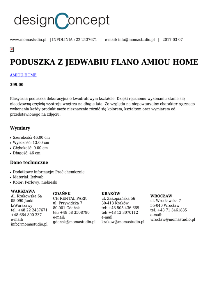 www.momastudio.pl | INFOLINIA.: 22 2437671 | e-mail: [email protected] | 2017-03-07 PODUSZKA Z JEDWABIU FLANO AMIOU HOME AMIOU HOME 399.00 Klasyczna poduszka dekoracyjna o kwadratowym kształcie. Dzięki ręcznemu wykonaniu stanie się nieodzowną częścią wystroju wnętrza na długie lata. Ze względu na niepowtarzalny charakter ręcznego wykonania każdy produkt może nieznacznie różnić się kolorem, kształtem oraz wymiarem od przedstawionego na zdjęciu. Wymiary ● ● ● ● Szerokość: 46.00 cm Wysokość: 13.00 cm Głębokość: 0.00 cm Długość: 46 cm Dane techniczne ● ● ● Dodatkowe informacje: Prać chemicznie Materiał: Jedwab Kolor: Perłowy, niebieski WARSZAWA Al. Krakowska 6a 05-090 Janki k/Warszawy tel: +48 22 2437671 +48 664 890 337 e-mail: [email protected] GDAŃSK CH RENTAL PARK ul. Przywidzka 7 80-001 Gdańsk tel: +48 58 3508790 e-mail: [email protected] KRAKÓW ul. Zakopiańska 56 30-418 Kraków tel: +48 505 436 669 tel: +48 12 3070112 e-mail: [email protected] WROCŁAW ul. Wrocławska 7 55-040 Wrocław tel: +48 71 3461885 e-mail: [email protected]