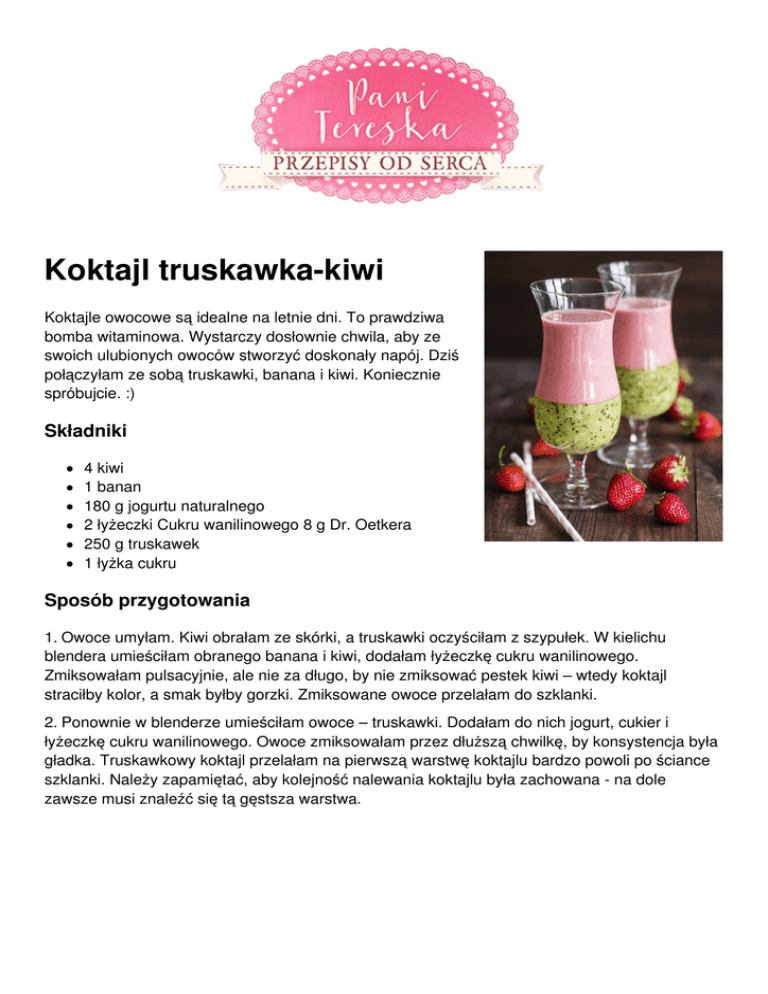 Koktajl truskawka-kiwi Koktajle owocowe są idealne na letnie dni. To prawdziwa bomba witaminowa. Wystarczy dosłownie chwila, aby ze swoich ulubionych owoców stworzyć doskonały napój. Dziś połączyłam ze sobą truskawki, banana i kiwi. Koniecznie spróbujcie. :) Składniki 4 kiwi 1 banan 180 g jogurtu naturalnego 2 łyżeczki Cukru wanilinowego 8 g Dr. Oetkera 250 g truskawek 1 łyżka cukru Sposób przygotowania 1. Owoce umyłam. Kiwi obrałam ze skórki, a truskawki oczyściłam z szypułek. W kielichu blendera umieściłam obranego banana i kiwi, dodałam łyżeczkę cukru wanilinowego. Zmiksowałam pulsacyjnie, ale nie za długo, by nie zmiksować pestek kiwi – wtedy koktajl straciłby kolor, a smak byłby gorzki. Zmiksowane owoce przelałam do szklanki. 2. Ponownie w blenderze umieściłam owoce – truskawki. Dodałam do nich jogurt, cukier i łyżeczkę cukru wanilinowego. Owoce zmiksowałam przez dłuższą chwilkę, by konsystencja była gładka. Truskawkowy koktajl przelałam na pierwszą warstwę koktajlu bardzo powoli po ściance szklanki. Należy zapamiętać, aby kolejność nalewania koktajlu była zachowana - na dole zawsze musi znaleźć się tą gęstsza warstwa.