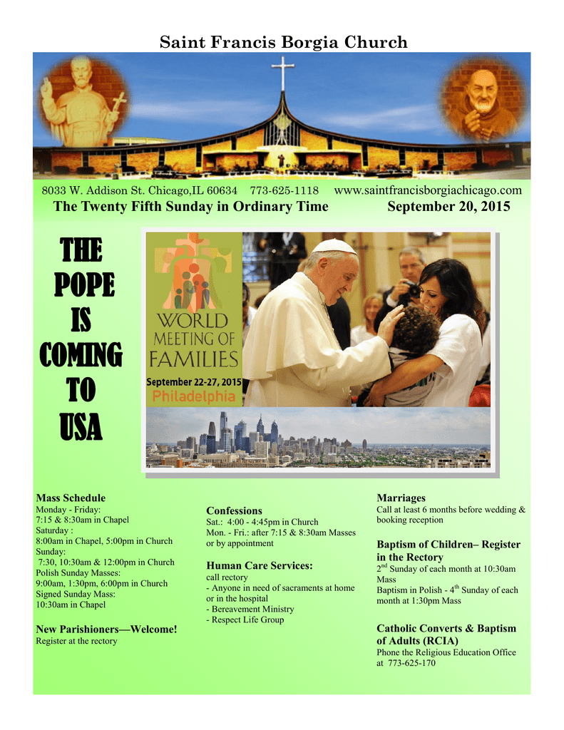 Saint Francis Borgia Church 8033 W. Addison St. Chicago,IL 60634 773-625-1118 www.saintfrancisborgiachicago.com The Twenty Fifth Sunday in Ordinary Time September 20, 2015 THE POPE IS COMING TO USA Mass Schedule Monday - Friday: 7:15 & 8:30am in Chapel Saturday : 8:00am in Chapel, 5:00pm in Church Sunday: 7:30, 10:30am & 12:00pm in Church Polish Sunday Masses: 9:00am, 1:30pm, 6:00pm in Church Signed Sunday Mass: 10:30am in Chapel New Parishioners—Welcome! Register at the rectory Marriages Confessions Sat.: 4:00 - 4:45pm in Church Mon. - Fri.: after 7:15 & 8:30am Masses or by appointment Human Care Services: call rectory - Anyone in need of sacraments at home or in the hospital - Bereavement Ministry - Respect Life Group Call at least 6 months before wedding & booking reception Baptism of Children– Register in the Rectory 2nd Sunday of each month at 10:30am Mass Baptism in Polish - 4th Sunday of each month at 1:30pm Mass Catholic Converts & Baptism of Adults (RCIA) Phone the Religious Education Office at 773-625-170 Saturday, September 19, 2015 8:00 Sophie Szeszol 5:00 Health & Birthday Blessings for John Caracci Considine Families Pamela Heider Stefano Butera Adam Perek on ann. of death Genowefa Chlopek Sunday, September 20, 2015 Twenty-fifth Sunday in Ordinary Time 7:30 Michael McDonagh Mary Hynes 9:00 Pamela Heider Czeslaw Sepko Jozefa Rypel w 1 rocz. smierci Aniela i Wladyslaw Cison Pawel Kwaterniak Jozef Kiwior w 20 rocz. smierci—intencja od corki Grazyny z rodzina Teresa i Witold Sokolowski O radosc wieczna w niebie w 60 dzien po smierci s.p. Janiny Suwalskiej Jozef Chmielowiec w rocz. smierci Andrzej Grzesiuk Jozefa Grzesiuk Antoni Grzesiuk Alina Tarchala Irena i Edward Zapala w 22 rocz. smierci Edwarda Helena, Wladyslaw, i Stanislaw Siwiec Marta Gulan Helena Debkowska 10:30 Giuseppe & Onelia Settefrati Wladyslaw Szczepankiewicz Teodoro DiFilippo Eduardo Cabrera on ann. of death Eugenia Mikolajczyk on 1st ann. of death Pamela Heider Gulio Mancini Gilda Antea Salvatore Antea Vincenzo Antea 12:00 Mary Gawel Judish Patano 1:30 Lech Rafajczak w 1 rocz. smierci Halina Malinowska w 3 rocz. smierci Tadeusz Panszczyk w 6 rocz. smierci Wladyslaw Nocon Marian Panszczyk Za dusze sw. pamieci Kazimierza Gajdur 6:00 Andrzej i Helena Wszelaki w 50 rocz. smierci oraz za zmarlych z rodziny Wszelaki Zbigniew Gniot Monday, September 21, 2015 - St. Matthew 7:15 All Our Sick & Homebound 8:30 Jozefa Rypel on 1 ann. of death Janina Suwalska Tuesday, September 22, 2015 7:15 For All Parishioners Living & Deceased 8:30 Frances & Mary Slowik Janina Suwalska Wednesday, September 23, 2015 - St. Pius of Pietrelcina 7:15 Most Forgotten Souls in Purgatory 8:30 Janina Suwalska Thursday, September 24, 2015 7:15 All Our Sick & Homebound 8:30 Janina Suwalska Friday, September 25, 2015 7:15 Angel Cruz 8:30 Janina Suwalska Saturday, September 26, 2015 8:00 Michael Kennedy Janina Suwalska 5:00 Helen Siek Sunday, September 27, 2015 Twenty-sixth Sunday in Ordinary Time 7:30 Frances Strang Jennie & Carlo Maggio 9:00 Do Matki Bozej Nieustajacej Pomocy z prosba o laski i pomoc w naszej rodzinie O zdrowie i Blog. Boze dla rodzin Barkow, Flunt, Markowicz, Nowalicki i Denys O zdrowie i Blog. Boze dla Stanislawa i Michaliny Mordarskich z okazji urodzin Halina Misiewicz aby dusza jej dostapila Milosierdzia Bozego i szczescia wiecznego— intemcja od pracownikow Celco Czeslaw Sepko Jozefa i Franciszek Rypel Kazimiera i Wladyslaw Sypien Pawel Kwaterniak Antoni Ptaszek Elzbieta Marciniak w 1 rocz. smierci Janina Suwalska Lukasz Garbacz Jozef Kamysz w rocz. smierci 10:30 Gilda & Salvatore Amantea Rosario Cabrera 12:00 For All Parishioners Living & Deceased 1:30 Ania Kosinska w 1 rocz. smierci Victoria Kotlinski w 1 rocz. smierci Helena, Wladyslaw i Stanislaw Siwiec 6:00 Jerzy Traczyk w 1 rocz. smierci St. Francis Borgia Craft Fair October 3, 2015 from 9:00am to 3:00pm Vendors Needed; Handmade Crafts Only Stoke Center 8025 W. Addison (Addison & Forest Preserve Drive, Chicago, IL 60634) Contact Pauline for an application: 773-625-2087 St. Francis Borgia Mission Statement “St. Francis Borgia nurtures the Roman Catholic Faith and fosters the gifts of the Holy Spirit in all by: Welcoming everyone into our faith community; Celebrating the sacraments together; Providing faith education; Providing an environment for prayerful meditation; Utilizing our time, talents and treasures. We resolve to develop, support, empower, and encourage individuals to reach their spiritual potential for the greater glory of God and the good of His people.” Members of our church community are serving our country in the various branches of the military. Please pray for all of them and their families and especially for those listed below. Matthew J. Albanese James Allision Paul Raymond Barthel Rev. Marcin Bulinski Christopher R. Burdulinski Joseph Vito Burdulinski Anthony L. Cammuca James D. Campis Jasper Catalano Kevin Chesney Robert Curtis Tamara DeCaro Shawn Gaffney Gerald Giovannelli Slawomir Glownia Michael Granadon Daniel Jarosz Joseph Patrick Kinney Frank Joseph Klimas James Labbe Tom Lewandowski Michael Labek Matt Manzano Tim McManus DAR NT CALEN VE PARISH E SUNDAY, September 20 9:00 Deaf Ministry ....................................... Chapel MONDAY, September 21 9:00 Crafters ...................................................... SC3 7:00 Parish Pastoral Council ............................. SC3 TUESDAY, September 22 9:00 Marian Movement ................................ Chapel 1:00 7:30 Rummage Sale Meeting.................................... SC3 Knights of Columbus ........................................ SC3 WEDNESDAY, September 23 THURSDAY, September 24 9:00 Deaf Ministry ............................................ SC2 2:45 Children’s Choir ................................... Church 6:00 Adult Choir .......................................... Church 7:00 Sacred Heart Prayer Service ................. Chapel FRIDAY, September 25 3:00 Divine 