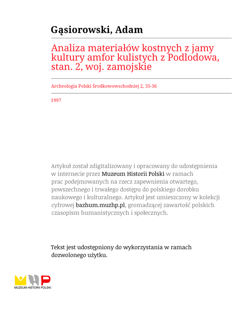 Archeologia Polski Środkowowschodniej, t. II, 1997 A d a m G ą s io r o w s k i A n a l iz a m a t e r ia ł ó w k o s t n y c h z j a m y k u l t u r y a m f o r k u l is t y c h z P o d l o d o w a , stan. 2 , w o j . z a m o js k ie N a w ie lo k u ltu ro w y m sta n o w isk u 2 w P o d lo d o w ie od k ry to w 1996 r. ja m ę k u ltu ry am fo r ku listy ch , w w y p ełn isk u której n a ró ż n y c h p o z io m a c h (poziom I - strop o b iek tu na g łę b o k o ści 60 -8 0 cm , p o zio m II - w arstw y sp ąg o w e n a g łę b o k o ści 110-135 cm ) w y stę p o w a ł k o stn y m ateria ł zw ie rzęc y (J. B a g iń sk a , H. Taras w tym tom ie). A n aliza g atu n k o w a sz c z ą tk ó w k o stn y c h w y k o n an a z o sta ła p rzy k o n su ltac ji pro f. M a rk a Jastrzę b sk ieg o z K a ted ry A n ato m ii A k ad e m ii R o ln iczej w L ublinie. P o zio m I - n a g łę b o k o ści 60 -7 0 cm odkry to u sz k o d zo n y k o n iec b liż sz y z fra g m en tem trz o n u p raw ej kości ra m ie n io w ej d zik a (Sus Scrofa ); - na głębokości 70-80 cm w ystąpiło 6 w iększych i licz ne drobne fragm enty k ości długich, 40 fragm entów ż e ber, 16 fragm entów p o k ry w y czaszki oraz około 50 m a ły ch nieokreślonych, ro zd ro b n io n y ch k ości ptaka, w iel k ości w rony lub kaczki. R a ze m z nim i znaleziono 6 p a liczków , kość p ię to w ą i sk o k o w ą oraz ło p atk ę p ra w ą i le w ą m ałego ssaka, b y ć m oże ow cy lub kozy ( Ovis-Capra ). Z e w zg lęd u n a stw ierd zo n y n a ło p atce n iesym etry czn y p rzebieg grzebienia n ależy w y k lu czy ć przynależność tych kości do p sa (i kopta, z re sztą praw d o p o d o b n ie nie zn an e go je sz c z e w ó w czas n a ziem iach polskich). P o zio m II - na g łę b o k o ści 110-120 cm zn a le zio n o kon iec b liż szy drugiej k o śc i śró d rę cz a d zik a i fra g m en t k o ści d łu giej n ie zid e n ty fik o w an e g o ptaka; - n a g łę b o k o ści 120-135 cm zn a jd o w ały się n asad y dalsze trzeciej i czw artej k o ści śró d sto p ia oraz 8 fra g m e n tó w trzo n ó w ty ch k o śc i, 4 k ości p alcó w i rac ica d z i L k a (Sus scrofa), a ta k ż e 2 p alicz k i k o zy -o w cy (Ovis-Cap ra). P alic zk i te p o tw ie rd z a ją o k reśle n ie w y stęp u jący ch w p o zio m ie I k o ści ja k o m a łe g o p rzeżu w acza. C zęść k o śc i z o stała p ra w d o p o d o b n ie p rze m iesza n a w p o sz cz eg ó ln y c h w a rstw a c h p rz e z d ro b n e ssaki żyjące lub m ające g n ia zd a p o d ziem ią. Z id en ty fik o w an ie k o ści z w ierzęcy ch o d krytych w j a m ie k u ltu ry a m fo r k u listy ch w P o d lo d o w ie stanow i d ro b n y p rzy c zy n ek do b a d a ń n a d h o d o w lą zw ie rząt i ło w ie c tw em u p raw ian y m i p rze z lu d n o ść tej kultury. M im o n a rastającej w o sta tn ic h la tach ilo ści m a teria łó w ź ró d ło w y ch , zn a jo m o ść ty ch za ję ć je s t n ad al n ie w y starcz ają ca. P rz e w a ż a ją c a d o tą d ilo ść k o stn y c h sz czątk ó w z w ie rzę cy ch p o ch o d zi z cm en tarzy sk , gdzie rep rez en tu ją albo z w ierzęta o fiarn e z w iązan e z o b rząd k iem pog rzeb o w y m , alb o resz tk i sk ład an eg o do g ro b u p o ż y w ie n ia m ięsn eg o (por. T. W iślań sk i 1979, s. 2 8 1 ). K o ści o w cy lub k ozy z P o d lo d o w a p o w ię k s z a ją - n ie lic z n ą p o z a K u jaw am i (M . S zm y t 1996, s. 176) w p o ró w n a n iu ze szczątk am i b y d ła lub św ini - ilo ść stan o w isk k u ltu ry am fo r kulistych, n a k tó ry ch stw ierd zo n o w y stę p o w a n ie m ały c h p rze żu w a czy. D z ik n a to m ia st re p re z e n tu je g a tu n e k sta n o w iąc y w ó w cza s b ard z o cz ęsty o b ie k t p o lo w a ń (T. W iślański 1979, s. 282). N iez id e n ty fik o w a n e k o śc i p ta k a p o c h o d z ą z o so b n ik a, k tó ry ró w n ież m ó g ł b y ć spożyty. N ie m o ż n a p rzy ty m w y k lu czy ć, że część p ta sic h k o śc i d łu g ich sta n o w i ła p o żą d an y su ro w iec do w y ro b u ró żn y c h p rzedm iotów . T akie p rzy k ła d y sp o ty k a m y w ze sp o ła ch ró żn y ch k ultu r n e o lity c zn y c h (por. m .in. J. G u rb a , A. K u ty ło w sk i 1970, P L. 152: 5, 7). it e r a t u r a B a g i ń s k a J., T a r a s H. 1997 Jam a kultury am for kulistych z Podlodow a, stan. 2, gm. Ł aszczów , w tym tom ie. G u r b a J., K u t y ł o w s k i A. 1970 Sepulture nr 4, S trzyżów 2A, distr. D e H rubie szów, Inv. A rch., fasc. 25, P L 152. S z m y t M. 1996 Spoteczności kultury amfor kulistych na Kuja wach, Poznań. W i ś l a ń s k i T. 1979 D alszy rozw ój ludów neolitycznych. P lem iona kultury am for kulistych, PZPol., t. 2, s. 261-300. 36 A dam A G dam G ą s io r o w s k i ą s io r o w s k i A nalysys o f B one in M P a t e r ia l f r o m a odlodów , S it e The bone material was found in two strata, on tne depoths o f 60-80 cm and 110-135 cm. It consisted o f a bone o f a boar K a te d ra A rc h e o lo g ii U M C S w L u b lin ie P it o f 2, Z G a m ość lobural V A m ph o ra e C ulture o iv o d s h ip (Sus scrofa), numerous fragments o f bones o f an unidentifield bird, and bones a sheep or a goat (Ovis-Capra).
