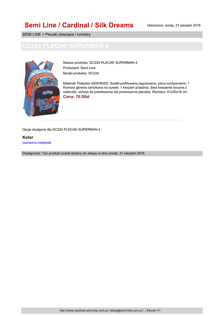 Semi Line / Cardinal / Silk Dreams Utworzono: środa, 31 sierpień 2016 SEMI LINE > Plecaki dziecięce / tornistry DC224 PLECAK SUPERMAN 4 Nazwa produktu: DC224 PLECAK SUPERMAN 4 Producent: Semi Line Model produktu: DC224 Materiał: Poliester 420D/600D. Szelki-profilowane,regulowane; plecy-usztywniane; 1 Komora głowna zamykana na suwak; 1 kieszeń przednia; dwie kieszenie boczne z siateczki; uchwyt do powieszenia lub przenosznia plecaka; Wymiary: 41x30x18 cm Cena: 76.00zł Opcje dostępne dla DC224 PLECAK SUPERMAN 4 : Kolor czerwono-niebieski. Dostępność: Ten produkt został dodany do sklepu w dniu środa, 31 sierpień 2016 http://www.cardinal.semi-line.com.pl | [email protected] | | Strona 1/1