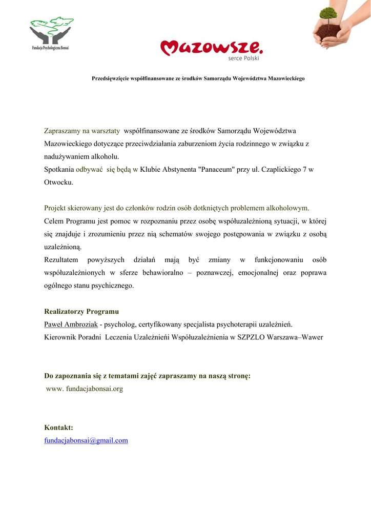 Przedsięwzięcie współfinansowane ze środków Samorządu Województwa Mazowieckiego Zapraszamy na warsztaty współfinansowane ze środków Samorządu Województwa Mazowieckiego dotyczące przeciwdziałania zaburzeniom życia rodzinnego w związku z nadużywaniem alkoholu. Spotkania odbywać się będą w Klubie Abstynenta "Panaceum" przy ul. Czaplickiego 7 w Otwocku. Projekt skierowany jest do członków rodzin osób dotkniętych problemem alkoholowym. Celem Programu jest pomoc w rozpoznaniu przez osobę współuzależnioną sytuacji, w której się znajduje i zrozumieniu przez nią schematów swojego postępowania w związku z osobą uzależnioną. Rezultatem powyższych działań mają być zmiany w funkcjonowaniu osób współuzależnionych w sferze behawioralno – poznawczej, emocjonalnej oraz poprawa ogólnego stanu psychicznego. Realizatorzy Programu Paweł Ambroziak - psycholog, certyfikowany specjalista psychoterapii uzależnień. Kierownik Poradni Leczenia Uzależnieńi Współuzależnienia w SZPZLO Warszawa–Wawer Do zapoznania się z tematami zajęć zapraszamy na naszą stronę: www. fundacjabonsai.org Kontakt: [email protected]