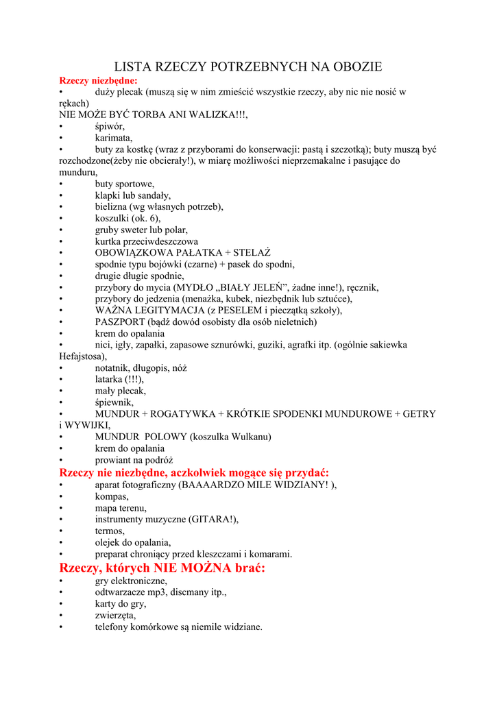 LISTA RZECZY POTRZEBNYCH NA OBOZIE