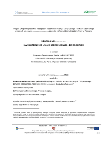 Wspólna praca Nas wzbogaca ! Projekt „Wspólna praca Nas wzbogaca!” współfinansowany z Europejskiego Funduszu Społecznego w ramach umowy nr …………………………….. zawartej z Wojewódzkim Urzędem Pracy w Poznaniu UMOWA NR ……………… NA ŚWIADCZENIE USŁUG SZKOLENIOWO – DORADCZYCH w ramach Programu Operacyjnego Kapitał Ludzki 2007-2013 Priorytet VII – Promocja integracji społecznej Poddziałania 7.2.2 PO KL Wsparcie ekonomii społecznej zawarta w Poznaniu ………………2011r. pomiędzy: Stowarzyszeniem na Rzecz Spółdzielni Socjalnych z siedzibą w Poznaniu przy ul. Chłapowskiego 15/1 KRS 0000167905, REGON 634500631, zwanym dalej „Beneficjentem”, reprezentowanym przez: 1) Przemysława Piechockiego, Prezesa Zarządu, 2) Jagodę Paluch – Wiceprezesa Zarządu. a (pełne dane Beneficjenta pomocy), zwanym dalej „Beneficjentem pomocy 1” Strony uzgodniły, co następuje: 1 Uczestnik projektu staje się Beneficjentem pomocy (otrzymuje pomoc publiczną) w momencie zarejestrowania działalności gospodarczej. Z uwagi na założenie, według którego celem projektu jest rozpoczęcie działalności gospodarczej przez jego uczestników, Instytucja Pośrednicząca posługuje się pojęciem Beneficjenta pomocy również w odniesieniu do uczestników, którzy są dopiero na etapie szkolenia podstawowego, wprowadzającego do rejestracji działalności gospodarczej. CZŁOWIEK – NAJLEPSZA INWESTYCJA Wojewódzki Urząd Pracy w Poznaniu Instytucja Pośrednicząca II stopnia Projekt współfinansowany przez Unię Europejską w ramach Europejskiego Funduszu Społecznego str. 1 Wspólna praca Nas wzbogaca ! §1 Przedmiot umowy 1. Przedmiotem niniejszej umowy jest udzielenie przez Beneficjenta, Beneficjentowi pomocy wsparcia w formie nieodpłatnych usług szkoleniowo-doradczych, dotyczących zagadnień związanych z założeniem i prowadzeniem spółdzielni socjalnej. 2. Wsparcie szkoleniowo-doradcze dzieli się na: 1) podstawowe – udzielane do dnia zarejestrowania przez Beneficjenta pomocy działalności gospodarczej (spółdzielni socjalnej), 2) specjalistyczne – udzielane od dnia zarejestrowania przez Beneficjenta pomocy działalności gospodarczej (spółdzielni socjalnej). 3. Wsparcie będące przedmiotem niniejszej umowy udzielane jest: 1) w zakresie objętym programem bloku szkoleniowo-doradczego, 2) w przypadku wsparcia szkoleniowo-doradczego specjalistycznego – dodatkowo w oparciu o pomoc de minimis, zgodnie z rozporządzeniem Ministra Rozwoju Regionalnego z dnia 15 grudnia 2010 r. (Dz.U. Nr 239, poz.1598) w sprawie udzielania pomocy publicznej w ramach Programu Operacyjnego Kapitał Ludzki 4. Beneficjent pomocy otrzymuje wsparcie szkoleniowo-doradcze na zasadach i warunkach określonych w niniejszej umowie. §2 Okres udzielania wsparcia szkoleniowo - doradczego Wsparcie szkoleniowo-doradcze udzielane jest w okresie realizacji projektu, tj. od dnia ................................ do dnia .................................................... §3 Podstawowe wsparcie szkoleniowo - doradcze - postanowienia szczegółowe 1. Podstawowe wsparcie szkoleniowo-doradcze nie jest objęte regułami dotyczącymi udzielania pomocy publicznej 2. Zakres wsparcia szkoleniowo-doradczego ustalany jest przez Beneficjenta na podstawie: 1) formularza rekrutacyjnego Beneficjenta pomocy; 2) diagnozy potrzeb szkoleniowo-doradczych Beneficjenta pomocy; 3) innych uzasadnionych kryteriów stosowanych przez Beneficjenta w procesie rekrutacji. CZŁOWIEK – NAJLEPSZA INWESTYCJA Wojewódzki Urząd Pracy w Poznaniu Instytucja Pośrednicząca II stopnia Projekt współfinansowany przez Unię Europejską w ramach Europejskiego Funduszu Społecznego str. 2 Wspólna praca Nas wzbogaca ! 3. Na podstawie dokumentów, o których mowa w ust. 2 Beneficjent: 1) dokonuje wyboru Beneficjentów pomocy do projektów; 2) sporządza raport z wyboru; 3) określa potrzeby szkoleniowo-doradcze dla Beneficjenta pomocy. 4. Liczba godzin usług szkoleniowych, lub doradczych świadczona na rzecz Beneficjenta pomocy, potwierdzana jest podpisem Beneficjenta pomocy, złożonym w dniu korzystania z usługi na Liście obecności. 5. Udział Beneficjenta pomocy w podstawowym wsparciu szkoleniowo-doradczym, w zakresie i w czasie określonym przez Beneficjenta, potwierdzony zgodnie z ust. 4, jest podstawowym warunkiem starania się o wsparcie pomostowe i jednorazową dotację inwestycyjną na rozwój działalności. §4 Specjalistyczne wsparcie szkoleniowo - doradcze - postanowienia szczegółowe 1. Specjalistyczne wsparcie szkoleniowo - doradcze jest objęte regułami dotyczącymi udzielania pomocy publicznej i jest udzielane w oparciu o pomoc de minimis, zgodnie z rozporządzeniem, o którym mowa w § 1 ust. 3 pkt. 2. 2. Beneficjent pomocy zobowiązany jest do niezwłocznego powiadomienia Beneficjenta o zarejestrowaniu działalności gospodarczej (spółdzielni socjalnej) i podpisania odpowiedniego aneksu do niniejszej Umowy. 3. Aneks, o którym mowa w ust. 2 obejmuje w szczególności: 1) zestawienie pomocy publicznej otrzymanej przez Beneficjenta pomocy w ramach pomocy de minimis, 2) zakres tematyczny, czas trwania i realizacji, wartość usług szkoleniowo-doradczych świadczonych na rzecz Beneficjenta pomocy od dnia zarejestrowania przez niego działalności gospodarczej. 4. Wartość specjalistycznego wsparcia szkoleniowo-doradczego, o którym mowa w ust. 3 pkt 2 powinna być wyceniona przez Beneficjenta w oparciu o koszty projektu w tym zakresie. 5. Beneficjent, w dniu podpisania aneksu, o którym mowa w ust. 2, zobowiązany jest wydać Beneficjentowi pomocy zaświadczenie o udzielonej pomocy de minimis, zgodnie z rozporządzeniem Rady Ministrów z 26 stycznia 2011 r. zmieniające rozporządzenie w sprawie zaświadczeń o pomocy de minimis i pomocy de minimis w rolnictwie i rybołówstwie (Dz. U. z 2011 r. Nr 34, poz. 174). 6. Beneficjent pomocy zobowiązany jest przechowywać dokumentację związaną