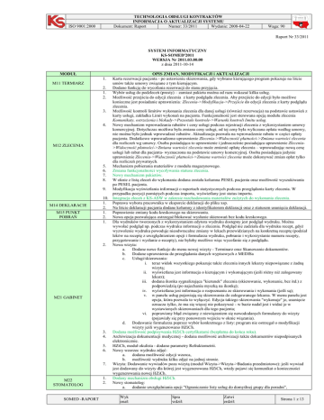 TECHNOLOGIA OBSŁUGI KONTRAKTÓW INFORMACJA O AKTUALIZACJI SYSTEMU Dokument: Raport Numer: 33/2011 Wydanie: 2008-04-22 ISO 9001:2000 Waga: 90 Raport Nr 33/2011 SYSTEM INFORMATYCZNY KS-SOMED'2011 WERSJA Nr 2011.03.00.00 z dnia 2011-10-14 MODUŁ OPIS ZMIAN, MODYFIKACJI i AKTUALIZACJI Karta rezerwacji pacjenta - po ustawieniu skierowania, gdy wybrano kierującego program pokazuje na liście umów także umowy związane z tym kierującym. 2. Dodano funkcję do wycofania rezerwacji do stanu przyjęcia. 1. Wybór usług do podzleceń (prosty) – zamiast pakietu można od razu wskazać kilka usług. 2. Możliwość przejścia do edycji zlecenia z karty podglądu zlecenia. Aby przejście do edycji było możliwe konieczne jest posiadanie uprawnienia: Zlecenia->Modyfikacja->Przejście do edycji zlecenia z karty podglądu zlecenia. 3. Możliwość kontroli limitów wykonania zlecenia dla danej usługi (również rezerwacja) na podstawie ustawień z karty usługi, zakładka Limit wykonań na pacjenta. Funkcjonalność jest sterowana opcją modułu zlecenia Komunikaty, ostrzeżenia i blokady->Pozostałe kontrole->Warunki kontroli limitu usług. 4. Nowy mechanizm wprowadzania rabatów i ceny usługi podczas rejestracji zlecenia z wykorzystaniem umowy komercyjnej. Dotychczas możliwa była zmiana ceny usługi, od tej ceny była wyliczana opłata według umowy, nie można było jednak wprowadzać rabatów. Aktualizacja pozwala na wprowadzenie rabatu w części opłaty pacjenta. Dodatkowo wprowadzono uprawnienie Zlecenia->Widoczność płatności->Zmiana wartości zlecenia dla rozliczeń wg umowy. Osoba posiadająca to uprawnienie i jednocześnie posiadająca uprawnienie Zlecenia>Widoczność płatności->Zmiana wartości zlecenia może zmienić opłatę zlecenia – wprowadzając nową cenę usługi lub rabat dla pacjenta- wyznaczona na podstawie umowy komercyjnej. Osoba posiadająca jedynie uprawnienie Zlecenia->Widoczność płatności->Zmiana wartości zlecenia może dokonywać zmian opłat tylko dla rozliczeń prywatnych. 5. Mechanizm pobierania materiałów z modułu magazynowego. 6. Zmiana funkcjonalności wycofywania statusu zlecenia. 7. Nowy mechanizm pakietów. 8. W oknie z listą zleceń do wykonania dodana została kolumna PESEL pacjenta oraz możliwość wyszukiwania po PESEL pacjenta. 9. Modyfikacja wyświetlania informacji o raportach statystycznych podczas przeglądania karty zlecenia. W przypadku pozycji pomiętych podczas importu, wyświetlany jest status importu. 10. Integracja zleceń z KS-ASW w zakresie rozchodowania materiałów zużytych do wykonania zlecenia. 1. Poprawa wyboru pracownika w eksporcie deklaracji do pliku xsp. 2. Na liście deklaracji pacjenta dodane kolumny z identyfikatorem deklaracji oraz z statusem usunięcia deklaracji. 1. Poprawienie zmiany kodu kreskowego na skierowaniu. 2. Nowa opcja pozwalająca ostrzegać/blokować wysłanie skierowań bez kodu kreskowego. 1. Dla wydruków tworzonych z wykorzystaniem edytora wydruku dostępny jest podgląd wydruku. Można wywołać podgląd np. podczas wydruku informacji o zleceniu. Podgląd nie zadziała dla wydruku recept, gdyż wyzwolenie wydruku powoduje nieodwracalne zmiany w lekach przewidzianych na konkretną receptę (podział leków na receptę z uwzględnieniem opcji i formularza wydruku, pobranie i wykorzystanie numeru recepty, przygotowanie i wysłanie e-recepty), nie byłoby możliwe więc wycofanie się z podglądu. 2. Nowa wizyta: a. Dodane nowe funkcje do menu nowej wizyty - Terminarz oraz Skanowanie dokumentów. b. Dodane uprawnienia do przeglądania danych wypisowych z MEDISa c. Usługi/skierowania: i. teraz widok wszystkiego pokazuje także zlecenia innych lekarzy niepowiązane z żadną wizytą; ii. wyświetlana jest informacja o kierującym i wykonującym (jeśli różny niż zalogowany lekarz); iii. dodana ikonka sygnalizująca "kierunek" zlecenia (skierowanie, wykonanie, bez itd.) z podpowiedzią (po najechaniu myszką na ikonkę); iv. wyświetlana jest informacja o rozpoznaniu ze skierowania i wykonania (jeśli są); v. w panelu usług pojawiają się skierowania do zalogowanego lekarza. W menu panelu jest opcja, która pozwala to wyłączyć. Edycja takiego skierowania "wykonuje" je, usunięcie oznacza tylko, że ma się więcej nie pokazywać - w bazie nadal jest i widać je w wystawionych skierowaniach dla tego pacjenta; vi. poprawiony błąd związany z niewiązaniem się nowododanych formularzy do wizyty (pojawiały się przy ponownym wejściu w oknie wiązania). d. Dodawanie formularza poprzez wybór konkretnego z listy: program nie ostrzegał o modyfikacji wizyty jeśli wygenerowano HZiCh. 3. Dodana możliwość podpisywania HZiCh certyfikatami (bezpłatna do końca roku). 4. Archiwizacja dokumentacji medycznej - dodana możliwość archiwizacji także dokumentów niepodpisanych elektronicznie. 5. HZiCh, moduł okulista - dodano parametry Refraktometrii. 6. Nowy wzorzec wydruku zdjęć: a. dodana możliwość edycji wzorca, b. możliwość wydruku kilku zdjęć na jednej stronie. 7. Wizyta: Dodawanie wywiadów poza wizytą (moduł Wizyta->Wizyta->Badania przedmiotowe): jeśli wywiad jest dodawany do wizyty dla której jest wygenerowana HZiCh, wtedy pojawi się komunikat o konieczności wygenerowania nowej HZiCh. 1. Dodany mechanizm obsługi HZiCh. 2. Nowy stomatolog: a. dodanie uwzględniania opcji "Ograniczanie listy usług do domyślnej grupy dla poradni", 1. M11 TERMIARZ M12 ZLECENIA M14 DEKLARACJE M15 PUNKT POBRAŃ M21 GABINET M22 STOMATOLOG SOMED -RAPORT Wyk onał: Spra wdził: Zatwi erdził: Strona 1 z 13 TECHNOLOGIA OBSŁUGI KONTRAKTÓW INFORMACJA O AKTUALIZACJI SYSTEMU Dokument: Raport Numer: 33/2011 Wydanie: 2008-04-22 ISO 9001:2000 Waga: 90 b. 3. 1. M35 RIS M42 UMOWY 2. 3. 1. 2. 1. M51 ZESTAWIENIA 2. 3. 1. 2. 3. 4. 5. 6. 7. 8. M53 ROZLICZENIA 9. 10. 11. 12. 13. 14. 15. M55 KASA 1. 2. 3. SOMED -RAPORT dodanie możliwości filtrowania zabiegów do wybranej grupy (domyślnie w przypad