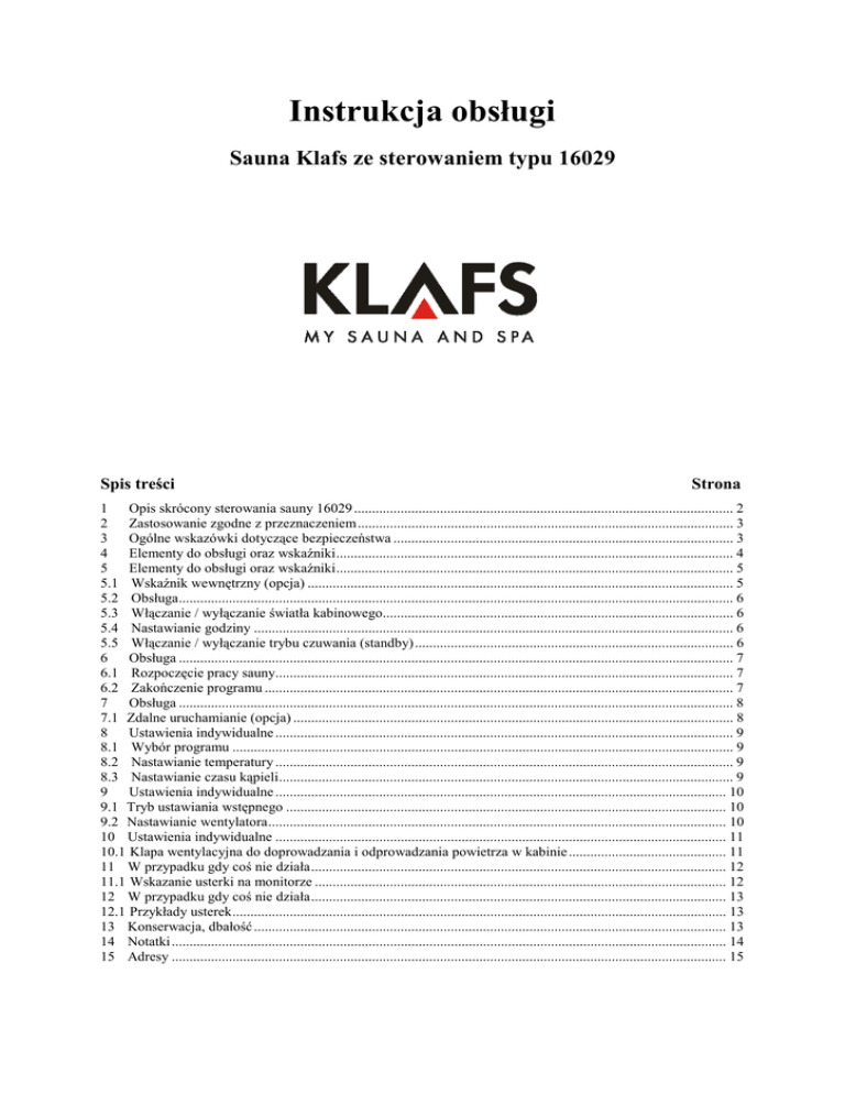 Instrukcja obsługi Sauna Klafs ze sterowaniem typu 16029 Spis treści Strona 1 Opis skrócony sterowania sauny 16029 .......................................................................................................... 2 2 Zastosowanie zgodne z przeznaczeniem ......................................................................................................... 3 3 Ogólne wskazówki dotyczące bezpieczeństwa ............................................................................................... 3 4 Elementy do obsługi oraz wskaźniki ............................................................................................................... 4 5 Elementy do obsługi oraz wskaźniki ............................................................................................................... 5 5.1 Wskaźnik wewnętrzny (opcja) ....................................................................................................................... 5 5.2 Obsługa ........................................................................................................................................................... 6 5.3 Włączanie / wyłączanie światła kabinowego.................................................................................................. 6 5.4 Nastawianie godziny ...................................................................................................................................... 6 5.5 Włączanie / wyłączanie trybu czuwania (standby) ......................................................................................... 6 6 Obsługa ........................................................................................................................................................... 7 6.1 Rozpoczęcie pracy sauny................................................................................................................................ 7 6.2 Zakończenie programu ................................................................................................................................... 7 7 Obsługa ........................................................................................................................................................... 8 7.1 Zdalne uruchamianie (opcja) ........................................................................................................................... 8 8 Ustawienia indywidualne ................................................................................................................................ 9 8.1 Wybór programu ............................................................................................................................................ 9 8.2 Nastawianie temperatury ................................................................................................................................ 9 8.3 Nastawianie czasu kąpieli ............................................................................................................................... 9 9 Ustawienia indywidualne .............................................................................................................................. 10 9.1 Tryb ustawiania wstępnego ........................................................................................................................... 10 9.2 Nastawianie wentylatora ................................................................................................................................ 10 10 Ustawienia indywidualne .............................................................................................................................. 11 10.1 Klapa wentylacyjna do doprowadzania i odprowadzania powietrza w kabinie ............................................ 11 11 W przypadku gdy coś nie działa .................................................................................................................... 12 11.1 Wskazanie usterki na monitorze ................................................................................................................... 12 12 W przypadku gdy coś nie działa .................................................................................................................... 13 12.1 Przykłady usterek .......................................................................................................................................... 13 13 Konserwacja, dbałość .................................................................................................................................... 13 14 Notatki ........................................................................................................................................................... 14 15 Adresy ........................................................................................................................................................... 15 sauna __________________________________________________________________________________________ 1 Opis skrócony sterowania sauny 16029 Sterowanie sauny Klafs daje Państwu moŜliwość komfortowej eksploatacji Państwa sauny. Korzystając z urządzenia mają Państwo do dyspozycji trzy zaprogramowane na stałe standardowe programy. Zmiany ustawień w programie standardowym zapisywane są poprzez stworzenie programu indywidualnego. Wszystkie parametry robocze, jak temperatura, godzina rozpoczęcia, długość pracy moŜna zmieniać przed pracą i podczas pracy sauny w ramach obszarów nastawczych poprzez klawiaturę. monitor ciekło-krystaliczny włącznik / wyłącznik główny klawiatura Rodzaj kąpieli: Tryb SAUNY SAUNA o temperaturach od 85 – 100 ºC i niskiej względnej wilgotności powietrza. KĄPIEL W GORĄCYM POWIETRZU o szczególnie łagodnym klimacie, temperaturach od 45 – 60 ºC i względnej wilgotności powietrza do ok. 20 %. ZaŜywanie kąpieli w Państwa saunie Klafs ma słuŜyć Państwa zdrowiu i profila