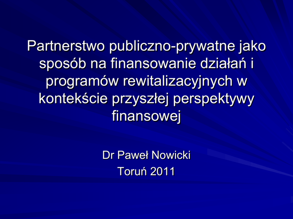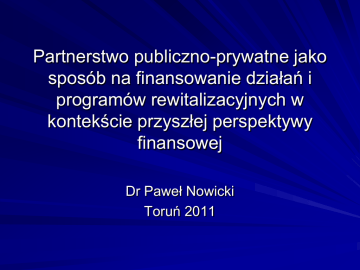 Partnerstwo publiczno-prywatne jako sposób na finansowanie działań i programów rewitalizacyjnych w kontekście przyszłej perspektywy finansowej Dr Paweł Nowicki Toruń 2011 Partnerstwo publiczno-prywatne: to współpraca sektora prywatnego i publicznego mająca na celu wspólną realizację przedsięwzięć lub świadczenie usług, tradycyjnie dostarczanych przez sektor publiczny. Dr Paweł Nowicki, UMK Przedmiot PPP: Przedmiotem partnerstwa publicznoprywatnego jest wspólna realizacja przedsięwzięcia oparta na podziale zadań i ryzyk pomiędzy podmiotem publicznym i partnerem prywatnym. (art. 1 ust 2 ustawy z dnia 19 grudnia 2008 r. o partnerstwie publiczno-prywatnym) Dr Paweł Nowicki, UMK Partnerstwo publiczno-prywatne W perspektywie finansowej 2014-2020 PPP ma być głównym instrumentem zapewniającym sprawną realizację projektów, a tym samym sprawną absorpcję środków unijnych. Dr Paweł Nowicki, UMK Korzyści wynikające z PPP: pozyskanie nowego kapitału na inwestycje, alternatywne umiejętności w zakresie zarządzania i wdrażania, duża wartość dodana, optymalizacja ryzyka, value for money. Dr Paweł Nowicki, UMK Dziękuję za uwagę. Toruń, 2011 Dr Paweł Nowicki, UMK