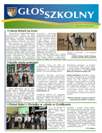 Nr 15 / 2 / 2012/2013 Lekcja historii na żywo 18 stycznia w Szkole Podstawowej w Strzyżowicach odbyła się lekcja historii na żywo – pokaz rycerski. Dwaj prowadzący ja panowie opowiedzieli nam historię rycerstwa. Powiedzieli, czym dawniej zajmowali się rycerze i jaką bronią się posługiwali. Dowiedzieliśmy się o pasowaniu na rycerza, jak ono wyglądało i kto brał w nim udział. Przedstawiono też postać najsłynniejszego polskiego rycerza – Zawiszy Czarnego. Mogliśmy zobaczyć prawdziwe zbroje, które rycerze nosili w czasie walk. Były one grube i bardzo ciężkie. Najciekawszą częścią była jednak symulacja walki rycerskiej, w której, posługując się prawdziwymi mieczami i używając prawdziwych tarcz, wzięli udział: nasz nauczyciel wfu, pan Przemek Wach, ksiądz Janusz Kania i Łukasz Nalepa – uczeń. Każdy z nas mógł również wystąpić z prowadzącymi na scenie. Wystarczyło tylko poprawnie odpowiedzieć na kilka pytań. Na końcu mogliśmy dokładniej przyjrzeć się pokazu o rycerzach, o ich hojności broni i zbrojom, dotknąć ich, a nawet i braterstwie. założyć. Ta nietypowa lekcja historii Emilka Terlecka i Julia Ciemięga, była bardzo ciekawa i pouczająca. uczennice kl.IVb, SP Strzyżowice Myślę, że długo nie zapomnimy tego Każdy może pomagać Nasze gimnazjum, jak co roku wzięło udział w ogólnopolskiej akcji WOŚP. Wielu uczniów pragnęło wesprzeć tą niezwykłą akcję, aby pomagać innym. W tym roku z naszej szkoły kwestowało 34 wolontariuszy, a nasz sztab zebrał 5486,31zł dla ratowania życia dzieci i godnej opieki medycznej seniorów. Bardzo cieszy nas fakt, że wolontariatem zainteresowanych jest wiele osób. Zapytałyśmy wolontariuszy, co sądzą o całej akcji WOŚP i czy warto pomagać innym. Zbierałyśmy pieniądze na lotnisku w Pyrzowicach, gdzie nawet ludzie z innych krajów wspomagali polską akcję charytatywną. - opowiadają Ola Klimczyk i Asia Krzystyniak z 3b. Pomagam dlatego, ponieważ uważam, że warto dać cząstkę siebie innym. Podczas całego dnia zbierania pieniędzy panowała miła i sympatyczna atmosfera. Pogoda i humor nam dopisywały. Jesteśmy z koleżankami bardzo szczęśliwe, że możemy pomagać potrzebującym. Z pewnością następnym razem też przyłączę się do WOŚP-u. - mówi Sandra Kogut z 2c. Paulina Kamińska z 3a dodaje - Sądzę, że akcje charytatywne to wspaniała okazja, aby dzięki odrobinie wysiłku zrobić coś dla kogoś innego. Pomaganie innym sprawia, że czujemy się lepsi - świadomość, że swoją siłę przekazujemy tym, którzy jej nie mają, jest naprawdę budująca. Ja wraz z moimi koleżankami mimo siarczystego mrozu zbierałyśmy pieniądze przez cały dzień i wiedziałyśmy, że robimy to w słusznej sprawie. Pomaganie ludziom jest naprawdę ważne, więc akcje takie jak WOŚP są potrzebne. Nigdy nie wiadomo, czy właśnie ty, czy może ktoś znajomy lub z rodziny znajdzie się w potrzebie. Wiktoria Jędrusik i Patrycja Frydrych wolontariuszki WOŚP z GimPsary Dzień Babci i Dziadka w szkole w Gródkowie 21 i 22 stycznia to najpiękniejsze dni w roku - święto Babci i Dziadka. Babcia i Dziadziuś to słowa, które każdemu dziecku kojarzą się z ciepłem, miłością i wszystkim co dobre. Z tej okazji uczniowie klas I–III zaprosili do szkoły swoje babcie i dziadków, aby podziękować im za wszystko i wyrazić swoją miłość. Dzieci przygotowały część artystyczną, na której zaprezentowały swoje umiejętności recytatorskie, wokalne oraz taneczne. Miłym zakończeniem spotkania był wspólny słodki poczęstunek okraszony upominkami zrobionymi własnoręcznie przez dzieci. Goście byli bardzo wzruszeni występami wnucząt i w nie jednym oku zakręciła się łezka. Wszystkim Babciom i Dziadkom ten dzień na długo pozostanie w pamięci SP Gródków 10 GŁOS SZKOLNY Byliśmy wolontariuszami WOŚP chętnie wrzucali do niej pieniążki. Uzbierałem aż 280 zł. Mikołaj Bizan, przedszkolak z Dąbia Kwestowałem wraz z rodzicami. Moja puszka zapełniła się w ciągu godziny. Oprócz pieniędzy trafił do n i e j z ł o t y pierścionek wrzucony przez młodego chłopaka. To był niezwykły gest! Łącznie zebrałem ok. 300 zł. Moi koledzy znajdywali w puszkach oprócz złotówek euro, funty monety z zamku siewierskiego, a nawet wejściówki do muzeum. Patryk Pawlik, kl. III SP w Dąbiu Już po raz 11 uczniowie ze SP w Dąbiu grali w WOŚP. W tegorocznym sztabie znalazło się 62 wolontariuszy. Zebrana przez nich kwota 14,5 tysięcy zł zasili konto Orkiestry i zostanie przeznaczona na ratowanie życia dzieci i seniorów. Kilku wolontariuszy poprosiliśmy o krótkie podsumowanie styczniowego finału. W pracę charytatywną angażuję się z potrzeby serca i chęci pomagania Byłem najmłodszym wolontariuszem innym. Wiem, że fundacja właściwie w Dąbiu. Pieniądze do puszki zbierałem wydaje uzbierane środki, znam dzieci, ze starszym bratem i koleżanką. Trochę którym sprzęt zakupiony przez WOŚP zmarzłem, ale jestem zadowolony. uratował życie. Dlatego, mimo że mam Moja puszka była ciężka, bo wszyscy dopiero 10 lat, wolontariuszką byłam po raz trzeci. Z wielką radością przekazałam na rzecz fundacji Jurka Owsiaka uzbieraną w tym roku kwotę 1220,16 zł Oliwia Wiązek, kl. IV SP w Dąbiu WOŚP to co roku dla mnie wielka przygoda. Wraz z innymi nauczycielami chętnie pomagam uczniom w zbieraniu pieniążków. Od lat wspiera nas OSP z Dąbia, a ostatnio również OSP Goląsza-Brzękowice. Jesteśmy strażakom bardzo wdzięczni, bo dzięki nim nasi wolontariusze są bardziej widoczni i rozpoznawalni. Cieszę się, że mogę brać udział w tak ważnym przedsięwzięciu. Karina Bizan, nauczycielka SP w Dąbiu Wolontariusze z Dąbia są niestrudzeni. Udowodnili to, gdy po całodniowej zbiórce niemal w komplecie pojawili się na finale gminnym przed Urzędem w Psarach, gdzie zaprezentowali się w popisowym tańcu. W ten sposób 