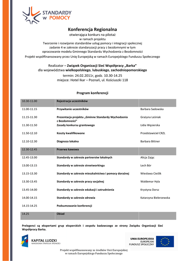 Konferencja Regionalna otwierająca konkurs na pilotaż w ramach projektu Tworzenie i rozwijanie standardów usług pomocy i integracji społecznej zadanie 4 w zakresie standaryzacji pracy z bezdomnymi w tym opracowanie modelu Gminnego Standardu Wychodzenia z Bezdomności Projekt współfinansowany przez Unię Europejską w ramach Europejskiego Funduszu Społecznego Realizator – Związek Organizacji Sieć Współpracy „Barka” dla województwa wielkopolskiego, lubuskiego, zachodniopomorskiego termin: 24.02.2011r, godz. 10.30-14.25 miejsce: Hotel Ikar – Poznań, ul. Kościuszki 118 Program konferencji 10.30-11.00 Rejestracja uczestników 11.00-11.15 Przywitanie uczestników Barbara Sadowska 11.15-11.30 Grażyna Leśniak 11.30-11.50 Prezentacja projektu „Gminne Standardy Wychodzenia z Bezdomności” Zasady konkursu grantowego Lidia Węsierska 11.50-12.10 Koszty kwalifikowane Przedstawiciel CRZL 12.10-12.30 Diagnoza lokalna Barbara Bittner 12.30-12.45 Przerwa kawowa 12.45-13.00 Standardy w zakresie partnerstw lokalnych Alicja Zając 13.00-13.15 Standardy w zakresie streetworkingu Lech Bór 13.15-13.30 Standardy w zakresie mieszkalnictwa i pomocy doraźnej Wiesława Cieślik 13.30-13.45 Standardy w zakresie pracy socjalnej Waldemar Hyla 13.45-14.00 Standardy w zakresie edukacji i zatrudnienia Krystyna Dorsz 14.00-14.15 Standardy w zakresie zdrowia Katarzyna Bielerzewska 14.15-14.25 Podsumowanie konferencji 14.25 Obiad Prelegenci są ekspertami grup eksperckich i zespołu badawczego ze strony Związku Organizacji Sieć Współpracy Barka. Projekt współfinansowany ze środków Unii Europejskiej w ramach Europejskiego Funduszu Społecznego