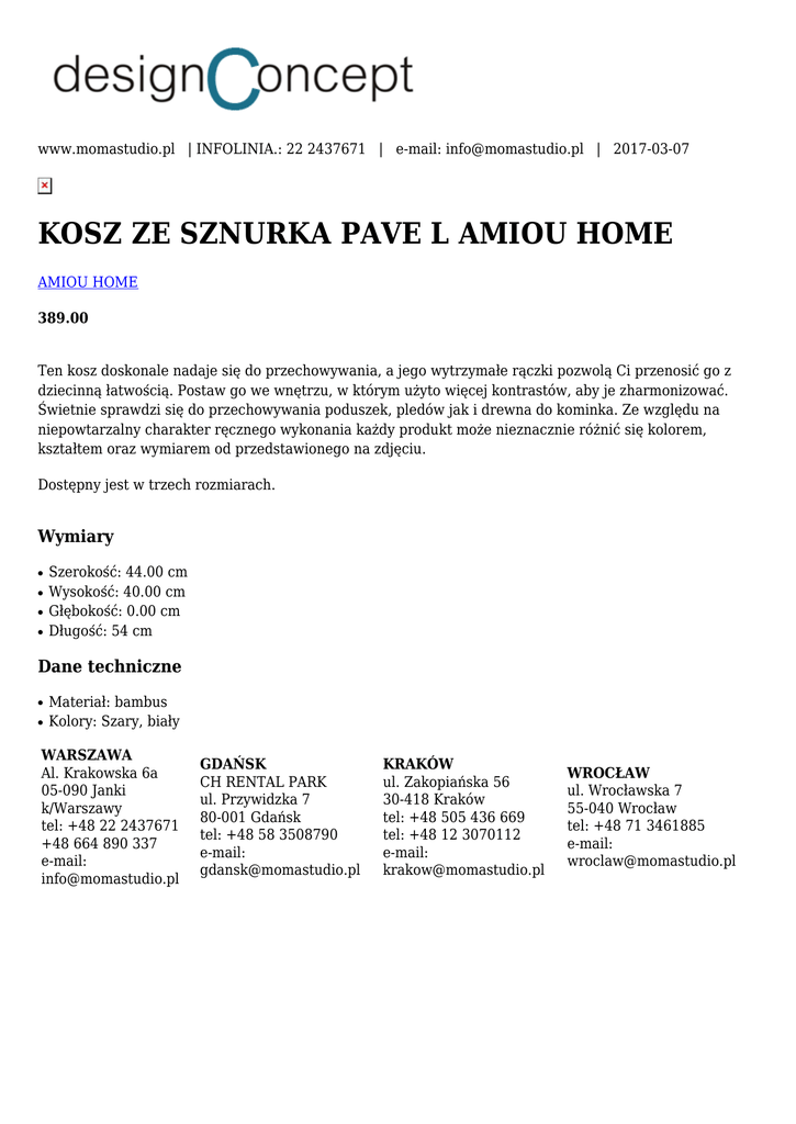 www.momastudio.pl | INFOLINIA.: 22 2437671 | e-mail: [email protected] | 2017-03-07 KOSZ ZE SZNURKA PAVE L AMIOU HOME AMIOU HOME 389.00 Ten kosz doskonale nadaje się do przechowywania, a jego wytrzymałe rączki pozwolą Ci przenosić go z dziecinną łatwością. Postaw go we wnętrzu, w którym użyto więcej kontrastów, aby je zharmonizować. Świetnie sprawdzi się do przechowywania poduszek, pledów jak i drewna do kominka. Ze względu na niepowtarzalny charakter ręcznego wykonania każdy produkt może nieznacznie różnić się kolorem, kształtem oraz wymiarem od przedstawionego na zdjęciu. Dostępny jest w trzech rozmiarach. Wymiary ● ● ● ● Szerokość: 44.00 cm Wysokość: 40.00 cm Głębokość: 0.00 cm Długość: 54 cm Dane techniczne ● ● Materiał: bambus Kolory: Szary, biały WARSZAWA Al. Krakowska 6a 05-090 Janki k/Warszawy tel: +48 22 2437671 +48 664 890 337 e-mail: [email protected] GDAŃSK CH RENTAL PARK ul. Przywidzka 7 80-001 Gdańsk tel: +48 58 3508790 e-mail: [email protected] KRAKÓW ul. Zakopiańska 56 30-418 Kraków tel: +48 505 436 669 tel: +48 12 3070112 e-mail: [email protected] WROCŁAW ul. Wrocławska 7 55-040 Wrocław tel: +48 71 3461885 e-mail: [email protected]