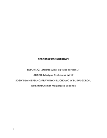 REPORTAŻ KONKURSOWY REPORTAŻ: „Dobrze widzi się tylko sercem…” AUTOR: Martyna Czeluśniak lat 17 SOSW DLA NIEPEŁNOSPRAWNYCH RUCHOWO W BUSKU-ZDROJU OPIEKUNKA: mgr Małgorzata Bębenek 1 DOBRZE WIDZI SIĘ TYLKO SERCEM… Leszek Koped - 51-letni dziennikarz radiowy Radia Wrocław, kompozytor, poeta, nauczyciel muzyki w szkole dla dzieci niewidomych. Można by rzec- artystyczna dusza. Ale jest jeszcze jeden aspekt jego życia, który świadczy o niebywałej wyjątkowości tego człowieka- w dzieciostwie stracił wzrok… Kraków. Słoneczne niedzielne popołudnie. Ludzie kierują się w stronę Kościoła Na Skałce, gdzie za 15 minut rozpocznie się msza święta. Wśród nich postawny, wysoki szatyn, ubrany w sportową marynarkę i niebieskie dżinsy. Obok niego wysoka blondynka o typowo słowiaoskiej urodzie, w zwiewnej, pastelowej sukience. Długi, jasny warkocz kołysze się na plecach w rytm kroków. Para trzyma się za ręce. Moją uwagę zwraca szczegół, którego wcześniej nie zauważyłam, a mianowicie dziwnie przymknięte, niewidzące oczy młodego mężczyzny. Czasy studenckie Tak wyobrażałam sobie postad Leszka, gdy słuchałam wspomnieo z czasów studenckich opiekunki naszego koła dziennikarskiego, pani Małgorzaty Bębenek. Opowiadała, że poznała go na studiach w Krakowie. Pracował wtedy w studenckim radio „Brzęczyk” i mieszkał w akademiku na ulicy Piekarskiej, gdzie poznał miłośd swojego życia- Łucję. To była wyjątkowa para. On był stroną dominującą w tym związku, chod Łucja należała do kobiet pewnych siebie i przebojowych. Dlaczego wybrała właśnie jego? Leszek był duszą towarzystwa, lubił żartowad, prawid komplementy dziewczynom, cudownie śpiewał swoim niskim, tubalnym głosem (trochę podobnym do Wojciecha Manna), grał na gitarze. Miał w sobie coś, co sprawiało, że w jego towarzystwie każdy się czuł dobrze i po kilku minutach zapominał, że Leszek nie widzi… Nigdy nie prosił o pomoc, we wszystkim radził sobie sam. Pewnego razu - wspomina moja opiekunka- gdy na wesołej pogawędce w studenckim gronie zastał go wieczór, Leszek niespokojnie sięgnął po zegarek, taką przedwojenną „cebulę”, otworzył szkiełko, dotknął wskazówek i stwierdził, że bardzo mu przykro, ale jest tak późno, że „zwija żagle”. 2 Leszek Kopeć dziś Wspomnienie z dzieciostwa Muszę przyznad, że zaintrygowała mnie ta postad. Głodna nowych informacji postanowiłam zajrzed do Internetu. W wyszukiwarkę wpisałam „Leszek Koped” i moim oczom ukazała się autorska strona artysty. Jak się okazuje, założyli ją jego przyjaciele. Klikam w zakładkę „O mnie” i ze zdumieniem czytam, jak bogaty bagaż doświadczeo ma pan Leszek. Uczył się w Ośrodku dla Dzieci Niewidomych i Niedowidzących we Wrocławiu. Jak wyglądało jego dzieciostwo? Nie było znacząco różne od młodych lat jego widzących rówieśników. Sam przyznaje, że miał wielu kolegów i nie był przez nich izolowany. Biegał z nimi po podwórku i jeździł na rowerze! Pamięta swoje przezwisko „Szczurek”- z uwagi na drobną sylwetkę. Radosne i szczęśliwe dzieciostwo zawdzięcza, jak mówi, swoim rodzicom, którzy traktowali go jak zdrowe dziecko i nie pozwalali mu odczud w żaden sposób, że jest „inny”. W tym czasie rozpoczął naukę gry na skrzypcach, gitarze, śpiewał w zespole dziecięcym, w chórze. Jego przygoda z gitarą trwa zresztą do dziś. W chwili obecnej jest nauczycielem muzyki w ośrodku, którego jest absolwentem, założył w nim dziecięcy zespół „Do czasu”. Wydali już wspólnie trzy płyty, w tym dwie z autorskimi tekstami pana Leszka. „Praca z dziedmi to moja kolejna pasja, daje mi wiele satysfakcji”, pisze na swojej stronie. Jego przygoda z dziennikarstwem zaczęła się dośd oryginalnie. W szóstej klasie szkoły podstawowej w Dzieo Dziecka zaczepili go na ulicy dwaj dziwni faceci, pytając czy lubi słodycze, odpowiedź nie mogła byd inna, jak tylko twierdząca i jeszcze tego samego dnia mały Leszek znalazł się we wrocławskim radio „Iglica”, w którym przez trzy lata nosił za dziwnymi facetami kable, taśmy i robił radiowcom herbatę. Człowiek renesansu Z wielkim zdumieniem przeczytałam dalej, że pierwszym zdobytym przez niego zawodem był ślusarz obróbki ręcznej. Kolejne to elektronik i masażysta. Pracował też w Spółdzielni Produkcyjnej jako gwinciarz, elektromonter, wiertacz. Jednak ta, jakże trudna i odpowiedzialna praca, nie dawała mu poczucia samorealizacji. Górę wzięła jego artystyczna natura i wrodzona kreatywnośd. Zaczął studiowad dziennikarstwo na UJ w Krakowie i, chod nie skooczył tych studiów, wiele się nauczył w murach tej szacownej jak pisze, uczelni. 3 Z nieodłączną gitarą W Krakowie trafił też do studia radiowego AGH, gdzie pracował blisko osiem lat w akademickim radio „Brzęczyk”. Sam przyznaje, że Kraków wiele go nauczył, zgłębił tam tajniki warsztatu dziennikarstwa radiowego, nabrał doświadczenia, no i poznał swoją Łucję… To właśnie w Krakowie wystartował na Festiwalu Piosenki Studenckiej, później zdobył Grand Prix Yapa, Grand Prix na Festiwalu Osób Niepełnosprawnych w Bytomiu, a także nagrodę ZAiKS-u i tytuł „Człowieka roku” na Dolnym Śląsku. Czym obecnie zajmuje się niewidomy artysta? Wydał pięd płyt, w tym trzy autorskie: „Uliczny grajek”(1997), „Chod struna pęka”(2004), „Modlitwa do mojej muzyki” i dwie płyty zawierające aranżacje znanych piosenek „Przeboje, które nigdy nie przeminą” cz I, II. Ponadto Koped koncertuje po całym kraju, podróżując wszędzie ze swoim psem przewodnikiem. Parę lat temu zawitał także do Buska-Zdroju na koncert osób niepełnosprawnych „Górka Dzieciom”. Od 1989r. pracuje w Polskim Radio Wrocław, gdzie prowadzi swoją wieczorną audycję „Muzyczna cyganeria”, która poświęcona jest piosence poetyckiej, autorskiej i turystycznej. Mo