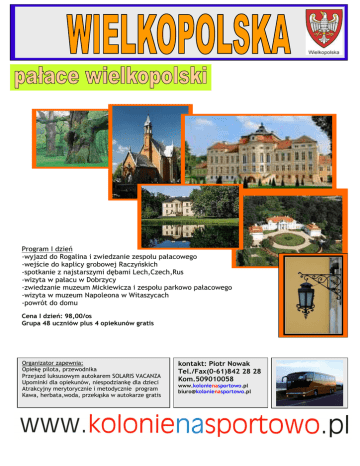 . Program I dzień -wyjazd do Rogalina i zwiedzanie zespołu pałacowego -wejście do kaplicy grobowej Raczyńskich -spotkanie z najstarszymi dębami Lech,Czech,Rus -wizyta w pałacu w Dobrzycy -zwiedzanie muzeum Mickiewicza i zespołu parkowo pałacowego -wizyta w muzeum Napoleona w Witaszycach -powrót do domu Cena I dzień: 98,00/os Grupa 48 uczniów plus 4 opiekunów gratis Organizator zapewnia: Opiekę pilota, przewodnika Przejazd luksusowym autokarem SOLARIS VACANZA Upominki dla opiekunów, niespodziankę dla dzieci Atrakcyjny merytorycznie i metodycznie program Kawa, herbata,woda, przekąska w autokarze gratis kontakt: Piotr Nowak Tel./Fax(0-61)842 28 28 Kom.509010058 www.kolonienasportowo.pl [email protected]