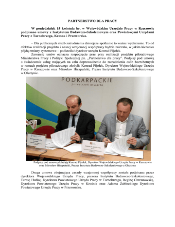 PARTNERSTWO DLA PRACY W poniedziałek 15 kwietnia br. w Wojewódzkim Urzędzie Pracy w Rzeszowie podpisano umowy z Instytutem Badawczo-Szkoleniowym oraz Powiatowymi Urzędami Pracy z Tarnobrzega, Krosna i Przeworska. – Dla publicznych służb zatrudnienia dzisiejsze spotkanie to ważne wydarzenie. To od efektów realizacji projektu i naszej wzajemnej współpracy będzie zależało, w jakim kierunku pójdą zmiany systemowe – podkreślał dyrektor urzędu Konrad Fijołek. Zawarcie umów oznacza rozpoczęcie prac przy realizacji projektu pilotażowego Ministerstwa Pracy i Polityki Społecznej pn. „Partnerstwo dla pracy”. Podpisy pod umową o świadczenie usług mających na celu doprowadzenie do zatrudnienia osób bezrobotnych w ramach projektu pilotażowego złożyli: Konrad Fijołek, Dyrektor Wojewódzkiego Urzędu Pracy w Rzeszowie oraz Mirosław Hiszpański, Prezes Instytutu Badawczo-Szkoleniowego w Olsztynie. Podpisy pod umową składają Konrad Fijołek, Dyrektor Wojewódzkiego Urzędu Pracy w Rzeszowie oraz Mirosław Hiszpański, Prezes Instytutu Badawczo-Szkoleniowego z Olsztyna Druga umowa obejmująca zasady wzajemnej współpracy została podpisana przez dyrektora Wojewódzkiego Urzędu Pracy, prezesa Instytutu Badawczo-Szkoleniowego, Teresę Huńkę, Dyrektora Powiatowego Urzędu Pracy w Tarnobrzegu, Reginę Chrzanowską, Dyrektora Powiatowego Urzędu Pracy w Krośnie oraz Adama Zabłockiego Dyrektora Powiatowego Urzędu Pracy w Przeworsku. Pod umową współpracy swoje podpisy złożyli: (od prawej) Konrad Fijołek – Dyrektor Wojewódzkiego Urzędu Pracy w Rzeszowie, Mirosław Hiszpański – Prezes Instytutu Badawczo-Szkoleniowego z Olsztyna, Teresa Huńka – Dyrektor Powiatowego Urzędu Pracy w Tarnobrzegu, Regina Chrzanowska – Dyrektor Powiatowego Urzędu Pracy w Krośnie oraz Adam Zabłocki – Dyrektor Powiatowego Urzędu Pracy w Przeworsku – Projekt pilotażowy „Partnerstwo dla pracy” ma służyć wypracowaniu nowych mechanizmów współpracy pomiędzy wojewódzkimi urzędami pracy, powiatowymi urzędami pracy, a dostawcami usług aktywizacyjnych i innymi partnerami rynku pracy, którzy będą przyczyniać się do powrotu osób bezrobotnych do zatrudniania – zaznacza Tadeusz Gospodarczyk, Wicedyrektor ds. Rynku Pracy Wojewódzkiego Urzędu Pracy w Rzeszowie. – Jaki będzie efekt tych prac powinniśmy się przekonać już początkiem przyszłego roku – dodaje. Zgodnie z założeniami pilotażu do zadań Powiatowych Urzędów Pracy z Tarnobrzega, Krosna i Przeworska będzie należał dobór uczestników projektu z uwzględnieniem liczby i struktury osób bezrobotnych. Łącznie trzy urzędy wybiorą 984 osoby, spośród nich 50% powinny stanowić osoby długotrwale bezrobotne, 18% kobiety, które po urodzeniu dziecka nie podjęły zatrudniania, 26% bezrobotni powyżej 50. roku życia oraz 6 % osoby niepełnosprawne. W ramach realizacji pilotażu Wykonawca – Instytut Szkoleniowo-Badawczy uruchomi Ośrodki Aktywizacyjne. Już powstają one w Tarnobrzegu, Krośnie i Przeworsku. W ośrodkach będą odbywać się konsultacje diagnostyczne, szkolenia, kursy, warsztaty, spotkania dla grup wsparcia oraz indywidualna terapia. W ośrodkach Instytut zamierza organizować opiekę nad dziećmi osób objętych pilotażem, a także wyposażyć lokale w stanowiska komputerowe z dostępem do Internetu. Wykonawca na świadczenie usługi został wyłoniony w ramach prowadzonego postępowania o udzielenie zamówienia publicznego. Spośród ośmiu złożonych ofert najwięcej punktów otrzymał Instytut Badawczo-Szkoleniowy z Olsztyna. Podpisana umowa opiewa na kwotę 9 643 200 zł. Województwo podkarpackie obok mazowieckiego i dolnośląskiego zostało wybrane przez Ministerstwo Pracy i Polityki Społecznej do testowania pilotażu. Realizacja projektu potrwa do 2014 oku.