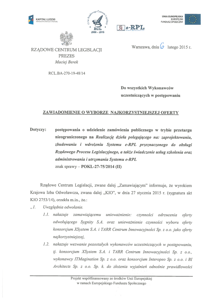 1 o Ce, M A KAPITAŁ LUDZKI „.j RCL 2000— 2015 UNIA EUROPEJSKA „ EUROPEJSKI FUNDUSZ SPOŁECZNY „ L1 e-RPL Warszawa, dnia 2 lutego 2015 r. RZĄDOWE CENTRUM LEGISLACJI PREZES Maciej Berek RCL.BA-270-1 9-48/14 Do wszystkich Wykonawców uczestniczących w postępowaniu ZAWIADOMIENIE O WYBORZE NAJKORZYSTNIEJSZEJ OFERTY Dotyczy: postępowania o udzielenie zamówienia publicznego w trybie przetargu nieograniczonego na Realizację dzieła polegającego na: zaprojektowaniu, zbudowaniu i wdrożeniu Systemu e-RPL przeznaczonego do obsługi Rządowego Procesu Legislacyjnego, a także świadczenie usług szkolenia oraz administrowania i utrzymania Systemu e-RPL znak sprawy — POKL-27-75/2014 (II) Rządowe Centrum Legislacji, zwane dalej „Zamawiającym” informuje, że wyrokiem Krajowa Izba Odwoławcza, zwana dalej „KIO”, w dnia 27 stycznia 2015 r. (sygnatura akt KIO 2753/14), orzekła m.in., że.: Uwzględnia odwołanie. 1.1. nakazuje zamawiającemu unieważnienie: czynności odrzucenia oferty odwołującego Sygn ity S.A. oraz unieważnienie czynności wyboru oferty konsorcjum XSystem S.A. i TARR Centrum Innowacyjności Sp. z o.o. jako oferty najkorzystniejszej, 1.2. nakazuje wezwanie pozostałych wykonawców uczestniczących w postępowaniu, tj. konsorcjum XSystem S.A. i TARR Centrum Innowacyjności Sp. z o.o., wykonawcy ITMagination Sp. z o.o. oraz konsorcjum Interopeo Sp. z o.o. i BI Architects Sp. z o.o. Sp. k. do złożenia wyjaśnień odnośnie prawidłowości Projekt współfinansowany ze środków Unii Europejskiej w ramach Europejskiego Funduszu Społecznego UNIA EUROPEJSKA EUROPEJSKI „ KAPITAŁ LUDZKI 9 J FUNDUSZ SPOŁECZNY — RCL 2000—2015 zastosowania stawki podatku VAT od szkoleń wchodzących w skład przedmiotu zamówienia, 1.3. nakazuje dokonanie ponownej oceny ofert z udziałem oferty odwołującego SygnityS.A.” Wobec powyższego Zamawiający, na podstawie art. 192 ust. 3 pkt 1 ustawy z dnia 29 stycznia 2004 r. Prawo zamówień publicznych (Dz. U. z 2013 poz. 907, z późn.zm.), zwanej - dalej „ustawa”, unieważnia czynność wyboru najkorzystniejszej oferty konsorcjum firm: XSystem S.A. oraz TARR Centrum Innowacyjności Sp. z o.o. z dnia 15 grudnia 2014 r. (RCL.BA-270- 19-31/14). W związku z nakazem w/w wyroku KIO, Zamawiający w wyniku powtórzenia czynności badania i oceny ofert w tym po wezwaniu pozostałych wykonawców uczestniczących w postępowaniu, tj. konsorcjum XSystem S.A. i TARR Centrum Innowacyjności Sp. z o.o., wykonawcy ITMagination Sp. z o.o. oraz konsorcjum Interopeo Sp. z o.o. i BI Architects Sp. z o.o. Sp. k. do złożenia wyjaśnień odnośnie prawidłowości zastosowania stawki podatku VAT od szkoleń wchodzących w skład przedmiotu zamówienia oraz po uzyskaniu potwierdzeń tych Wykonawców co do prawidłowości dokonanych przez Zamawiającego, w trybie art. 87 ust. 2 pkt 3 ustawy, poprawek w zakresie innych omyłek polegających na niezgodności oferty ze specyfikacją istotnych warunków zamówienia, niepowodujących istotnych zmian w treści oferty - niniejszym zawiadamia o rozstrzygnięciu postępowania jak niżej: Na podstawie art. 92 ust. 1 pkt 1 ustawy informuje, iż dokonano wyboru oferty nr 2 jako najkorzystniejszej, złożonej przez konsorcjum firm: XSystem S.A., ul. Julianowska 54B, 91473 Łódź (lider konsorcjum) oraz TARR Centrum Innowacyjności Sp. z o.o., ul. Wrocławska 167, 87-100 Toruń (konsorcjant). Cena całkowita za realizację niniejszego zamówienia wynosi: 1.797.176,40 zł brutto. Uzasadnienie wyboru oferty: Wyłoniony Wykonawca spełnia wszystkie warunki udziału w postępowaniu. Treść oferty odpowiada treści specyfikacji istotnych warunków zamówienia, zwanej dalej „SIWZ”. Projekt współfinansowany ze środków Unii Europejskiej w ramach Europejskiego Funduszu Społecznego O 4 Ce,,, UNIA EUROPEJSKA _.....„9” KAPITAŁ LUDZKI 1ĄoDWA EUROPEJSKI FUNDUSZ SPOŁECZNY RCL 2000—2015 Proponowana w ofercie cena nie przewyższa kwoty, jaką Zamawiający może przeznaczyć na sfinansowanie zamówienia. Zgodnie z kryteriami oceny ofert zawartymi w SIWZ Wykonawca uzyskał najwyższą ilość punktów — 77,70 pkt podczas dokonanej oceny ofert. LISTA WYKONAWCÓW. KTÓRZY ZŁOŻYLI OFERTY WRAZ Z PRZYZNANA PUNKTACJA W POSZCZEGÓLNYCH KRYTERIACH OCENY OFERT: Cena oferty Wykonawca (zł brutto) z Kryterium nr 1 Cena oferty - Sygnity S.A. Al. Jerozolimskie 180 02-486 Warszawa 1 50 pkt Kryterium nr 2 Ocena zakresu i sposobu zrealizowania funkcjonalności zapisanych w SIWZ Kryterium nr 3 Ocena sposobu budowy, wdrożenia i utrzymania Systemu -35pkt -l5pkt Łączna punktacja przyznana ofercie 2.389.300,00 37,61 28,00 9,30 74,9 1 1.797.176,40 50 17,50 10,20 77,70 1.838,530,371 48,88 0,00 11,10 59,98 1.946,790,002 46,16 0,00 1,50 47,66 Konsorcjum firm: XSystem S.A. Ul. Julianowska 54B 91-473 Łódź 2 oraz TARR Centrum Innowacyjności Sp. z o.o. Ul. Wrocławska 167 87-100 Toruń 3 ITMAGINATION Sp. z o.o. Ul. Chmielna 85/87 00-805 Warszawa Konsorcjum firm: Interopeo Sp. z o.o. Ul. Nowogrodzka 31 00-511 Warszawa 4 oraz BI Architects Sp. z o.o. Sp. k. Ul. Puławska 257/4 02-769 Warszawa 1 Cena oferty po dokonaniu przez Zamawiającego poprawienia oczywistej omyłki polegającej na niezgodności oferty z SIWZ na podstawie art. 87 ust. 2 pkt 3 ustawy, zgodnie z wyrokiem KIO z dnia 27 stycznia 2015 roku (sygn. akt. KIO 2753/14). 2 Cena oferty po dokonaniu przez Zamawiającego poprawienia oczywistej omyłki polegającej na niezgodności oferty z SIWZ na podstawie art. 87 ust. 2 pkt 3 ustawy, zgodnie z wyrokiem KIO z dnia 27 stycznia 2015 roku (sygn. akt. KIO 2753/14). Projekt współfinansowany ze środków Unii Europejskiej w ramach Europejskiego Funduszu Społecznego UNIA EUROPEJSKA EUROPEJSKI FUNDUSZ SPOŁECZNY KAPITAŁ LUDZKI JĄDDQWA SiMECIA WOlNOŚCI 2000— 2015 Z uwagi na fakt zastrzeżenia przez Wykonawców biorących udział w postępowaniu części ofert podlegających ocenie jako tajemnicy przedsiębiorstwa w 