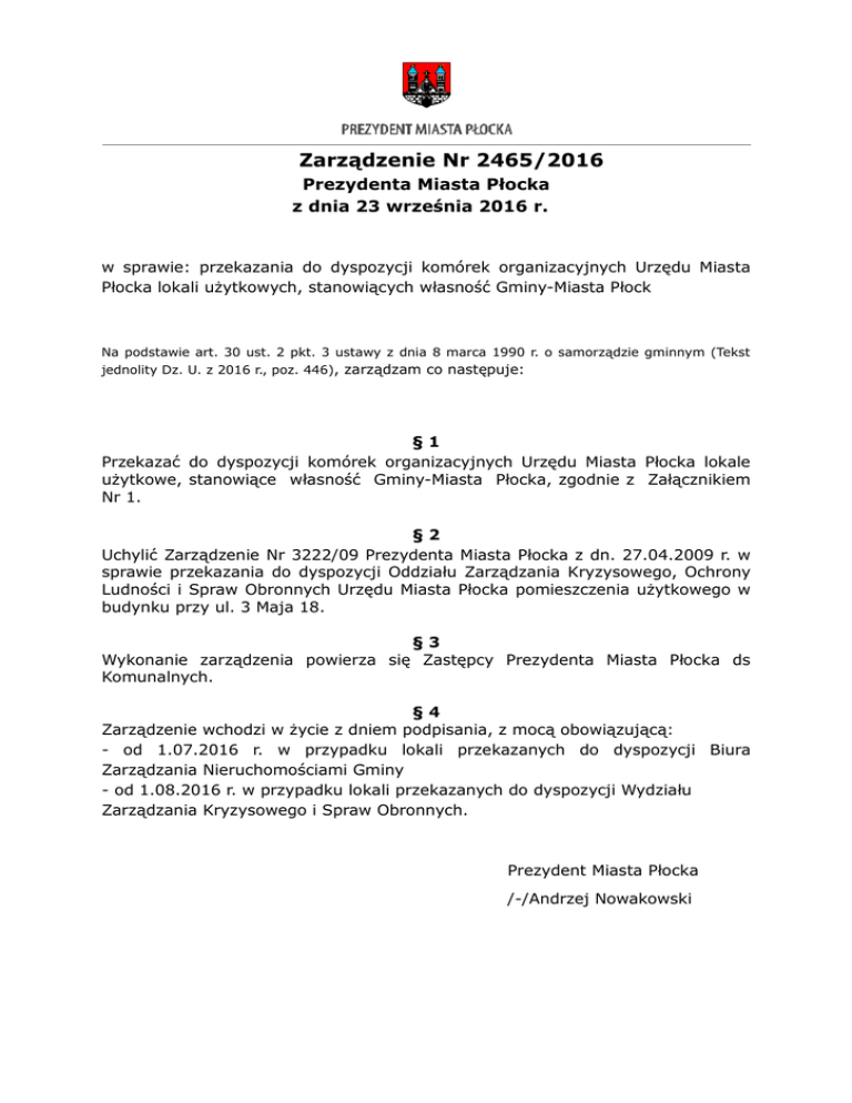 Zarządzenie Nr 2465/2016 Prezydenta Miasta Płocka z dnia 23 września 2016 r. w sprawie: przekazania do dyspozycji komórek organizacyjnych Urzędu Miasta Płocka lokali użytkowych, stanowiących własność Gminy-Miasta Płock Na podstawie art. 30 ust. 2 pkt. 3 ustawy z dnia 8 marca 1990 r. o samorządzie gminnym (Tekst jednolity Dz. U. z 2016 r., poz. 446), zarządzam co następuje: §1 Przekazać do dyspozycji komórek organizacyjnych Urzędu Miasta Płocka lokale użytkowe, stanowiące własność Gminy-Miasta Płocka, zgodnie z Załącznikiem Nr 1. §2 Uchylić Zarządzenie Nr 3222/09 Prezydenta Miasta Płocka z dn. 27.04.2009 r. w sprawie przekazania do dyspozycji Oddziału Zarządzania Kryzysowego, Ochrony Ludności i Spraw Obronnych Urzędu Miasta Płocka pomieszczenia użytkowego w budynku przy ul. 3 Maja 18. §3 Wykonanie zarządzenia powierza się Zastępcy Prezydenta Miasta Płocka ds Komunalnych. §4 Zarządzenie wchodzi w życie z dniem podpisania, z mocą obowiązującą: - od 1.07.2016 r. w przypadku lokali przekazanych do dyspozycji Biura Zarządzania Nieruchomościami Gminy - od 1.08.2016 r. w przypadku lokali przekazanych do dyspozycji Wydziału Zarządzania Kryzysowego i Spraw Obronnych. Prezydent Miasta Płocka /-/Andrzej Nowakowski