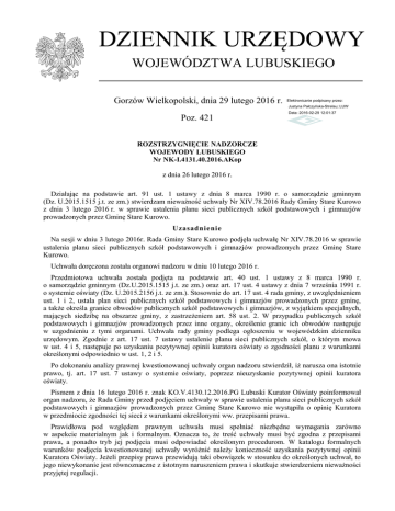 DZIENNIK URZĘDOWY WOJEWÓDZTWA LUBUSKIEGO Gorzów Wielkopolski, dnia 29 lutego 2016 r. Elektronicznie podpisany przez: Justyna Pałczyńska-Strelau; LUW Poz. 421 Data: 2016-02-29 12:01:37 ROZSTRZYGNIĘCIE NADZORCZE WOJEWODY LUBUSKIEGO Nr NK-I.4131.40.2016.AKop z dnia 26 lutego 2016 r. Działając na podstawie art. 91 ust. 1 ustawy z dnia 8 marca 1990 r. o samorządzie gminnym (Dz. U.2015.1515 j.t. ze zm.) stwierdzam nieważność uchwały Nr XIV.78.2016 Rady Gminy Stare Kurowo z dnia 3 lutego 2016 r. w sprawie ustalenia planu sieci publicznych szkół podstawowych i gimnazjów prowadzonych przez Gminę Stare Kurowo. Uzasadnienie Na sesji w dniu 3 lutego 2016r. Rada Gminy Stare Kurowo podjęła uchwałę Nr XIV.78.2016 w sprawie ustalenia planu sieci publicznych szkół podstawowych i gimnazjów prowadzonych przez Gminę Stare Kurowo. Uchwała doręczona została organowi nadzoru w dniu 10 lutego 2016 r. Przedmiotowa uchwała została podjęta na podstawie art. 40 ust. 1 ustawy z 8 marca 1990 r. o samorządzie gminnym (Dz.U.2015.1515 j.t. ze zm.) oraz art. 17 ust. 4 ustawy z dnia 7 września 1991 r. o systemie oświaty (Dz. U.2015.2156 j.t. ze zm.). Stosownie do art. 17 ust. 4 rada gminy, z uwzględnieniem ust. 1 i 2, ustala plan sieci publicznych szkół podstawowych i gimnazjów prowadzonych przez gminę, a także określa granice obwodów publicznych szkół podstawowych i gimnazjów, z wyjątkiem specjalnych, mających siedzibę na obszarze gminy, z zastrzeżeniem art. 58 ust. 2. W przypadku publicznych szkół podstawowych i gimnazjów prowadzonych przez inne organy, określenie granic ich obwodów następuje w uzgodnieniu z tymi organami. Uchwała rady gminy podlega ogłoszeniu w wojewódzkim dzienniku urzędowym. Zgodnie z art. 17 ust. 7 ustawy ustalenie planu sieci publicznych szkół, o którym mowa w ust. 4 i 5, następuje po uzyskaniu pozytywnej opinii kuratora oświaty o zgodności planu z warunkami określonymi odpowiednio w ust. 1, 2 i 5. Po dokonaniu analizy prawnej kwestionowanej uchwały organ nadzoru stwierdził, iż narusza ona istotnie prawo, tj. art. 17 ust. 7 ustawy o systemie oświaty, poprzez nieuzyskanie pozytywnej opinii kuratora oświaty. Pismem z dnia 16 lutego 2016 r. znak KO.V.4130.12.2016.PG Lubuski Kurator Oświaty poinformował organ nadzoru, że Rada Gminy przed podjęciem uchwały w sprawie ustalenia planu sieci publicznych szkół podstawowych i gimnazjów prowadzonych przez Gminę Stare Kurowo nie wystąpiła o opinię Kuratora w przedmiocie zgodności tej sieci z warunkami określonymi ww. przepisami prawa. Prawidłowa pod względem prawnym uchwała musi spełniać niezbędne wymagania zarówno w aspekcie materialnym jak i formalnym. Oznacza to, że treść uchwały musi być zgodna z przepisami prawa, a ponadto tryb jej podjęcia musi odpowiadać określonym procedurom. W katalogu formalnych warunków podjęcia kwestionowanej uchwały wyróżnić należy konieczność uzyskania pozytywnej opinii Kuratora Oświaty. Jeżeli przepisy prawa przewidują taki obowiązek w stosunku do określonych uchwał, to jego niewykonanie jest równoznaczne z istotnym naruszeniem prawa i skutkuje stwierdzeniem nieważności przyjętej regulacji. Dziennik Urzędowy Województwa Lubuskiego –2– Poz. 421 Od niniejszego rozstrzygnięcia służy prawo wniesienia skargi do Wojewódzkiego Sądu Administracyjnego w Gorzowie Wielkopolskim, w terminie 30 dni od daty doręczenia rozstrzygnięcia, za pośrednictwem Wojewody Lubuskiego. Zgodnie z art. 92 ust. 1 ustawy o samorządzie gminnym, stwierdzenie przez organ nadzoru nieważności uchwały organu gminy wstrzymuje jej wykonanie z mocy prawa w zakresie objętym stwierdzeniem nieważności, z dniem doręczenia rozstrzygnięcia nadzorczego. z up. Wojewody Lubuskiego Dyrektor Wydziału Nadzoru i Kontroli Teresa Kaczmarek