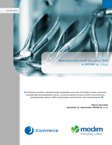 Wdro¿enie Microsoft Dynamics NAV w MEDIM Sp. z o.o. Realizacja projektu wdro¿eniowego przebieg³a wzorcowo. Na ka¿dym etapie wdro¿enia wszystko by³o przewidywalne i jasne, a proces przejœcia na nowy system (uruchomienia produkcyjnego systemu NAV) zrealizowany zosta³ p³ynnie i bez niespodzianek. . Marcin Kaszubski, Specjalista ds. Informatyki, MEDIM Sp. z o.o. Firma MEDIM zosta³a za³o¿ona w 1990 r., jako jedna z pierwszych polskich prywatnych firm zaopatruj¹cych s³u¿bê zdrowia w sprzêt medyczny. Jest wy³¹cznym przedstawicielem w Po l s c e k i l k u œ w i at o w y c h l i d e ró w w wybranych produktach medycznych. Oferta firmy MEDIM obejmuje: konsultacje i specjalistyczne wsparcie dla swoich klientów szkolenia aplikacyjne, u¿ytkowe i eksploatacyjne dostawy sprzêtu, urz¹dzeñ, systemów medycznych instalacje i monta¿e aparatury serwis techniczny MEDIM jest aktywnym cz³onkiem Business Centre Club oraz Ogólnopolskiej Izby Gospodarczej Wyrobów Medycznych POLMED. Wyzwania Decyzja o wdro¿eniu nowego systemu informatycznego wspomagaj¹cego zarz¹dzanie przedsiêbiorstwem zosta³a podjêta przez Zarz¹d firmy w 2010 roku. Czynnikami motywuj¹cymi tak¹ decyzjê by³y: dynamiczny rozwój firmy w ostatnich kilku latach, zwiêkszone zapotrzebowanie na szybki dostêp do bie¿¹cych i sprawdzonych informacji na temat rentownoœci podejmowanych przedsiêwziêæ oraz ogólnej kondycji firmy, potrzeba usprawnienia procesów zarz¹dzania ³añcuchem dostaw (czynnik krytyczny dla terminowej realizacji projektów), koniecznoœæ zwiêkszenia kontroli obrotu magazynowego i sprawnego zarz¹dzania magazynem (ze szczególnym uwzglêdnieniem identyfikacji numerów seryjnych, partii i dat wa¿noœci produktów – g³ównie w obrocie wyrobami medycznymi). Dotychczas stosowany system ERP nie by³ w stanie sprostaæ stawianym wymaganiom w œwietle du¿ych zmian zachodz¹cych zarówno w samej organizacji jak i jej otoczeniu. Procedura wyboru nowego systemu nie by³a ³atwa, a ostateczna decyzja zapad³a dopiero na pocz¹tku 2012 roku. Spoœród dostêpnych na rynku systemów ERP wybrany zosta³ system firmy Microsoft – MS Dynamics NAV. „Firma JCommerce przedstawi³a najbardziej kompleksow¹ ofertê, która obejmowa³a wiele niezidentyfikowanych wczeœniej zagadnieñ odkrytych dopiero podczas konsultacji poprzedzaj¹cych wybór w³aœciwej oferty. Wiedza i doœwiadczenie konsultantów firmy oraz znajomoœæ tzw. „dobrych praktyk” by³y czynnikami decyduj¹cymi o wyborze. Zdawaliœmy sobie sprawê, ¿e tylko wspó³praca z w³aœciwym partnerem jest kluczem do osi¹gniêcia sukcesu, którym w tym przypadku by³o sprawne wdro¿enie systemu – zgodnie z przyjêtymi za³o¿eniami co do zakresu, terminu i bud¿etu.” Piotr M³ynarczyk, Dyrektor Naczelny w Medim Sp. z o.o. 2 Rozwi¹zanie Microsoft Dynamics NAV pokona³ konkurentów dziêki swojej bardzo obszerneji kompleksowej funkcjonalnoœci dostêpnej w standardowej wersji oraz pe³nej elastycznoœci w szerokim zakresie dostosowania systemu do indywidualnych potrzeb Klienta. Nie mniej istotny od wyboru w³aœciwego systemu by³ dobór odpowiedniego partnera – firmy, która by³aby w stanie sprawnie i profesjonalnie przeprowadziæ proces wdro¿enia systemu. Po d³ugiej i wnikliwej analizie z³o¿onych ofert oraz przeprowadzonych konsultacjach z o fe re nta m i w y b ra n a zo sta ³ a f i r m a JCommerce SA z Katowic, która wykaza³a siê profesjonalnym podejœciem i doskona³¹ znajomoœci¹ najwa¿niejszych zagadnieñ z zakresu zasad prowadzenia biznesu oraz zaproponowa³a bardzo ciekawe rozwi¹zania w newralgicznych dla MEDIM obszarach dzia³alnoœci. Wdro¿enie systemu MS Dynamics NAV 2009 zosta³o przeprowadzone zgodnie z przyjêtym harmonogramem, który zak³ada³ wykonanie wszystkich zaplanowanych prac w szeœæ miesiêcy. Projekt wdro¿eniowy zosta³ rozpoczêty w lutym 2012 szczegó³ow¹ analiz¹ procesów, natomiast uruchomienie produkcyjne systemu nast¹pi³o w czerwcu, a ca³y projekt zosta³ zamkniêty wraz z pocz¹tkiem sierpnia (po up³ywie 2-miesiêcznego okresu asysty przy starcie). Opracowana koncepcja wdro¿enia systemu zak³ada³a uruchomienie systemu we wszystkich obszarach dzia³alnoœci firmy i obejmowa³a: Zakupy Magazyn Sprzeda¿ Ksiêgowoœæ Zarz¹dzanie zasobami Administracjê Wszystkie zdefiniowane na etapie analizy procesy zosta³y prawid³owo zmapowane w nowym systemie, a koñcowa funkcjo-nalnoœæ systemu zosta³a oceniona jako w pe³ni zgodna z przyjêtymi za³o¿eniami. Na potrzeby realizacji wdro¿enia systemu MS Dynamics NAV w firmie MEDIM Sp. z o.o. zosta³y przygotowane liczne modyfikacje i dodatkowe interfejsy dostoso wuj¹ce standardow¹ funkcjonalnoœæ systemu do wymagañ zg³oszonych podczas analizy. 3 str.3 Korzyœci biznesowe Zautomatyzowanie dzia³añ Procesy importu danych do systemu z plików w formacie .xls/.xml (zapasy, komponenty, cenniki zakupu i sprzeda¿y, zamówienia) Aktualizacja cen sprzeda¿y w PLN na podstawie aktualnego kursu i ceny w walucie sugerowanej przez dostawcê Eksport komponentów zestawów DEMO przeznaczonych do wypo¿yczenia Automatyzacja procesu tworzenia kartotek zapasów, nabywców, dostawców, informacji o numerach seryjnych i partii oraz zestawów komponentów £atwoœæ i wygoda raportowania Wielowymiarowa analiza sprzeda¿y W pe³ni definiowane przez u¿ytkownika arkusze kont Zestaw gotowych raportów generuj¹cych potrzebne zestawienia Wydruki dokumentów w pe³ni zgodne z wymaganiami u¿ytkownika Zwiêkszenie kontroli Œledzenie numerów seryjnych, numerów partii i dat wa¿noœci w obrocie wyrobami medycznymi (zakup, sprzeda¿, serwis) Obs³uga numerów seryjnych, numerów partii i dat wa¿noœci dla komponentów zestawów Szczegó³owy rachunek wyników z wykorzystaniem wymiarów analitycznych (m.in.: dzia³, kontrakt, pracownik, noœnik kosztu) Monitorowanie procesu „dopuszczania” produktów medycznych do obrotu Mechanizm kontroli sprzeda¿y