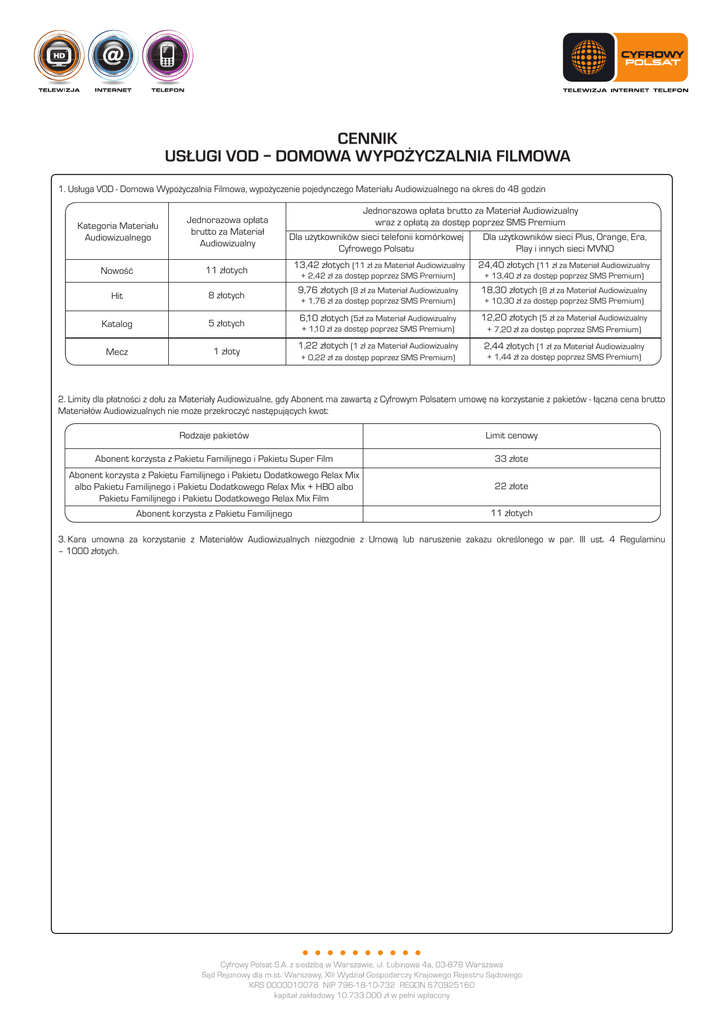 CENNIK Usługi VOD – Domowa Wypożyczalnia Filmowa 1.Usługa VOD - Domowa Wypożyczalnia Filmowa, wypożyczenie pojedynczego Materiału Audiowizualnego na okres do 48 godzin Kategoria Materiału Audiowizualnego Jednorazowa opłata brutto za Materiał Audiowizualny Nowość 11 złotych Hit Katalog Mecz Jednorazowa opłata brutto za Materiał Audiowizualny wraz z opłatą za dostęp poprzez SMS Premium Dla użytkowników sieci telefonii komórkowej Cyfrowego Polsatu Dla użytkowników sieci Plus, Orange, Era, Play i innych sieci MVNO 13,42 złotych (11 zł za Materiał Audiowizualny 24,40 złotych (11 zł za Materiał Audiowizualny 8 złotych 5 złotych 1 złoty + 2,42 zł za dostęp poprzez SMS Premium) + 13,40 zł za dostęp poprzez SMS Premium) 9,76 złotych (8 zł za Materiał Audiowizualny 18,30 złotych (8 zł za Materiał Audiowizualny + 1,76 zł za dostęp poprzez SMS Premium) + 10,30 zł za dostęp poprzez SMS Premium) 6,10 złotych (5zł za Materiał Audiowizualny 12,20 złotych (5 zł za Materiał Audiowizualny + 1,10 zł za dostęp poprzez SMS Premium) + 7,20 zł za dostęp poprzez SMS Premium) 1,22 złotych (1 zł za Materiał Audiowizualny 2,44 złotych (1 zł za Materiał Audiowizualny + 0,22 zł za dostęp poprzez SMS Premium) + 1,44 zł za dostęp poprzez SMS Premium) 2.Limity dla płatności z dołu za Materiały Audiowizualne, gdy Abonent ma zawartą z Cyfrowym Polsatem umowę na korzystanie z pakietów - łączna cena brutto Materiałów Audiowizualnych nie może przekroczyć następujących kwot: Rodzaje pakietów Limit cenowy Abonent korzysta z Pakietu Familijnego i Pakietu Super Film 33 złote Abonent korzysta z Pakietu Familijnego i Pakietu Dodatkowego Relax Mix albo Pakietu Familijnego i Pakietu Dodatkowego Relax Mix + HBO albo Pakietu Familijnego i Pakietu Dodatkowego Relax Mix Film 22 złote Abonent korzysta z Pakietu Familijnego 11 złotych 3.Kara umowna za korzystanie z Materiałów Audiowizualnych niezgodnie z Umową lub naruszenie zakazu określonego w par. III ust. 4 Regulaminu – 1000 złotych.