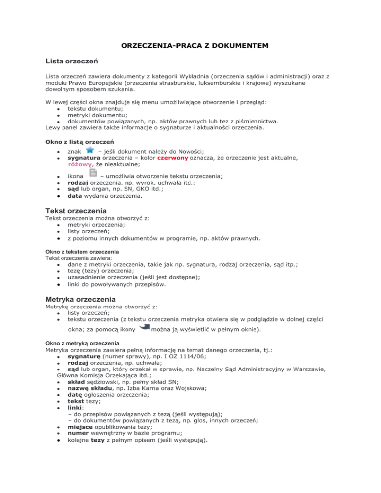 ORZECZENIA-PRACA Z DOKUMENTEM Lista orzeczeń Lista orzeczeń zawiera dokumenty z kategorii Wykładnia (orzeczenia sądów i administracji) oraz z modułu Prawo Europejskie (orzeczenia strasburskie, luksemburskie i krajowe) wyszukane dowolnym sposobem szukania. W lewej części okna znajduje się menu umożliwiające otworzenie i przegląd: tekstu dokumentu; metryki dokumentu; dokumentów powiązanych, np. aktów prawnych lub tez z piśmiennictwa. Lewy panel zawiera także informacje o sygnaturze i aktualności orzeczenia. Okno z listą orzeczeń znak – jeśli dokument należy do Nowości; sygnatura orzeczenia – kolor czerwony oznacza, że orzeczenie jest aktualne, różowy, że nieaktualne; ikona – umożliwia otworzenie tekstu orzeczenia; rodzaj orzeczenia, np. wyrok, uchwała itd.; sąd lub organ, np. SN, GKO itd.; data wydania orzeczenia. Tekst orzeczenia Tekst orzeczenia można otworzyć z: metryki orzeczenia; listy orzeczeń; z poziomu innych dokumentów w programie, np. aktów prawnych. Okno z tekstem orzeczenia Tekst orzeczenia zawiera: dane z metryki orzeczenia, takie jak np. sygnatura, rodzaj orzeczenia, sąd itp.; tezę (tezy) orzeczenia; uzasadnienie orzeczenia (jeśli jest dostępne); linki do powoływanych przepisów. Metryka orzeczenia Metrykę orzeczenia można otworzyć z: listy orzeczeń; tekstu orzeczenia (z tekstu orzeczenia metryka otwiera się w podglądzie w dolnej części okna; za pomocą ikony można ją wyświetlić w pełnym oknie). Okno z metryką orzeczenia Metryka orzeczenia zawiera pełną informację na temat danego orzeczenia, tj.: sygnaturę (numer sprawy), np. I OZ 1114/06; rodzaj orzeczenia, np. uchwała; sąd lub organ, który orzekał w sprawie, np. Naczelny Sąd Administracyjny w Warszawie, Główna Komisja Orzekająca itd.; skład sędziowski, np. pełny skład SN; nazwę składu, np. Izba Karna oraz Wojskowa; datę ogłoszenia orzeczenia; tekst tezy; linki: – do przepisów powiązanych z tezą (jeśli występują); – do dokumentów powiązanych z tezą, np. glos, innych orzeczeń; miejsce opublikowania tezy; numer wewnętrzny w bazie programu; kolejne tezy z pełnym opisem (jeśli występują). 1. Odszukać w kategorii Wykładnia - Orzeczenia Sądów – wyrok z dnia 26 stycznia 2005 r. Wojewódzkiego Sądu Administracyjnego w Szczecinie o sygnaturze orzeczenia: SA/Sz 1037/03. Przekopiować do Worda pierwszy akapit oraz skład orzekający i sentencję. 2. Co oznacza czerwony kolor sygnatury orzeczenia?: 3. Odnaleźć w kategorii Wykładnia - Orzeczenia Sądów, postanowienie Trybunału konstytucyjnego z dnia 13 listopada 2002 r. TK (SK 28/01). Następnie otworzyć metrykę dokumentu i przekopiować tezę. 4. Odnaleźć w kategorii Wykładnia - Orzeczenia Sądów, postanowienie z dnia 3 marca 2010r. Wojewódzkiego Sądu Administracyjnego w Rzeszowie (ISA/Rz 168/10). Przekopiować je do Worda. 5. Odnaleźć w nieaktualnych w kategorii Wykładnia - Orzeczenia Sądów wyrok z dnia 3 grudnia 1999r. Naczelnego Sądu Administracyjnego w Warszawie (IISA 380/99). Przekopiować pierwszy akapit. 6. Jakim kolorem nieaktualnych. oznaczone są sygnatury w przypadku orzeczeń 7. Odnaleźć w Orzeczeniach administracji decyzję z dnia 5 sierpnia 2009r. Samorządowego Kolegium Odwoławczego we Wrocławiu (SKO 4131/25/09). Przekopiować sentencję. 8. Odnaleźć w Orzeczeniach administracji orzeczenie z dnia 18 czerwca 2009r. Głównej komisji Orzekającej (BDF1/4900/41/41/09/1401). Przekopiować fragment sentencji (10 linii). 9. Odnaleźć wyrok z dnia 15 stycznia 2010r. Krajowej Izby Odwoławczej przy Prezesie Urzędu Zamówień Publicznych (KIO/UZP 1690/09). Przekopiować pierwszy akapit uzasadnienia faktycznego. 10. Według czego można posortować listę orzeczeń (rosnąco lub malejąco)? Internetowy System Aktów Prawnych 1. Uruchomić przeglądarkę internetową i otworzyć Internetowy System Aktów prawnych (http://isap.sejm.gov.pl). Zapoznać się z Pomocą. Napisać: Co zawiera baza Jakie teksty zawiera W jakich ustawieniach można przeglądać dokumenty Jakie podstawowe relacje zostały uwzględnione w bazie danych. 2. Zapoznać się w Pomocy z Zasadami wyszukiwania 3. Wyszukać wg roczników: Dziennik Ustaw z 2010r. nr 46 poz. 275. Otworzyć tekst dokumentu. Przekopiować tytuł aktu. 4. Wyszukać wg haseł: Państwowa Komisja Wyborcza: M.P.2004 nr15 poz. 245. Przekopiować czego dotyczy akt prawny. 5. Wyszukać korzystając z „wyszukiwania” wybierając: obowiązujące, wydawnictwo: Dziennik Ustaw 2010 nr 57 poz. 358. Otworzyć tekst dokumentu i przekopiować czego on dotyczy. 6. Wyszukać w obowiązujących Dz.U., Rok 2008 nr 223 poz. 1461. Czego dotyczy ustawa. Otworzyć tekst ogłoszony i przekopiować do Worda. 7. Wyszukać: Rodzaj: umowę międzynarodową, Dz.U. 2010 nr 66 poz.422. Czego dotyczy umowa. Jakie są daty: ogłoszenia, wydania, wejścia w życie, obowiązywania. Przekopiować. 8. Wyszukać wykorzystując hasło: akcyza, Rok 2009 ustawę z dnia 21 maja 2009r. o zmianie ustawy o podatku akcyzowym. Podać wydawnictwo, numer oraz pozycję. Przekopiować do Worda. 9. Wyszukać (rok 2009), wydawnictwo: wszystkie, nazwy własne: Centralna Informacja Ksiąg Wieczystych. Podać wydawnictwo, rok, numer oraz pozycję. Przekopiować do Worda. 10. Wyszukać dokumenty wpisując słowo podatek w Tytule, podać liczbę wyszukanych dokumentów. Przeglądnąć wyniki wyszukiwania. Następnie wpisać: podat*. Przeglądnąć wyniki. Podać liczbę wyszukiwań. Napisać na czym polega różnica w uzyskanych w obu przypadkach wyników. Wpisać frazę podatek dochodowy. Przeglądnąć wyniki. Podać liczbę wyszukanych wyników. 11. Wyszukać w obowiązujących, wydawnictwie: Monitor Polski, Data wydania: pomiędzy: 1 styczeń 2010 - 8 styczeń 2010. Podać liczbę odnalezionych dokumentów.