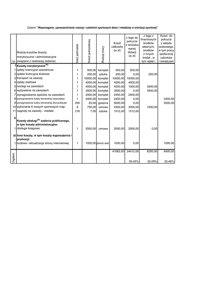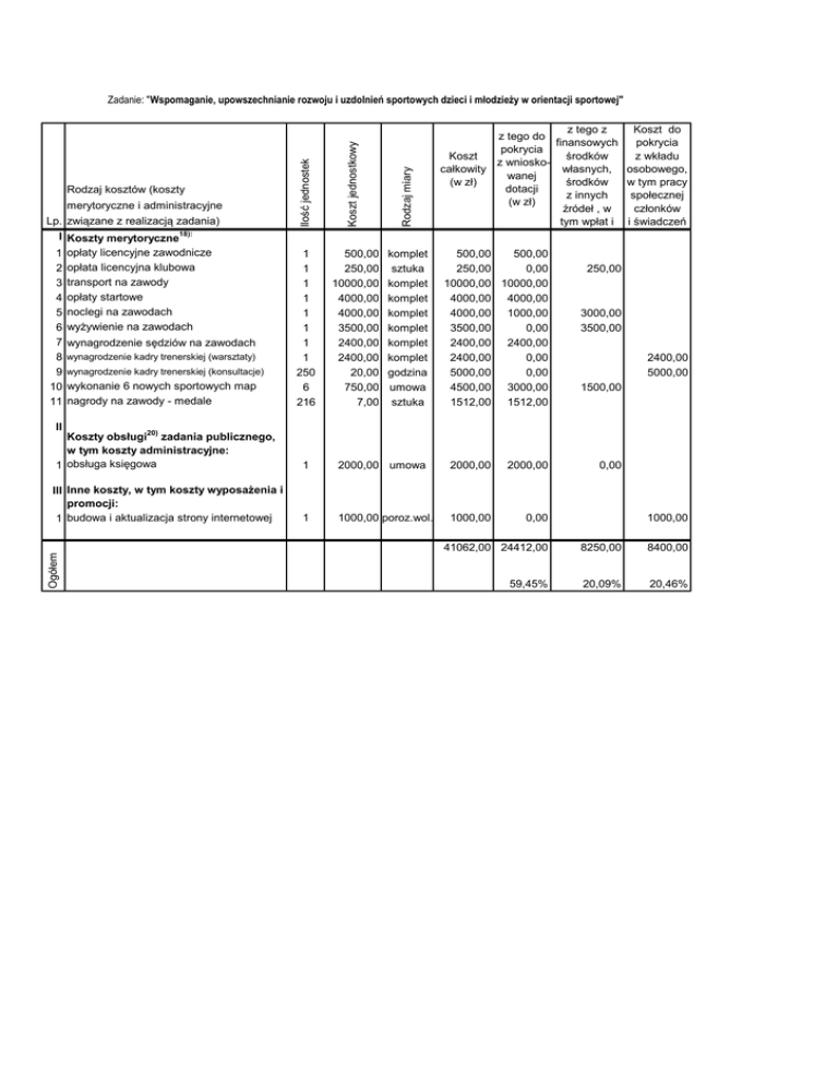 I Koszty merytoryczne18): 1 opłaty licencyjne zawodnicze 2 opłata licencyjna klubowa 3 transport na zawody 4 opłaty startowe 5 noclegi na zawodach 6 wyżywienie na zawodach 7 wynagrodzenie sędziów na zawodach 8 wynagrodzenie kadry trenerskiej (warsztaty) 9 wynagrodzenie kadry trenerskiej (konsultacje) 10 wykonanie 6 nowych sportowych map 11 nagrody na zawody - medale Rodzaj miary merytoryczne i administracyjne Lp. związane z realizacją zadania) Koszt jednostkowy Rodzaj kosztów (koszty Ilość jednostek Zadanie: "Wspomaganie, upowszechnianie rozwoju i uzdolnień sportowych dzieci i młodzieży w orientacji sportowej" 1 1 1 1 1 1 1 1 250 6 216 500,00 250,00 10000,00 4000,00 4000,00 3500,00 2400,00 2400,00 20,00 750,00 7,00 komplet sztuka komplet komplet komplet komplet komplet komplet godzina umowa sztuka z tego z Koszt do z tego do finansowych pokrycia pokrycia środków z wkładu Koszt z wnioskowłasnych, osobowego, całkowity wanej środków w tym pracy (w zł) dotacji z innych społecznej (w zł) źródeł , w członków tym wpłat i i świadczeń opłat0,00 wolontarius 500,00 500,00 250,00 0,00 10000,00 10000,00 4000,00 4000,00 4000,00 1000,00 3500,00 0,00 2400,00 2400,00 2400,00 0,00 5000,00 0,00 4500,00 3000,00 1512,00 1512,00 250,00 3000,00 3500,00 2400,00 5000,00 1500,00 II 1 2000,00 umowa 2000,00 2000,00 III Inne koszty, w tym koszty wyposażenia i promocji: 1 budowa i aktualizacja strony internetowej 1 1000,00 poroz.wol. 1000,00 0,00 Ogółem Koszty obsługi20) zadania publicznego, w tym koszty administracyjne: 1 obsługa księgowa 41062,00 24412,00 1,00 59,45% 0,00 1000,00 8250,00 8400,00 20,09% 20,46%