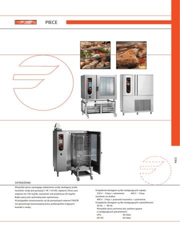PIECE PIECE OSTRZEŻENIE: Wszystkie piece wymagają uzdatnienia wody zasilającej, jeżeli: twardość wody jest powyżej 7 HF / 4.0 HD, stężenie chloru jest większe niż 150 mg/litr, zawartość soli przekracza 30 mg/litr. Bojler pieca jest automatycznie oprózniany. W przypadku niestosowania się do powyższych zaleceń FAGOR nie gwarantuje bezawaryjnej pracy podzespołów mających kontakt z wodą.. Urządzenia dostępne są dla następujących napięć: 230 V – 3 fazy + uziemienie 440 V – 3 fazy (zasilanie na statku) 400 V - 3 fazy + przewód neutralny + uziemienie Urządzenia dostępne są dla następujących częstotliwości: 50 Hz / 60 Hz Wszystkie piece powinny być zasilane gazem o następujących parametrach: LPG : 36 mbar GZ-50: 20 mbar PIECE VISUAL PLUS Seria Visual Plus Piece tej serii można opisać w dwóch słowach: dokładność i perfekcyjność. Piece Visual Plus reprezentują najwyższy model generacji Visual skonstruowany według ostatnich trendów i najnowszych osiągnięć technologicznych. Wyposażony jest w ekran dotykowy VGA umożliwiający wybranie programu gotowania. Nowa generacja pieców Visual Fagor industrial przedstawia nową generację innowacyjnych pieców serii Visual stanowiących odpowiedź producenta na coraz bardziej wymagające potrzeby szefów kuchni. Dzięki zastosowaniu najnowszych osiągnięć elektroniki stworzono nową gamę pieców doskonałych w swojej wszechstronności, charakteryzujących się ergonomiką, łatwością utrzymania higieny i perfekcją w gotowaniu. Wszystko to oznacza oszczędność twojego czasu i pieniędzy. Pięć różnych rozmiarów dostępnych jest w trzech seriach modeli. Visual Plus, Visual i Concept. Każda seria modeli dostępna jest w wersji elektrycznej i gazowej. 94 Piece Para wodna jest wytwarzana w niezależnym bojlerze oddzielnym od komory gotowania. Po włączeniu pieca znajduje się on w trybie ręcznym z możliwością wyboru programu: „Fagor Cooking / Gotowanie z Fagorem” (gotowanie na bazie twoich receptur lub tych zalecanych przez producenta Fagor) lub „Fagor Easy / Łatwe gotowanie z Fagorem” specjalnie przeznaczona funkcja do szybkiego i prostego gotowania z możliwością wyboru programu, temperatury i czasu. PIECE VISUAL PLUS Za pomocą przycisku „Menu” użytkownik może wybrać z pomiędzy dostępnych opcji operacje takie, jak: mycie, kontrola gotowania na różnych poziomach, opóźnienie startu programu gotowania / mycia, blokadę termiczną, program odkamieniania itp. Piec Visual Plus wyposażony jest w zaawansowany system utrzymania higieny składający się z pięciu różnych programów mycia komory gotującej: o o o o o Szybkie płukanie.............................................12 ‘ Półautomatyczne mycie (płukanie).............53 ’ Ekonomiczne mycie.......................................66 ’ Pośrednie mycie..............................................96 ’ Intensywne mycie....................................... 156 ’ Wszystkie piece w tej serii wyposażone są w sondę wielopunktową, timer półek, dotykowy panel, elektroniczną książkę kucharską. Za pomocą kilku kroków mamy możliwość stworzenia własnej technologii obróbki termicznej i zapisania jej w pamięci pieca. Możemy pochwalić się pięćdziesięcioletnim doświadczeniem w konstruowaniu urządzeń do mycia naczyń. Na pierwszy miejscu stawiamy ochronę środowiska i oszczędność energii. Dotykowy ekran panelu sterowania „Visual Plus” – Przykłady ekranów Łatwy dostęp do danej opcji jednym dotknięciem ekranu GOTOWANIE RĘCZNE: według własnego uznania AUTOMATYCZNE GOTOWANIE WEDŁUG RECEPTURY • Wybór funkcji gotowania • Wybór procentowego zaparowania komory • Wybór temperatury • Wybór czasu/temperatury sondy/ Delta-T • Wybór mocy • wybór własnego programu gotowania na PC lub na piecu konwekcyjno-parowym. • Możliwość przeniesienia receptury z jednego pieca do drugiego • Możliwość skopiowania lub zmiany receptur już zaprogramowanych • umieszczenie receptury z zewnętrznego urządzenia przez port USB lub Ethernet. GOTOWANIE WEDŁUG „FAGOR EASY”: poprzez naciśnięcie przycisku „Easy” przechodzimy do uproszczonego sterowania: • Wybór funkcji gotowania • Wybór temperatury • Wybór czasu PROGRAMOWANIE • pieca konwekcyjno-parowego na gotowanie i mycie na ustalony dzień i godzinę. • Ustawienie czasu gotowania dla każdego GN (na każdą półkę) z osobna, a piec konwekcyjno parowy sam da znać, kiedy zakończyć procesy. • Przegląd danych na temat zarejestrowanych procesów gotowania z ostatniego miesiąca. Piece 95 ELEKTRYCZNE PIECE VISUAL PLUS Wszystkie programy i funkcje dostępne są przez naciśnięcie odpowiedniej ikonki z ekranu dotykowego. HACCP pieca umożliwia przegląd i ściąganie danych z przebiegu obróbki termicznej, a przez złączę USB do pamięci przenośnej. Jak wszystkie piece nowej generacji model Visual Plus wyposażony jest w system diagnostyczny z łatwym dostępem bez konieczności demontowania zewnętrznych osłon. Użytkownik może szybko zweryfikować poprawność pracy wszystkich elementów operacyjnych pieca dzięki systemowi diagnostyki błędów. Dodatkowo kontrolki ostrzegawcze i alarmowe informują użytkownika o wykryciu typu nieprawidłowości. INNOWACYJNA TECHNOLOGIA W KUCHNI • • • • • Profesjonalna jakość Dokładność Doskonałość Idealne wyniki w gotowaniu Oszczędność czasu i pieniędzy DANE TECHNICZNE • • • • • • • • • • • • • • • • • • • • • • • • • 96 Piece Dotykowy panel sterowania Cztery programy gotowania: para regulowana, para z konwekcją tzw. mieszany tryb (regulacja wilgotności podczas gotowania), regeneracja i konwekcja (do 300ºC) Regulacja wartości Delta-T Tryb łatwego gotowania „Fagor Easy ” Zarządzenie programem gotowania “Fagor Cooking” Kontrola czasu gotowania na różnych poziomach GN 