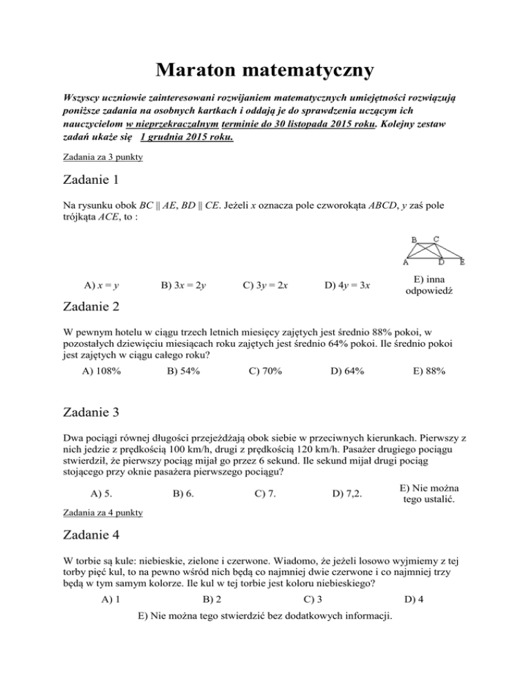 Maraton matematyczny Wszyscy uczniowie zainteresowani rozwijaniem matematycznych umiejętności rozwiązują poniższe zadania na osobnych kartkach i oddają je do sprawdzenia uczącym ich nauczycielom w nieprzekraczalnym terminie do 30 listopada 2015 roku. Kolejny zestaw zadań ukaże się 1 grudnia 2015 roku. Zadania za 3 punkty Zadanie 1 Na rysunku obok BC || AE, BD || CE. Jeżeli x oznacza pole czworokąta ABCD, y zaś pole trójkąta ACE, to : A) x = y B) 3x = 2y C) 3y = 2x D) 4y = 3x E) inna odpowiedź Zadanie 2 W pewnym hotelu w ciągu trzech letnich miesięcy zajętych jest średnio 88% pokoi, w pozostałych dziewięciu miesiącach roku zajętych jest średnio 64% pokoi. Ile średnio pokoi jest zajętych w ciągu całego roku? A) 108% B) 54% C) 70% D) 64% E) 88% Zadanie 3 Dwa pociągi równej długości przejeżdżają obok siebie w przeciwnych kierunkach. Pierwszy z nich jedzie z prędkością 100 km/h, drugi z prędkością 120 km/h. Pasażer drugiego pociągu stwierdził, że pierwszy pociąg mijał go przez 6 sekund. Ile sekund mijał drugi pociąg stojącego przy oknie pasażera pierwszego pociągu? A) 5. B) 6. C) 7. D) 7,2. E) Nie można tego ustalić. Zadania za 4 punkty Zadanie 4 W torbie są kule: niebieskie, zielone i czerwone. Wiadomo, że jeżeli losowo wyjmiemy z tej torby pięć kul, to na pewno wśród nich będą co najmniej dwie czerwone i co najmniej trzy będą w tym samym kolorze. Ile kul w tej torbie jest koloru niebieskiego? A) 1 B) 2 C) 3 E) Nie można tego stwierdzić bez dodatkowych informacji. D) 4 Zadanie 5 W trzech pudełkach jest razem 60 kart. Gdyby wszystkie karty z pierwszego pudełka przełożyć do drugiego pudełka, w pudełku tym byłoby dwa razy więcej kart niż w trzecim pudełku. Gdyby zaś wszystkie karty z trzeciego pudełka przełożyć do drugiego pudełka, w pudełku tym byłoby trzy razy więcej kart niż w pierwszym pudełku. Ile kart było w drugim pudełku? A) 10 B) 15 C) 20 D) 25 E) 30 Zadanie 6 Reszta z dzielenia liczby 1001 przez pewną liczbę jednocyfrową jest równa 5. Ile wynosi reszta z dzielenia 2006 przez tę samą liczbę jednocyfrową? A) 2. B) 3. C) 4. D) 5. E) 6. Zadania za 5 punktów Zadanie 7 Rysunek obok przedstawia dwa styczne koła o stosunku promieni 1:2. Ciemne koło toczy się bez poślizgu po okręgu koła większego. Jaki kształt ma droga przebyta przez punkt P toczącego się okręgu? B) A) E) C) D) Zadanie 8 Ile jest liczb 2008-cyfrowych, których każde dwie kolejne cyfry tworzą liczbę podzielną przez 17 lub przez 23? A) 5 B) 6 C) 7 D) 9 E) Więcej niż 9. Zadanie 9 Z miejscowości wyruszają co godzinę samochody i jadą tą samą drogą ze stałymi prędkościami. Pierwszy jedzie z prędkością 50 km/h, a każdy następny z prędkością o 1 km/h większą od poprzedniego. Ostatni z nich wyruszył 50 godzin po pierwszym i jedzie z prędkością 100 km/h. Jaka jest prędkość samochodu jadącego na czele kawalkady tych aut po 100 godzinach od momentu startu pierwszego samochodu? A) 50 km/h B) 66 km/h C) 75 km/h D) 84 km/h E) 100 km/h Zadanie 10 Dany jest ciąg liczbowy składający się z dwustu zer. Przekształcamy ten ciąg w inny ciąg dwustuelementowy w następujący sposób: W pierwszym etapie dodajemy do każdego wyrazu ciągu liczbę 1. W drugim etapie dodajemy do każdego wyrazu o numerze parzystym otrzymanego w pierwszym etapie ciągu liczbę 1. W trzecim etapie dodajemy do każdego wyrazu o numerze podzielnym przez trzy otrzymanego w drugim etapie ciągu liczbę 1, itd. Po 200 etapach otrzymamy ciąg, którego 120. wyraz będzie równy: A) 16 B) 12 C) 20 D) 24 E) 32