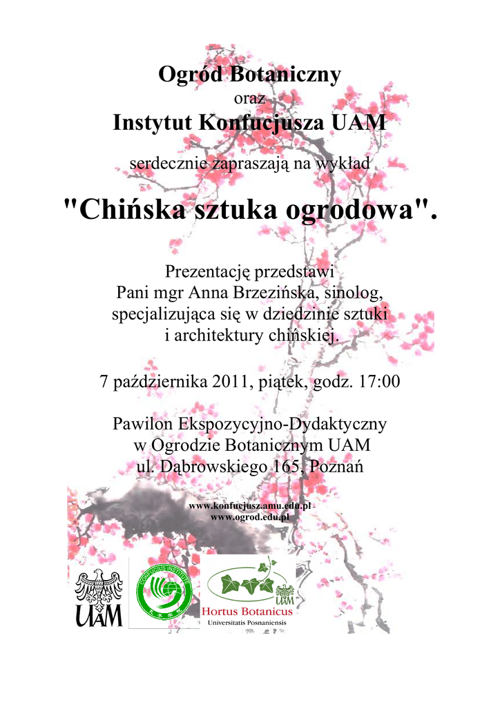 Ogród Botaniczny oraz Instytut Konfucjusza UAM serdecznie zapraszają na wykład "Chińska sztuka ogrodowa". Prezentację przedstawi Pani mgr Anna Brzezińska, sinolog, specjalizująca się w dziedzinie sztuki i architektury chińskiej. 7 października 2011, piątek, godz. 17:00 Pawilon Ekspozycyjno-Dydaktyczny w Ogrodzie Botanicznym UAM ul. Dąbrowskiego 165, Poznań www.konfucjusz.amu.edu.pl www.ogrod.edu.pl