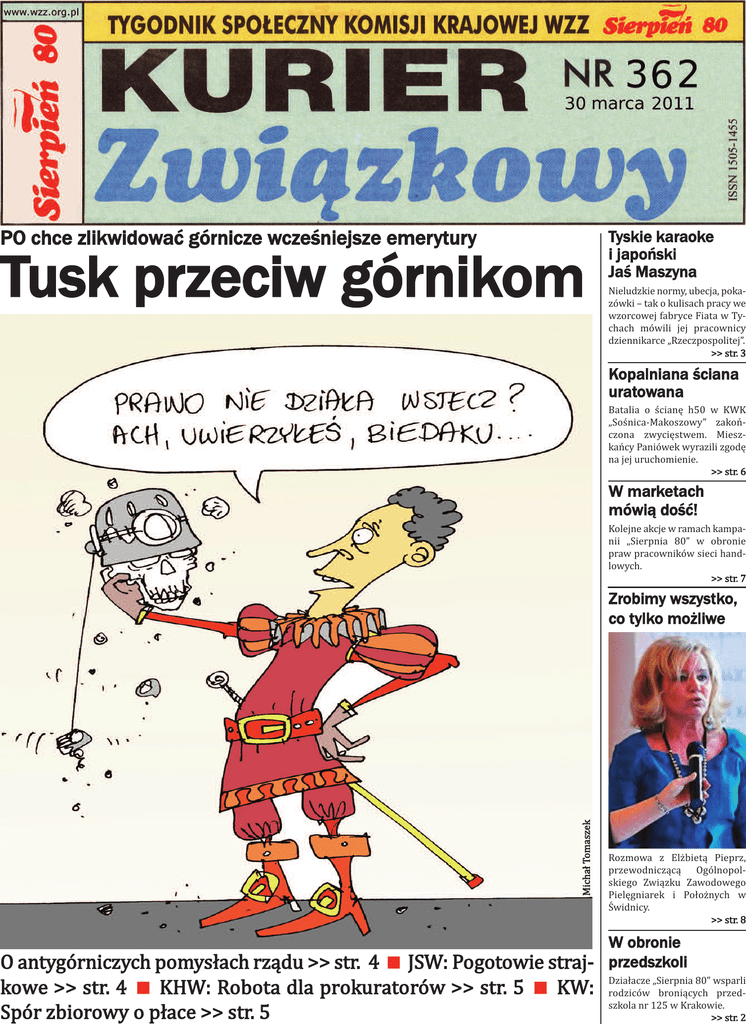 PO chce zlikwidować górnicze wcześniejsze emerytury Tusk przeciw górnikom Tyskie karaoke i japoński Jaś Maszyna Nieludzkie normy, ubecja, pokazówki – tak o kulisach pracy we wzorcowej fabryce Fiata w Tychach mówili jej pracownicy dziennikarce „Rzeczpospolitej”. >> str. 3 Kopalniana ściana uratowana Batalia o ścianę h50 w KWK „Sośnica-Makoszowy” zakończona zwycięstwem. Mieszkańcy Paniówek wyrazili zgodę na jej uruchomienie. >> str. 6 W marketach mówią dość! Kolejne akcje w ramach kampanii „Sierpnia 80” w obronie praw pracowników sieci handlowych. >> str. 7 Michał Tomaszek Zrobimy wszystko, co tylko możliwe O antygórniczych pomysłach rządu >> str. 4 < JSW: Pogotowie strajkowe >> str. 4 < KHW: Robota dla prokuratorów >> str. 5 < KW: Spór zbiorowy o płace >> str. 5 Rozmowa z Elżbietą Pieprz, przewodniczącą Ogólnopolskiego Związku Zawodowego Pielęgniarek i Położnych w Świdnicy. >> str. 8 W obronie przedszkoli Działacze „Sierpnia 80” wsparli rodziców broniących przedszkola nr 125 w Krakowie. >> str. 2 Za PO ceny zaczynają się od 5 złotych Ceny cukru dochodzą do 7 zł za kilogram. Pociągnie to za sobą wzrost cen innych produktów, do produkcji których potrzeba tych słodkich kryształków. 2-3 lata temu rząd Donalda Tuska nie zrobił niczego w celu ratowania polskiego rolnictwa buraczanego i przemysłu cukrowego. Raz za razem zamykano polskie cukrownie, a ich pracowników posyłano na zieloną trawkę. Skutek tego odczuwamy dziś w portfelach kupując cukier po 7 zł, nierzadko importowany. W ubiegłym tygodniu media informowały, że „Zachód” zazdrości nam wysokiego udziału transportu zbiorowego, publicznego w przewozach osobowych. Czy biedy i tego, że Polaków nie stać coraz częściej na podróżowanie własnymi samochodami można zazdrościć? Bo to nie wolny wybór, a przymus ekonomiczny. Płaca minimalna nie pozwala na zaspokojenie podstawowych potrzeb, a wzrasta liczba osób, która i tak ma płacone poniżej jej kwoty z powodu zatrudnienia na cywilnoprawnych umowach śmieciowych. 5 zł za litr paliwa to ciężar nie do udźwignięcia dla coraz większych rzesz ludzi. Stąd wybierają autobusy i tramwaje. Rosną negatywne nastroje społeczne. Rządowym specjalistom od PR i propagandy coraz trudniej będzie zastępować realne problemy polskich rodzin tematami zastępczymi w stylu kłótni o Smoleńsk czy los Kadafiego. Swój głos sprzeciwu podnoszą nawet pracownicy przemysłu motoryzacyjnego, co świadczy, że naprawdę jest źle. Ludzie mają już dość zaciskania pasa. Nie mają już czego zaciskać, bo potrzaskają sobie kości. Tłuszcz dawno im się już skończył. Wystarczy, że ktoś – jakiś zakład pracy lub grupa zawodowa dadzą przykład, że tylko walcząc można coś wywalczyć, a w ślad za tym pójdą kolejni. Kolejni mający dość jałmużny za ciężką pracę, dość zamykania szkół czy urzędowych pocztowych, dość prywatyzacji ich szpitali i uwłaszczania się na majątku publicznym. Ludzie po prostu w końcu będą mieli dość draństwa w wydaniu Platformy Obywatelskiej. W PRL każda podwyżka cen żywności kończyła się olbrzymimi protestami i strajkami. W polskim kapitalizmie podwyżek niewidzialna ręka wolnego rynku dokonywała dotąd podczas społecznego głębokiego snu obywateli. To się już zmienia. Ludzie się budzą. I niech rząd PO modli się o to, by Polacy po przebudzeniu nie wstali lewą nogą, bo będzie gorąco! Patryk Kosela Kraków W obronie przedszkoli i miejsc pracy w nich W czwartek 24 marca, przed przedszkolem nr 125 w Krakowie, odbył się protest rodziców, wsparty przez związkowców WZZ „Sierpień 80” z marketu budowlanego OBI, krakowską Polską Partię Pracy-Sierpień 80 oraz Federację Anarchistyczną. Zebrani przedstawili mediom sytuację przedszkola, która wygląda tak, iż filia przedszkola nr 125 na osiedlu Oświecenia ma zostać zlikwidowana, a na jej miejsce ma zostać wprowadzone przedszkole nr 64, które straciło swoją placówkę po wypowiedzeniu najmu przez właściciela budynku – potentata tytoniowego Philip Morris. Rodzice i pracownicy ze sto dwudziestki piątki obawiają się utraty miejsc przedszkolnych, podwyższenia opłat i likwidacji miejsc pracy. Dotychczas rodzice mogli posyłać swoje dzieci do przedszkola taniej, gdyż część wydatków związanych z jego utrzymaniem ponosili sami – finansowo czy poprzez pracę społeczną (remonty itp). Teraz jednak ceny zostaną „zrównane w górę”, a mimo obietnic władz dotyczących rozbudowy przedszkola, nie jest pewnym, czy wszystkie dzieci będą miały szansę na dostęp do opieki przedszkolnej. Rodzice nie ufają zapewnieniom władz miasta, które poszły oczywiście na łatwiznę i zamiast zdjęcie: „Gazeta Krakowska” KOMENTARZ TYGODNIA walczyć o utrzymanie przedszkola nr 64 w dotychczasowym budynku, czy zainwestowanie w przedszkolne pustostany w Nowej Hucie, dokonały zwyczajnych cięć; w sytuacji gdy dostęp do przedszkoli i żłobków w Krakowie jest już dostatecznie trudny. „Sierpień 80” oraz PPP wspomogły walkę rodziców i deklarują dalsze wsparcia. W naszych materiałach kolporto- wanych na proteście domagamy się rozwoju zamiast niszczenia naszych usług publicznych oraz społecznej kontroli pracowników i rodziców nad przedszkolami, gdyż jak widać rajcom na nich nie zależy. Mamy nadzieję, że nie był to ostatni protest w tej sprawie, a jedynie pierwszy krok w stronę mobilizacji społeczeństwa przeciwko niszczeniu usług publicznych. Kacper Pluta Państwowa Inspekcja Pracy ma co robić Michał Tomaszek „Dziennik Gazeta Prawna” podał, że ubiegły rok był rekordowy pod względem ilości skarg jakie pracownicy złożyli w oddziałach Państwowej Inspekcji Pracy. Z danych PIP wynika, że w 2010 roku aż o 22 proc. wzrosła liczba pracowników skarżących się na warunki pracy i płacy. Przełożyło się to łącznie na ponad 91 ty