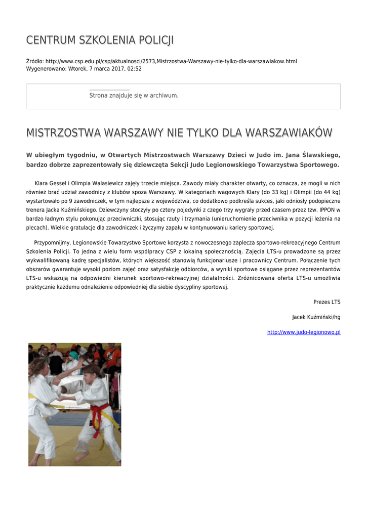 CENTRUM SZKOLENIA POLICJI Źródło: http://www.csp.edu.pl/csp/aktualnosci/2573,Mistrzostwa-Warszawy-nie-tylko-dla-warszawiakow.html Wygenerowano: Wtorek, 7 marca 2017, 02:52 Strona znajduje się w archiwum. MISTRZOSTWA WARSZAWY NIE TYLKO DLA WARSZAWIAKÓW W ubiegłym tygodniu, w Otwartych Mistrzostwach Warszawy Dzieci w Judo im. Jana Ślawskiego, bardzo dobrze zaprezentowały się dziewczęta Sekcji Judo Legionowskiego Towarzystwa Sportowego. Klara Gessel i Olimpia Walasiewicz zajęły trzecie miejsca. Zawody miały charakter otwarty, co oznacza, że mogli w nich również brać udział zawodnicy z klubów spoza Warszawy. W kategoriach wagowych Klary (do 33 kg) i Olimpii (do 44 kg) wystartowało po 9 zawodniczek, w tym najlepsze z województwa, co dodatkowo podkreśla sukces, jaki odniosły podopieczne trenera Jacka Kuźmińskiego. Dziewczyny stoczyły po cztery pojedynki z czego trzy wygrały przed czasem przez tzw. IPPON w bardzo ładnym stylu pokonując przeciwniczki, stosując rzuty i trzymania (unieruchomienie przeciwnika w pozycji leżenia na plecach). Wielkie gratulacje dla zawodniczek i życzymy zapału w kontynuowaniu kariery sportowej. Przypomnijmy. Legionowskie Towarzystwo Sportowe korzysta z nowoczesnego zaplecza sportowo-rekreacyjnego Centrum Szkolenia Policji. To jedna z wielu form wspólpracy CSP z lokalną społecznością. Zajęcia LTS-u prowadzone są przez wykwalifikowaną kadrę specjalistów, których większość stanowią funkcjonariusze i pracownicy Centrum. Połączenie tych obszarów gwarantuje wysoki poziom zajęć oraz satysfakcję odbiorców, a wyniki sportowe osiągane przez reprezentantów LTS-u wskazują na odpowiedni kierunek sportowo-rekreacyjnej działalności. Zróżnicowana oferta LTS-u umożliwia praktycznie każdemu odnalezienie odpowiedniej dla siebie dyscypliny sportowej. Prezes LTS Jacek Kuźmiński/hg http://www.judo-legionowo.pl Ocena: 5/5 (1) Tweetnij