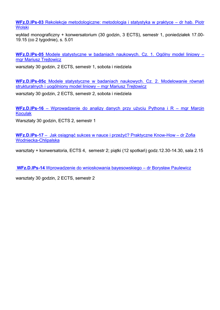 WFz.D.IPs-03 Rekolekcje metodologiczne: metodologia i statystyka w praktyce – dr hab. Piotr Wolski wykład monograficzny + konwersatorium (30 godzin, 3 ECTS), semestr 1, poniedziałek 17.0019.15 (co 2 tygodnie), s. 5.01 WFz.D.IPs-05 Modele statystyczne w badaniach naukowych. Cz. 1. Ogólny model liniowy – mgr Mariusz Trejtowicz warsztaty 30 godzin, 2 ECTS, semestr 1, sobota i niedziela WFz.D.IPs-05c Modele statystyczne w badaniach naukowych. Cz. 2. Modelowanie równań strukturalnych i uogólniony model liniowy – mgr Mariusz Trejtowicz warsztaty 30 godzin, 2 ECTS, semestr 2, sobota i niedziela WFz.D.IPs-16 – Wprowadzenie do analizy danych przy użyciu Pythona i R – mgr Marcin Koculak Warsztaty 30 godzin, ECTS 2, semestr 1 WFz.D.IPs-17 – Jak osiągnąć sukces w nauce i przeżyć? Praktyczne Know-How – dr Zofia Wodniecka-Chlipalska warsztaty + konwersatoria, ECTS 4, semestr 2; piątki (12 spotkań) godz.12.30-14.30, sala 2.15 WFz.D.IPs-14 Wprowadzenie do wnioskowania bayesowskiego – dr Borysław Paulewicz warsztaty 30 godzin, 2 ECTS, semestr 2 dr hab. Piotr Wolski Rekolekcje metodologiczne: metodologia i statystyka w praktyce Propozycja jest odpowiedzią na zgłaszane przez doktorantów psychologii zapotrzebowanie na kurs, który stwarzałby okazję do odświeżenia i uporządkowania najważniejszych zagadnień metodologii i statystyki – w kontekście realnych zastosowań w prowadzonych / planowanych badaniach. Wiele osób chciałoby też wiedzieć, czego w istocie prawdopodobieństwem jest magiczne p i dlaczego to dobrze, jeśli jest mniejsze od 0,05. Kurs odpowie na to i szereg innych fundamentalnych pytań w sposób zrozumiały dla każdego. Wiele nierozsądnych decyzji metodologicznych psychologowie podejmują w mniej lub bardziej uzasadnionym poczuciu niewystarczającej własnej kompetencji. Owo poczucie skłania ich do lękowego (czyli bezrefleksyjnego) schematyzmu. Niestety, rozpowszechniane „pocztą pantoflową” schematy często są w naszej dyscyplinie bardzo niedobre i wielu fachowców uważa, że powinny być jak najprędzej zmienione, bo nie mają zbyt wiele sensu. Mało kto z początkujących badaczy zdaje sobie sprawę, że nawet bardzo elementarna i fragmentaryczna wiedza metodologiczna wystarcza do samodzielnego podejmowania trafnych decyzji badawczych i interpretacyjnych, np. sensownego poradzenia sobie z odwiecznym dylematem p = 0,07… Najważniejsze z zagadnień: Planowanie eksperymentów – schematy eksperymentalne a korelacyjne, poziomy pomiaru zmiennych, wyjaśnianie wariancji Statystyka opisowa – miary tendencji centralnej, miary zmienności, ilustracja graficzna Korelacja, regresja, analiza czynnikowa, analiza skupień Podstawy wnioskowania statystycznego Estymacja, testy istotności, metody nieparametryczne Moc testu, wielkość efektu Psychometria, konstrukcja ankiet, kwestionariuszy, rzetelność Pakiet SPSS PC Podstawa zaliczenia: kurs kończy się oceną, której podstawą jest liczba punktów zdobytych za pracę końcową, dwie prace kontrolne, oraz obecność i aktywne uczestnictwo w zajęciach. Forma zajęć: Wykład, konwersatorium Wymagania wstępne: Wiedza z zakresu metodologii badań oraz analiz statystycznych na poziomie podstawowym. Termin: I semestr Mgr Mariusz Trejtowicz Modele statystyczne w badaniach naukowych. Cz. 1. Ogólny model liniowy Ogólny cel kursu: Celem kursu jest nabycie oraz rozwój podstawowych umiejętności analizy danych począwszy od przygotowania danych do analiz, poprzez ich eksplorację, do modelowania statystycznego (na bazie Ogólnego Modelu Liniowego) i prezentacji wyników modelu. Problematyka: Warsztat obejmował będzie następujące zagadnienia: przygotowanie danych do analiz, techniki Eksploracyjnej Analizy Danych, analiza i imputacja braków danych, eksploracja danych z wykorzystaniem analizy głównych składowych oraz analizy skupień, wprowadzenie do ogólnego modelu liniowego, wykrywania problemów związanych z wykorzystaniem ogólnego modelu liniowego, diagnostyki założeń modelu, testowania hipotez użytkownika, poprawnej interpretacji wyników analiz i wizualizacji, wykorzystania w analizach oprogramowania statystycznego (SPSS i R). Sposób realizacji: Zajęcia przy komputerze. Praca z oprogramowaniem IBM SPSS Statistics oraz R. Spodziewany efekt: Uczestnicy warsztatu powinni nabyć umiejętność realizacji analizy danych z wykorzystaniem ogólnego modelu liniowego obejmującą diagnostykę modeli, interpretację wyników analiz oraz planowanie i realizację porównań pomiędzy modelami. Rezultatem warsztatu powinna być również umiejętność krytycznej analizy wyników badań Forma zajęć: Warsztaty 30 godzin. Wymagania wstępne: Wiedza z zakresu metodologii badań oraz analiz statystycznych na poziomie podstawowym. Forma zaliczenia: Praca zaliczeniowa z poprawnie zastosowanymi metodami statystycznymi w postaci raportu z analizy danych. Termin: I semestr Realizacja w trybie weekendowym: 4 dni (2 weekendy) w terminie ustalonym z uczestnikami. mgr Mariusz Trejtowicz Modele statystyczne w badaniach naukowych. Cz. 2. Modelowanie równań strukturalnych i uogólniony model liniowy. Ogólny cel kursu: Celem kursu jest wprowadzenie w dwa rozszerzenia ogólnego modelu liniowego: modelowanie równań strukturalnych, uogólniony model liniowy. W trakcie warsztatów uczestnicy będą mogli poznać podstawowe możliwości oraz ograniczenia tych metod. Warsztat będzie koncentrował się na poprawnej interpretacji wyników analizy oraz standardach raportowania wyników. Problematyka: W ramach warsztatu omawiane będą podstawy analizy przyczynowej z wykorzystaniem modelowania równań strukturalnych. Zakres omawianych zagadnień będzie obejmował, m.in.: analizę mediacji, zastosowania analizy ścieżek, przyczynową interpretację wyników modelu strukturalnego, zagadnienia dopasowania modelu strukturalnego do danych, interpretację wyników konfirmacyjnej analizy czynnikowej, znaczenie