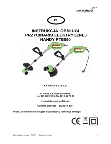 PL INSTRUKCJA OBSŁUGI PRZYCINARKI ELEKTRYCZNEJ HANDY PTE550 KRYSIAK sp. z o.o. ul. Rolna 6, 62-081 Baranowo tel. 061 652 73 05, fax 061 652 73 15 wyprodukowano w Chinach wydanie pierwsze – grudzień 2014 Przed uruchomieniem urządzenia przeczytaj instrukcję obsługi! Instrukcja oryginalna – PL/2014 - Copyright by AM 1 DZIECIOM NIE WOLNO URUCHAMIAĆ PRZYCINARKI ELEKTRYCZNEJ! UWAGA NA WIRUJĄCĄ ŻYŁKĘ TNĄCĄ! PRZED SPRAWDZENIEM, CZYSZCZENIEM, NAPRAWĄ PRZYCINARKI ELEKTRYCZNEJ ODŁĄCZYĆ PRZEWÓD ZASILANIA PO WYŁĄCZENIU PRZYCINARKI ŻYŁKA TNĄCĄ OBRACA SIĘ JESZCZE, AŻ DO CAŁKOWITEGO ZATRZYMANIA Uwaga Zmiany techniczne i optyczne mogą być wprowadzane bez zapowiedzi, w trakcie procesu modyfikacji i ulepszania produktów. Wszelkie wymiary, wskazówki i dane podane w niniejszej instrukcji obsługi są w związku z tym podawane w sposób niewiążący. Roszczenia zgłaszane na podstawie treści instrukcji obsługi są nieważne. Zastosowanie Przycinarka jest przeznaczona do przycinania trawy w ogrodach wzdłuż obrzeży (np. trawników, klombów itp.). Każde inne zastosowanie może spowodować uszkodzenie urządzenia i być źródłem groźnego niebezpieczeństwa dla użytkownika. Nie wolno przycinać mokrej trawy, zroszonej trawy, roślin o twardych łodygach. Urządzenie nie jest przeznaczone do koszenia trawy w parkach, miejscach publicznych, polach itp. Instrukcja oryginalna – PL/2014 - Copyright by AM 2 Urządzenie nie jest przeznaczone do pracy ciągłej! Max czas pracy to 10-15 minut jednorazowo, potem przerwa. Piktogramy Symbol ostrzeżenia przed niebezpieczeństwem, zagrożeniem Przeczytaj instrukcję obsługi Noś osłonę oczu i uszu Uważaj na wyrzucane przedmioty; trzymaj inne osoby na dystans. W razie uszkodzenia lub przecięcia przewodu elektrycznego natychmiast wyciągnij wtyczkę z gniazdka. Chroń urządzenie przez wilgocią. Nie pracuj w czasie deszczu Dane techniczne Napięcie znamionowe Moc urządzenia Obroty bez obciążenia Średnica cięcia Grubość żyłki tnącej Typ głowicy żyłkowej Waga Poziom mocy akustycznej Poziom ciśnienia akustycznego Wibracje przy uchwycie 230 V / 50 Hz 550 W 10.500 obr/min 290 mm 1,3 mm Półautomatyczna 2,4 kg 96 dB(A) 85 dB(A) 4,562 m/s2 k=1,5 m/s2 Nazewnictwo elementów składowych przycinarki (rys. 1) 1. 2. 3. 4. 5. 6. 7. Obudowa przycinarki Osłona bezpieczeństwa Uchwyt Włącznik Uchwyt dodatkowy Rura teleskopowa Kółko podpórkowe Instrukcja oryginalna – PL/2014 - Copyright by AM 3 8. Pokrętło do ustawiania kąta pracy głowicy 9. Przycisk blokowania rury teleskopowej 10. Głowica z żyłką nocną Podwójna izolacja Urządzenie jest podwójnie izolowane. Wszystkie części wewnętrzne są izolowane od źródeł zasilania elektrycznego. Dlatego nie ma też konieczności uziemienia urządzenia. Ogólne zasady bezpieczeństwa Przed rozpoczęciem pracy z urządzeniem zapoznaj się dokładnie z wszystkimi jego elementami. Przećwicz sposób pracy z urządzeniem i poproś doświadczonego użytkownika lub specjalistę o wyjaśnienie funkcji i sposobu działania urządzenia oraz technik pracy. Upewnij się, że w razie nagłej potrzeby możesz natychmiast wyłączyć urządzenia. Nieprawidłowe użytkowanie może doprowadzić do ciężkich zranień. Uwaga! Przy korzystaniu z narzędzi elektrycznych należy przestrzegać podanych niżej podstawowych środków bezpieczeństwa, zabezpieczających przed porażeniem prądem elektrycznym, zranieniem i pożarem. Praca z elektryczną przycinarką do trawy - To urządzenie elektryczne nie jest przeznaczone do używania przez osoby (włącznie z dziećmi) o ograniczonych zdolnościach fizycznych, zmysłowych lub umysłowych lub osoby nieposiadające odpowiedniej wiedzy i/lub doświadczenia, chyba, że będą one pracować pod nadzorem odpowiedzialnej za ich bezpieczeństwo osoby lub otrzymają od niej wskazówki, jak powinno być używane urządzenie. - Trzymaj urządzenie z daleka od dzieci i zwierząt domowych. Dzieci należy nadzorować, aby wykluczyć zabawę z urządzeniem. - Urządzenie nie może być obsługiwane przez dzieci. Pracy z urządzeniem zabrania się osobom, które nie znają całej instrukcji obsługi. Prawo i przepisy lokalne mogą określać minimalny wiek użytkownika urządzenia. - Trzymaj urządzenie z daleka od ludzi – przede wszystkim dzieci – oraz zwierząt domowych. Jeżeli w pobliżu przebywają ludzie (a zwłaszcza dzieci) czy zwierzęta domowej, przerwij pracę! Zawsze zachowuj wokół siebie odstęp bezpieczeństwa równy 15 m. Spod urządzenia mogą być wyrzucane kamyki i żwir, które mogą spowodować zranienie. - Używaj odpowiedniej odzieży roboczej i osobistego wyposażenia ochronnego! Zawsze noś okulary ochronne lub zabezpieczenie oczu, nauszniki, buty z cholewą lub buty z podeszwą przeciwpoślizgową i mocne, długie spodnie oraz rękawice robocze. - Przy pracy zapewnij sobie stabilną postawę. Zachowaj szczególną ostrożność przy pracy na pochyłościach. - Nie pracuj z urządzeniem, jeśli jesteś zmęczony albo, jeśli piłeś alkohol lub przyjmowałeś tabletki. Zawsze dostatecznie wcześnie rób przerwy na odpoczynek. - Nie pracuj na deszczu, podczas złej pogody lub w wilgotnym otoczeniu. Pracuj wyłącznie przy dobrym oświetleniu. Instrukcja oryginalna – PL/2014 - Copyright by AM 4 - Element osłonowy i środki ochrony osobistej chronią Twoje zdrowie oraz zdrowie innych osób i zapewniają prawidłową pracę urządzenia. - Nie pracuj uszkodzonym, niekompletnym lub przebudowanym bez zgody producenta urządzeniem. Nigdy nie używaj urządzenia z uszkodzonym wyposażeniem ochronnym. Przed użyciem sprawdź bezpieczeństwo urządzenia, a szczególnie przewód zasilający prądem elektrycznym, włącznik-wyłącznik i osłonę ochronną. - Przy włączaniu urządzenia oraz przy pracującym silniku trzymaj żyłkę tnącą z dala od wszelkich części ciała, a przede wszystkim od rąk i stóp. - Nie uruchamiaj 