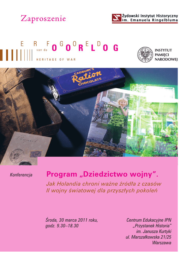 Zaproszenie H E R I TA G E O F W A R Konferencja Program „Dziedzictwo wojny”. Jak Holandia chroni ważne źródła z czasów II wojny światowej dla przyszłych pokoleń Środa, 30 marca 2011 roku, godz. 9.30–18.30 Centrum Edukacyjne IPN „Przystanek Historia” im. Janusza Kurtyki ul. Marszałkowska 21/25 Warszawa 2 Konferencja Program „Dziedzictwo wojny”. Jak Holandia chroni ważne źródła z czasów II wojny światowej dla przyszłych pokoleń 3 Haga, marzec 2011 Program „Dziedzictwo wojny”, prowadzony w latach 2007–2010 przez holenderskie Ministerstwo Zdrowia, Opieki Społecznej i Sportu, miał zachować ważne materiały dotyczące II wojny światowej i pochodzące z jej okresu oraz udostępnić je publiczności po to, by podtrzymać pamięć o wojnie, teraz i w przyszłości. Organizacje zaangażowane w ochronę naszego dziedzictwa z czasów wojny mogły ubiegać się o fundusze z programu. Przyznano 221 grantów dla projektów, na przykład: digitalizacji źródeł, zbierania relacji świadków i cyfrowej rekonstrukcji źródeł. Poza tematami ogólnoholenderskimi specjalną wagę przykładano do wydarzeń regionalnych i lokalnych oraz do tematów dotąd zaniedbanych badawczo. We współpracy z wieloma dużymi organizacjami zajmującymi się zachowaniem wojennego dziedzictwa program doprowadził do powstania kilku dużych narodowych zbiorów źródeł z czasów II wojny światowej, dostępnych za darmo w Internecie. Program „Dziedzictwo wojny” miał zgromadzić kluczowe materiały źródłowe i zachować je dla przyszłych pokoleń. Oficjalnie zakończyła go pod koniec 2010 roku konferencja; dokonano też oceny wewnętrznej i zewnętrznej. Rząd Holandii chciałby podzielić się doświadczeniami z realizacji tego udanego programu z innymi państwami, które mają zbiory źródeł z czasów wojny. Tym samym z przyjemnością zapraszamy Państwa na tę konferencję, zorganizowaną wspólnie z Instytutem Pamięci Narodowej i Żydowskim Instytutem Historycznym. Mam nadzieję, że spotkamy się w środę 30 marca 2011 roku. Z wyrazami szacunku Mr Marcel Floor dyrektor Wydziału Ofiar i Pamięci Ministerstwa Zdrowia, Opieki Społecznej i Sportu Holandii 4 Konferencja Program „Dziedzictwo wojny”. Jak Holandia chroni ważne źródła z czasów II wojny światowej dla przyszłych pokoleń Program, środa, 30 marca 2011 roku O brady konferencji prowadzone będą w języku polskim i angielskim z tłumaczeniem symultanicznym. 09.30–10.00 Rejestracja uczestników 10.00–10.50 Otwarcie i powitanie Dr Łukasz Kamiński dyrektor Biura Edukacji Publicznej Instytutu Pamięci Narodowej Dr Eleonora Bergmandyrektor Żydowskiego Instytutu Historycznego Przedstawiciele polskiego Ministerstwa Kultury i Dziedzictwa Narodowego i Ministerstwa Edukacji Narodowej 10.50–12.30 Prezentacja holenderskiego programu „Dziedzictwo wojny” Wprowadzenie do programu „Dziedzictwo wojny” Mr Marcel Floor dyrektor Wydziału Ofiar i Pamięci Ministerstwa Zdrowia, Opieki Społecznej i Sportu Holandii Film pokazujący różnorodność projektów Wyjście z cienia. Kobiety w holenderskim ruchu oporu Prof. Marjan Schwegman dyrektor Instytutu Badań nad Wojną, Holocaustem i Ludobójstwem Film pokazujący dokładniej pięć projektów 12.30–14.00 Lunch 14.00–16.50 Międzynarodowy punkt widzenia Edukacja ----------------------- Historia która żyje – II wojna światowa w zajęciach edukacyjnych Biura Edukacji Publicznej Instytutu Pamięci Narodowej Aleksandra Sulej Biuro Edukacji Publicznej Instytutu Pamięci Narodowej Relacje świadków historii jako źródło pracy warsztatowej z młodzieżą w Domu Spotkań z Historią Dr Marta Pietrzykowska Sekcja Edukacyjna Domu Spotkań z Historią 5 Nauczanie historii Holocaustu z wykorzystaniem komiksu. Perspektywy edukacyjne Muzeum Anny Frank w Amsterdamie Drs Julia SarboWydział Edukacji Muzeum Anny Frank w Amsterdamie Pamięć ------------- Wojenne losy polskich obywateli pod okupacją niemiecką i sowiecką w archiwach i projektach Ośrodka KARTA A licja Wancerz-GluzaOśrodek KARTA Koncepcja programowa Muzeum II Wojny Światowej w Gdańsku Dr hab. Piotr M. Majewskizastępca dyrektora Muzeum II Wojny Światowej Między dumą a wstydem. Pokłosie II wojny światowej w Holandii (z odniesieniami międzynarodowymi) Chris van der Heijden historyk, publicysta i wykładowca, Szkoła Dziennikarska w Utrechcie, Uniwersytet Nauk Społecznych, Utrecht Przerwa kawowa Digitalizacja ----------------------- Archiwum cyfrowe Instytutu Pamięci Narodowej. Pierwsze wnioski z realizacji projektu Andrzej Pieczunkop.o. zastępca dyrektora Biura Udostępniania i Archiwizacji Dokumentów Instytutu Pamięci Narodowej Digitalizacja kolekcji archiwalnych Żydowskiego Instytutu Historycznego Agnieszka ReszkaŻydowski Instytut Historyczny Obrazy dla przyszłości? Hans van der Windt kierownik działu nabytków, Holenderski Instytut Dźwięku i Obrazu 16.50–17.30Dyskusja panelowa prowadzona przez dr Eleonorę Bergman, dyrektor Żydowskiego Instytutu Historycznego 17.30–18.30 Rozmowy kuluarowe 6 Konferencja Program „Dziedzictwo wojny”. Jak Holandia chroni ważne źródła z czasów II wojny światowej dla przyszłych pokoleń 7 Kontakt z organizatorami: Edyta Kurek Żydowski Instytut Historyczny Tel. +48.22.827.92.21 E-mail: [email protected] Anna Piekarska Instytut Pamięci Narodowej (IPN) Tel. +48.22.431.83.70 E-mail: [email protected] Drs Dorien Korsten Program „Dziedzictwo wojny“ Ministerstwo Zdrowia, Opieki Społecznej i Sportu Holandii Tel. +31.70.340.6643 Tel. komórkowy: +31.6.20.59.8058 E-mail: [email protected] Wstęp wolny Konferencja Program „Dziedzictwo wojny”. Jak Holandia chroni ważne źródła z czasów II wojny światowej dla przyszłych pokoleń Środa, 30 marca 2011 roku, godz. 9.30–18.30 Centrum Edukacyjne IPN „Przystanek Historia” im. Janusza Kurtyki ul. Marszałkowska 21/25 Warszawa