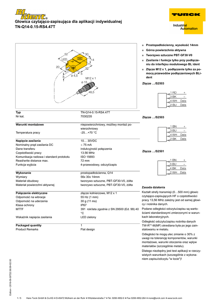 Głowica czytająco-zapisująca dla aplikacji indywidualnej TN-Q14-0.15-RS4.47T ■ Prostopadłościenny, wysokość 14mm ■ Górna powierzchnia aktywna ■ Tworzywo sztuczne PBT-GF30-V0 ■ Zasilanie i funkcja tylko przy podłączeniu do interfejsu modułowego BL ident ■ Złącze M12 x 1, podłączenie tylko za pomocą przewodów podłączeniowych BLident Złącze …/S2503 Typ Nr kat. TN-Q14-0.15-RS4.47T 7030235 Warunki montażowe Temperatura pracy niepowierzchniowy, możliwy montaż powierzchniowy -25…+70 °C Napięcie zasilania Nominalny prąd zasilania DC Dane transferu Częstotliwość pracy Komunikacja radiowa i standard protokołu Read/write distance max. Funkcja wyjścia 10… 30VDC ð 75 mA indukcyjność połączenia 13.56 MHz ISO 15693 72 mm 4-przewodowy, odczyt/zapis Wykonanie Wymiary Materiał obudowy Materiał powierzchni aktywnej prostopadłościenna, Q14 56x 30x 14mm tworzywo sztuczne, PBT-GF30-V0, żółta tworzywo sztuczne, PBT-GF30-V0, żółta Połączenie elektryczne Odporność na wibracje Odporność na uderzenia Klasa ochrony MTTF Wskaźnik napięcia zasilania złącze kołnierzowe, M12 x 1 55 Hz (1 mm) 30 g (11 ms) IP67 391 rok/lata zgodnie z SN 29500 (Ed. 99) 40 °C LED zielony Packaged quantity Product Remarks 1 Flat design Złącze …/S2503 Złącza …/S2501 Zasada działania Kształt strefy transmisji (0…500 mm) głowic czytająco-zapisujących HF o częstotliwości pracy 13,56 MHz zależny jest od samej głowicy i nośnika danych. Podane odległości odczytu/zapisu są wartościami standardowymi zmierzonymi w warunkach laboratoryjnych. Odległość odczytu/zapisu nośnika danych TW-R**-M(MF) określana była po jego zainstalowaniu w metalu. Odległości te mogą ulec zmianie o 30% z uwagi na tolerancję komponentów, warunki montażowe, warunki otoczenia oraz wpływ materiałów (szczególnie metalu). Edition • 2016-09-30T22:58:08+02:00 Dlatego niezbędny jest test aplikacji w rzeczywistych warunkach (szczególnie z wykonaniem zapisu/odczytu "w locie")! 1/5 Hans Turck GmbH & Co.KG ñ D-45472 Mülheim an der Ruhr ñ Witzlebenstraße 7 ñ Tel. 0208 4952-0 ñ Fax 0208 4952-264 ñ [email protected] ñ www.turck.com Głowica czytająco-zapisująca dla aplikacji indywidualnej TN-Q14-0.15-RS4.47T Data carrier Dimensions Type designation Ident - no. TW-R7.5-B128 Read-write distance Transfer zone Minimum distance between two read-write heads Recommended (mm) max. [mm] length max. [mm] width offset max. [mm] [mm] 10 30 28 14 90 11 33 31 15 90 20 38 44 22 90 22 40 34 17 90 17 31 32 16 90 22 43 56 28 90 23 42 50 25 90 7030231 TW-R9.5-B128 7030252 TW-R16-B128 6900501 TW-R20-B128 6900502 TW-R20-K2 6900505 TW-R30-B128 6900503 TW-R30-K2 Edition • 2016-09-30T22:58:08+02:00 6900506 2/5 Hans Turck GmbH & Co.KG ñ D-45472 Mülheim an der Ruhr ñ Witzlebenstraße 7 ñ Tel. 0208 4952-0 ñ Fax 0208 4952-264 ñ [email protected] ñ www.turck.com Głowica czytająco-zapisująca dla aplikacji indywidualnej TN-Q14-0.15-RS4.47T Data carrier Dimensions Type designation Ident - no. TW-R50-B128 Read-write distance Transfer zone Minimum distance between two read-write heads Recommended (mm) max. [mm] length max. [mm] width offset max. [mm] [mm] 40 72 76 38 90 30 58 76 38 90 25 54 57 28 90 25 55 71 35 90 5 15 21 10 90 14 29 30 15 90 10 24 34 17 90 6900504 TW-R50-K2 6900507 TW-L49-46-F-B128 7030390 TW-L80-50-P-B128 7030389 TW-BS10X1.5-19-B128 6901380 TW-BD10X1.5-19-B128 6901381 TW-SPP18X1-B128 Edition • 2016-09-30T22:58:08+02:00 6901062 3/5 Hans Turck GmbH & Co.KG ñ D-45472 Mülheim an der Ruhr ñ Witzlebenstraße 7 ñ Tel. 0208 4952-0 ñ Fax 0208 4952-264 ñ [email protected] ñ www.turck.com Głowica czytająco-zapisująca dla aplikacji indywidualnej TN-Q14-0.15-RS4.47T Data carrier Dimensions Type designation Ident - no. TW-R50-M-B128 Read-write distance Transfer zone Minimum distance between two read-write heads Recommended (mm) max. [mm] length max. [mm] width offset max. [mm] [mm] 20 36 34 17 90 15 30 32 16 90 10 20 32 16 90 20 65 98 49 90 5 14 24 8 90 5 14 24 8 90 7030209 TW-R50-M-K2 7030229 TW-R4-22-B128 7030237 TW-L86-54-C-B128 6900479 TW-R10-M-B146 7030545 TW-R12-M-B146 Edition • 2016-09-30T22:58:08+02:00 7030500 4/5 Hans Turck GmbH & Co.KG ñ D-45472 Mülheim an der Ruhr ñ Witzlebenstraße 7 ñ Tel. 0208 4952-0 ñ Fax 0208 4952-264 ñ [email protected] ñ www.turck.com Edition • 2016-09-30T22:58:08+02:00 Głowica czytająco-zapisująca dla aplikacji indywidualnej TN-Q14-0.15-RS4.47T 5/5 Hans Turck GmbH & Co.KG ñ D-45472 Mülheim an der Ruhr ñ Witzlebenstraße 7 ñ Tel. 0208 4952-0 ñ Fax 0208 4952-264 ñ [email protected] ñ www.turck.com