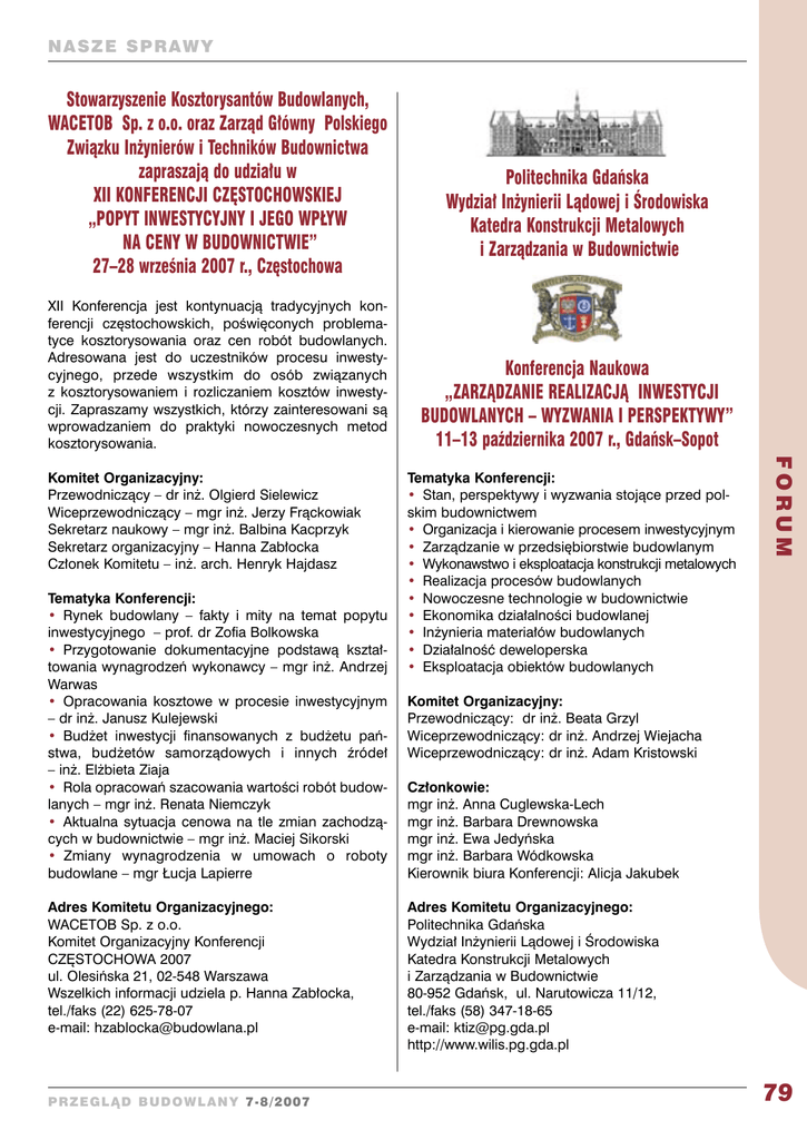 N A S Z E S P R AWY Stowarzyszenie Kosztorysantów Budowlanych, WACETOB Sp. z o.o. oraz Zarząd Główny Polskiego Związku Inżynierów i Techników Budownictwa zapraszają do udziału w XII KONFERENCJI CZĘSTOCHOWSKIEJ „POPYT INWESTYCYJNY I JEGO WPŁYW NA CENY W BUDOWNICTWIE” 27–28 września 2007 r., Częstochowa XII Konferencja jest kontynuacją tradycyjnych konferencji częstochowskich, poświęconych problematyce kosztorysowania oraz cen robót budowlanych. Adresowana jest do uczestników procesu inwestycyjnego, przede wszystkim do osób związanych z kosztorysowaniem i rozliczaniem kosztów inwestycji. Zapraszamy wszystkich, którzy zainteresowani są wprowadzaniem do praktyki nowoczesnych metod kosztorysowania. Tematyka Konferencji: • Rynek budowlany – fakty i mity na temat popytu inwestycyjnego – prof. dr Zofia Bolkowska • Przygotowanie dokumentacyjne podstawą kształtowania wynagrodzeń wykonawcy – mgr inż. Andrzej Warwas • Opracowania kosztowe w procesie inwestycyjnym – dr inż. Janusz Kulejewski • Budżet inwestycji finansowanych z budżetu państwa, budżetów samorządowych i innych źródeł – inż. Elżbieta Ziaja • Rola opracowań szacowania wartości robót budowlanych – mgr inż. Renata Niemczyk • Aktualna sytuacja cenowa na tle zmian zachodzących w budownictwie – mgr inż. Maciej Sikorski • Zmiany wynagrodzenia w umowach o roboty budowlane – mgr Łucja Lapierre Adres Komitetu Organizacyjnego: WACETOB Sp. z o.o. Komitet Organizacyjny Konferencji CZĘSTOCHOWA 2007 ul. Olesińska 21, 02-548 Warszawa Wszelkich informacji udziela p. Hanna Zabłocka, tel./faks (22) 625-78-07 e-mail: [email protected] PRZEG L Ą D B U D O W L A N Y 7-8/2007 Konferencja Naukowa „ZARZĄDZANIE REALIZACJĄ INWESTYCJI BUDOWLANYCH – WYZWANIA I PERSPEKTYWY” 11–13 października 2007 r., Gdańsk–Sopot Tematyka Konferencji: • Stan, perspektywy i wyzwania stojące przed polskim budownictwem • Organizacja i kierowanie procesem inwestycyjnym • Zarządzanie w przedsiębiorstwie budowlanym • Wykonawstwo i eksploatacja konstrukcji metalowych • Realizacja procesów budowlanych • Nowoczesne technologie w budownictwie • Ekonomika działalności budowlanej • Inżynieria materiałów budowlanych • Działalność deweloperska • Eksploatacja obiektów budowlanych FORUM Komitet Organizacyjny: Przewodniczący – dr inż. Olgierd Sielewicz Wiceprzewodniczący – mgr inż. Jerzy Frąckowiak Sekretarz naukowy – mgr inż. Balbina Kacprzyk Sekretarz organizacyjny – Hanna Zabłocka Członek Komitetu – inż. arch. Henryk Hajdasz Politechnika Gdańska Wydział Inżynierii Lądowej i Środowiska Katedra Konstrukcji Metalowych i Zarządzania w Budownictwie Komitet Organizacyjny: Przewodniczący: dr inż. Beata Grzyl Wiceprzewodniczący: dr inż. Andrzej Wiejacha Wiceprzewodniczący: dr inż. Adam Kristowski Członkowie: mgr inż. Anna Cuglewska-Lech mgr inż. Barbara Drewnowska mgr inż. Ewa Jedyńska mgr inż. Barbara Wódkowska Kierownik biura Konferencji: Alicja Jakubek Adres Komitetu Organizacyjnego: Politechnika Gdańska Wydział Inżynierii Lądowej i Środowiska Katedra Konstrukcji Metalowych i Zarządzania w Budownictwie 80-952 Gdańsk, ul. Narutowicza 11/12, tel./faks (58) 347-18-65 e-mail: [email protected] http://www.wilis.pg.gda.pl 79